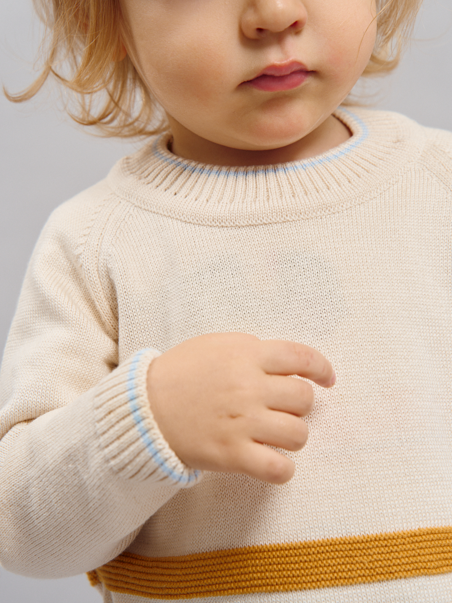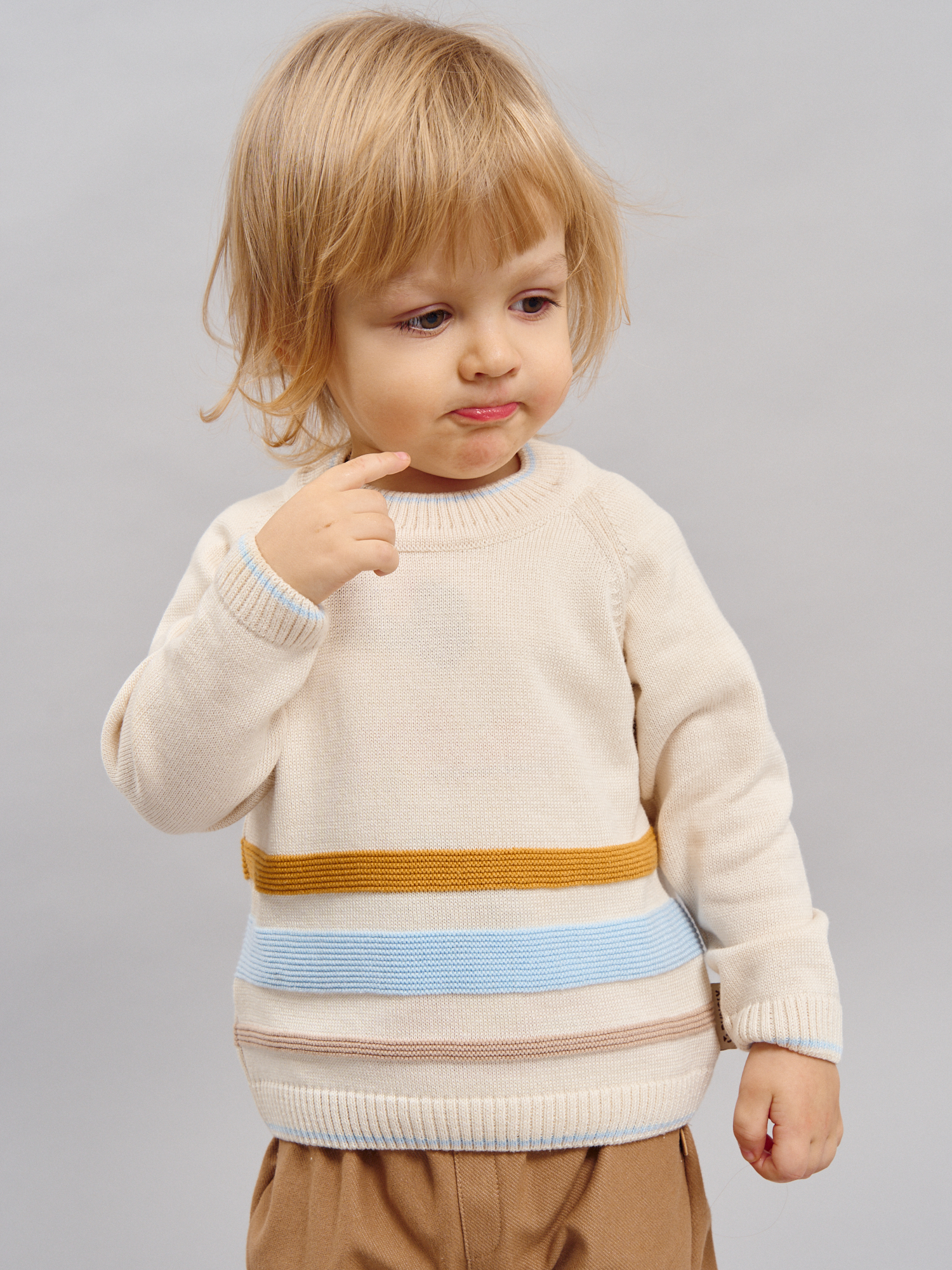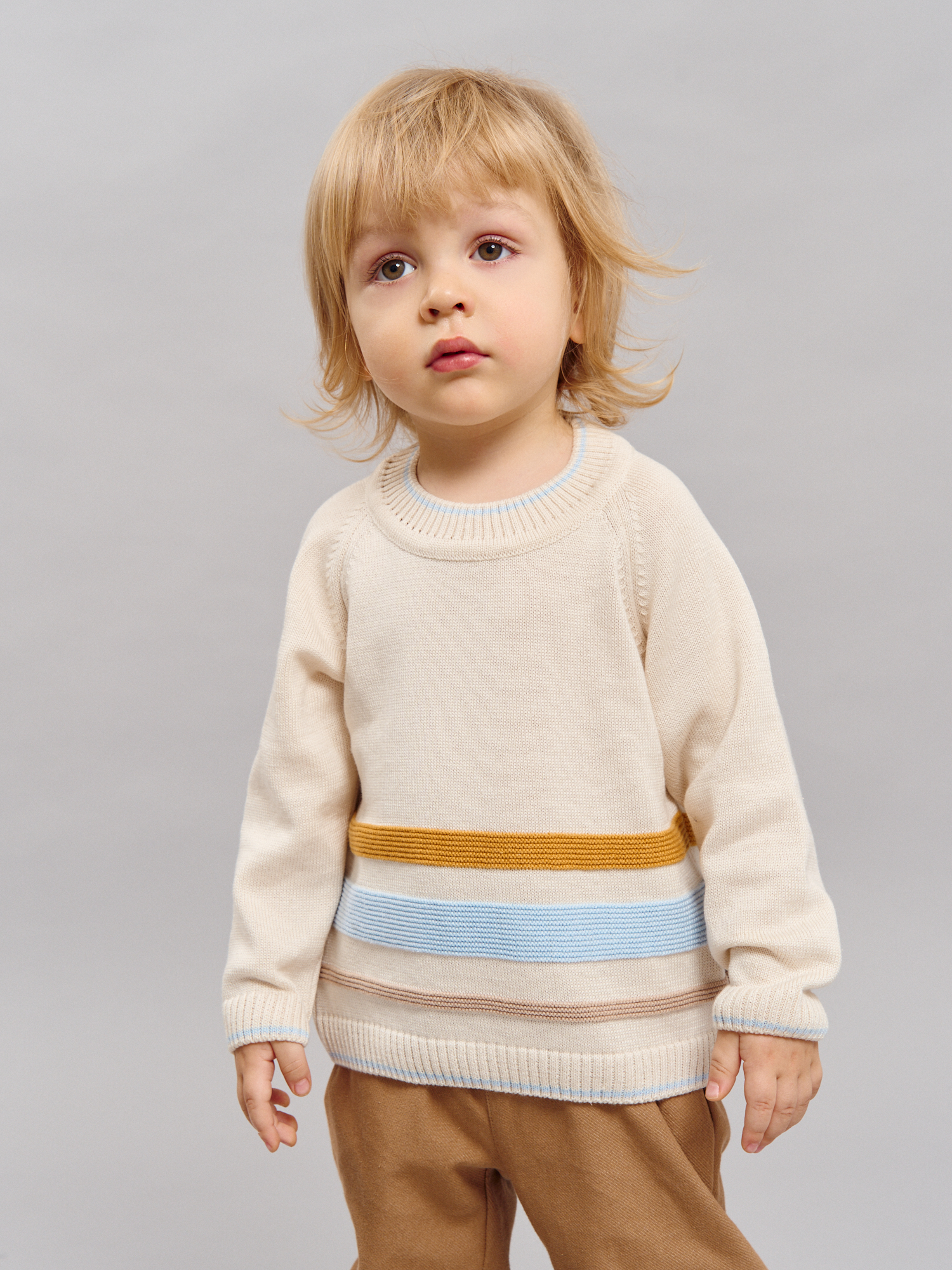 Вязаный джемпер с акцентными полосками — уютная и практичная вещь для прогулок, красивых фотосессий и уюта.