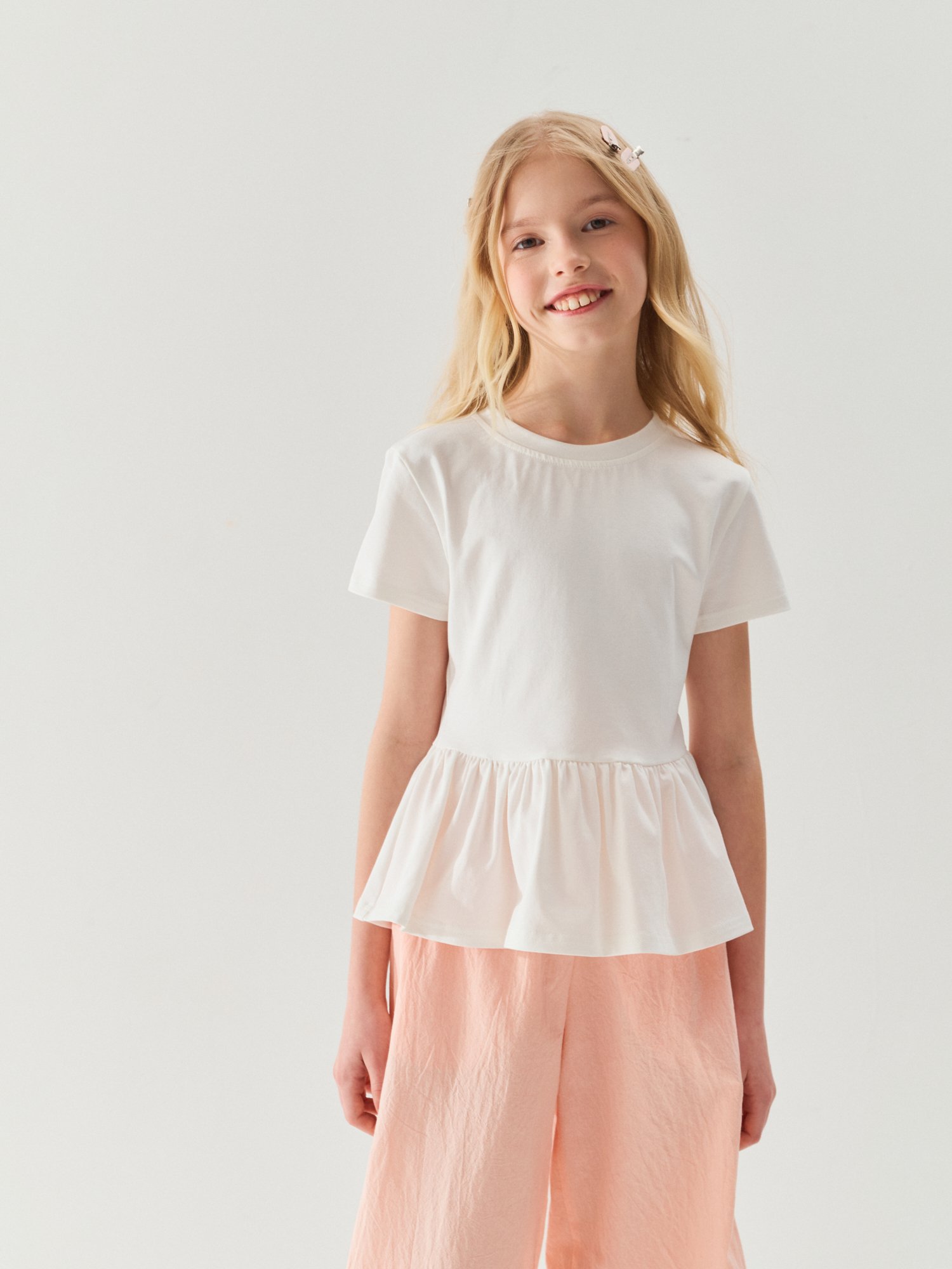 Облегающая футболка с воздушной баской сделает образ романтичным.