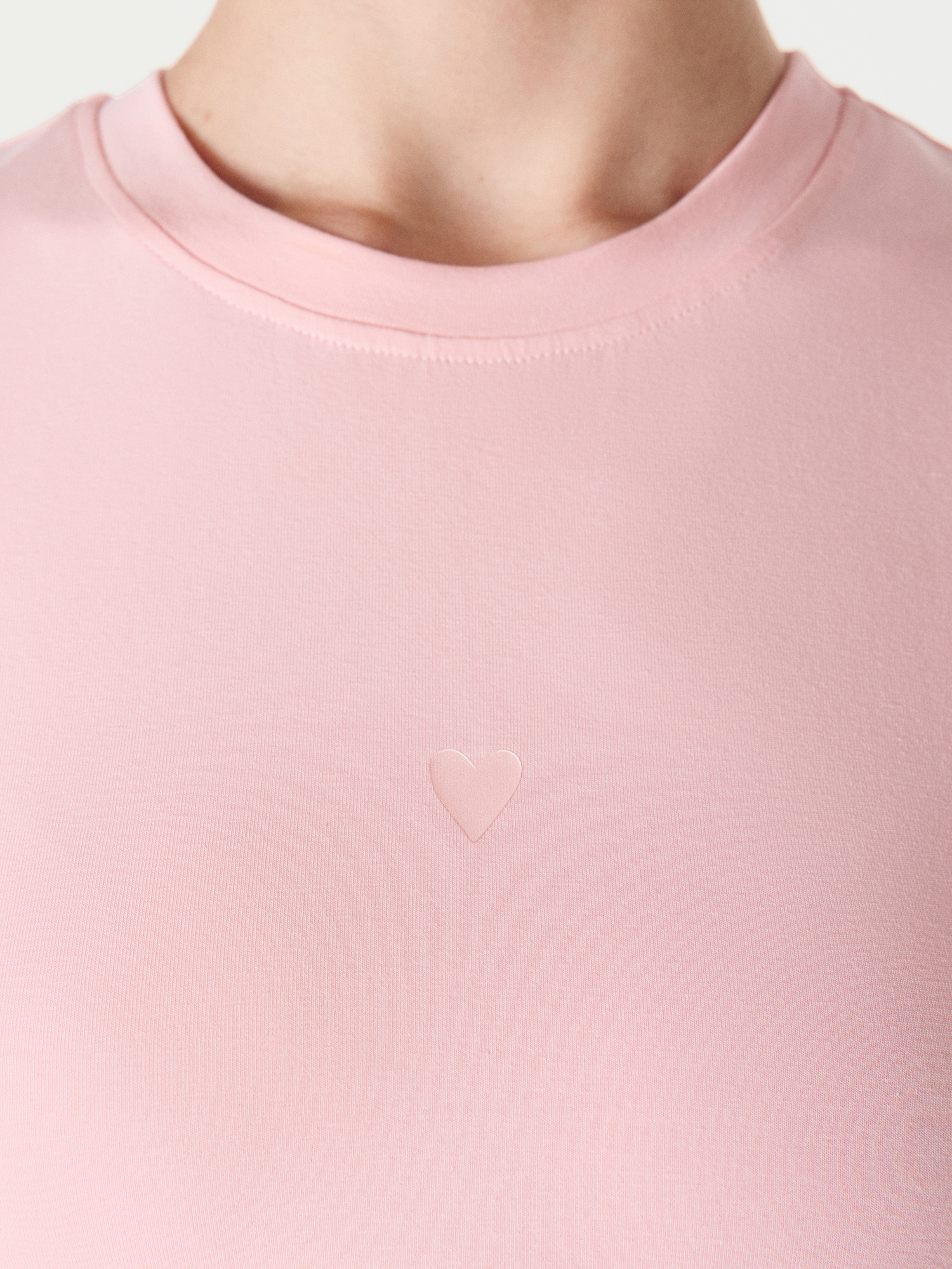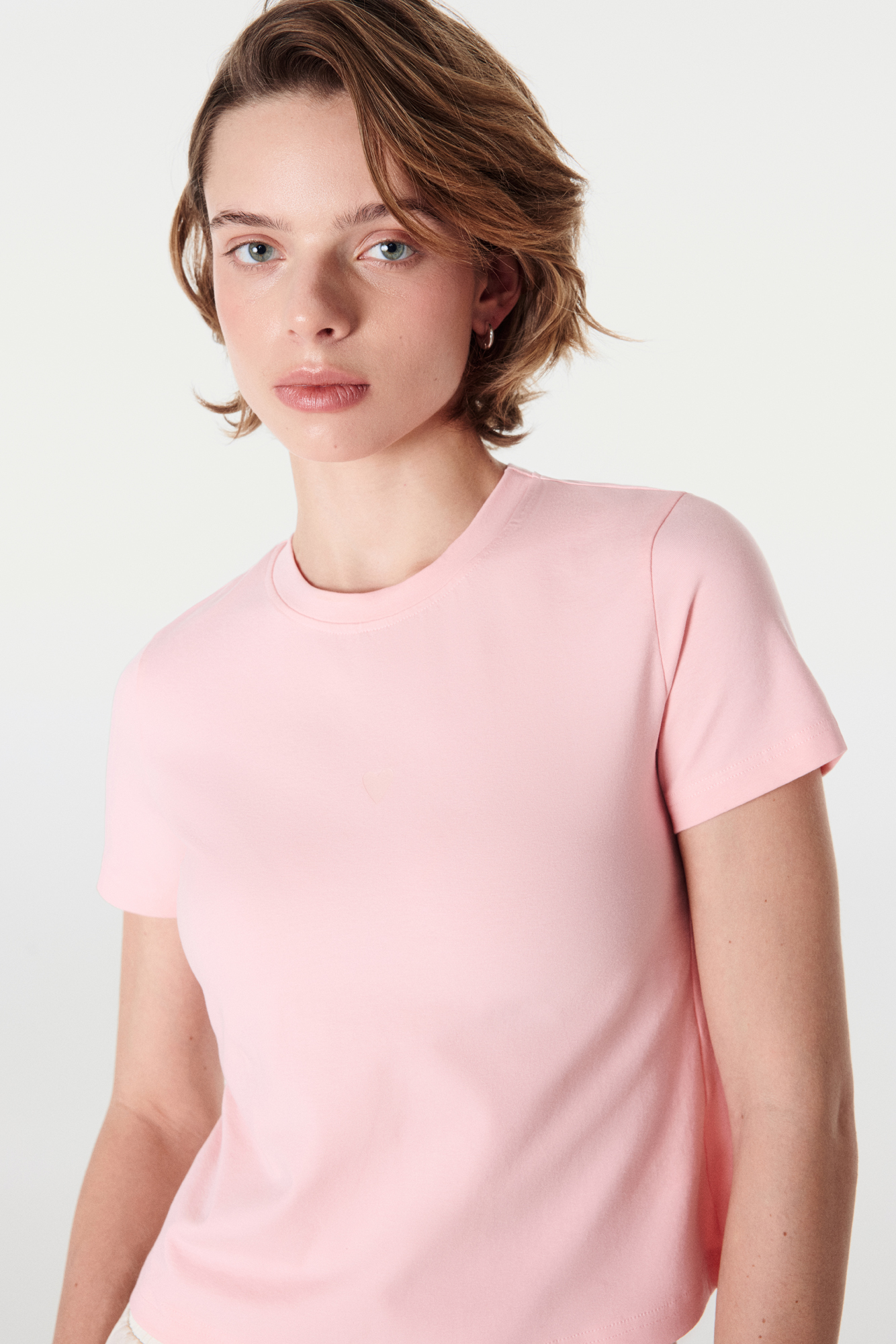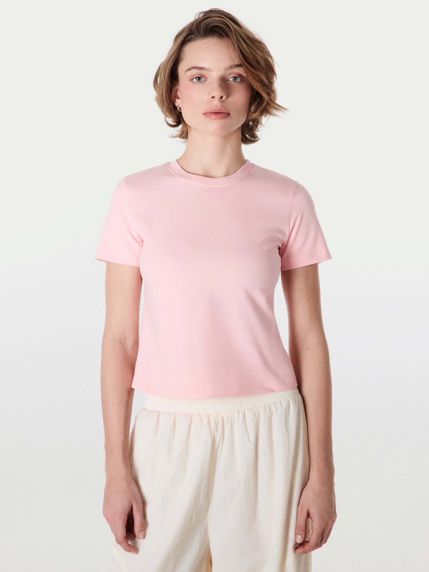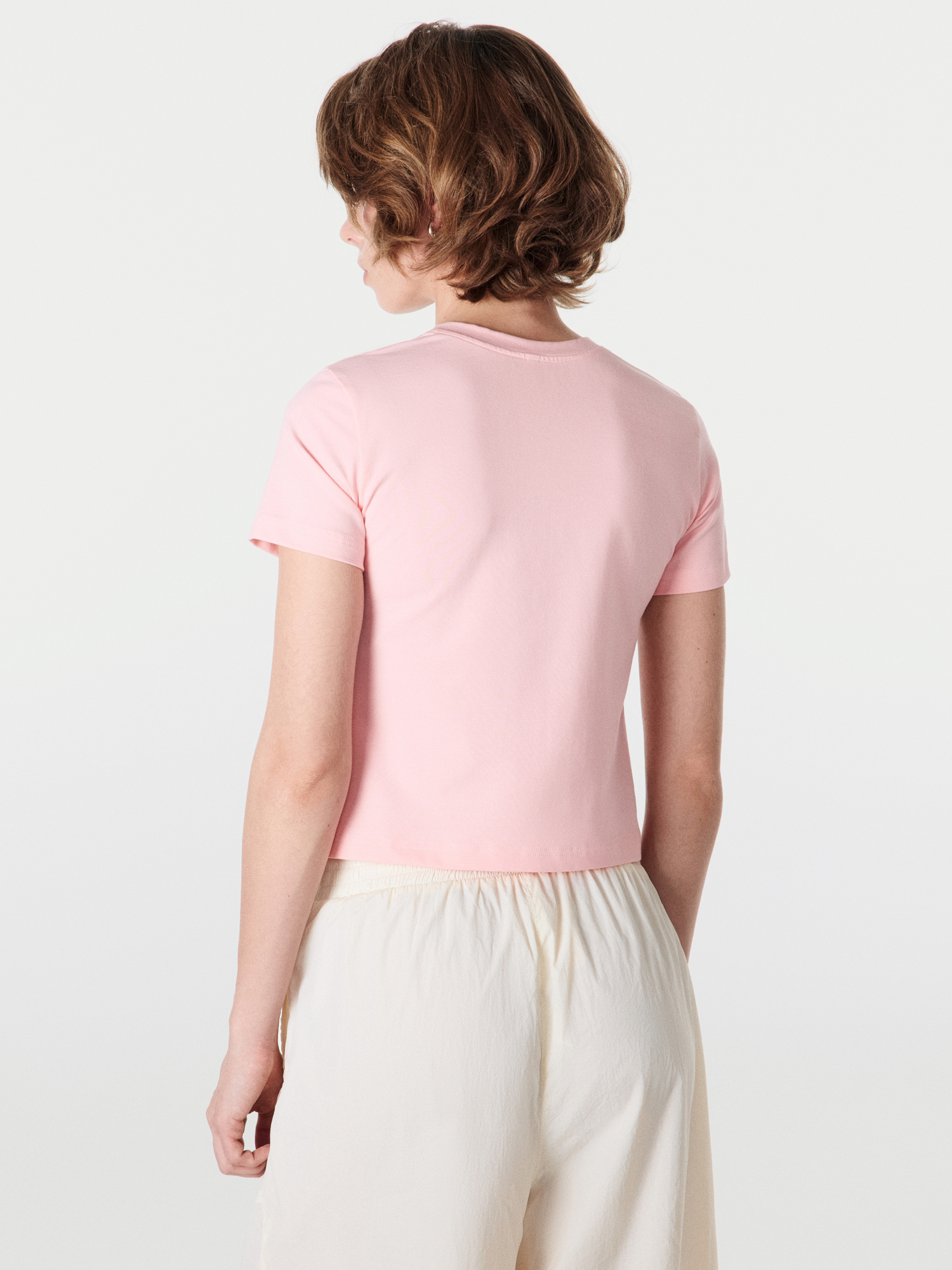 Компактный силуэт позволяет сочетать футболку с высокой и средней посадкой низов.