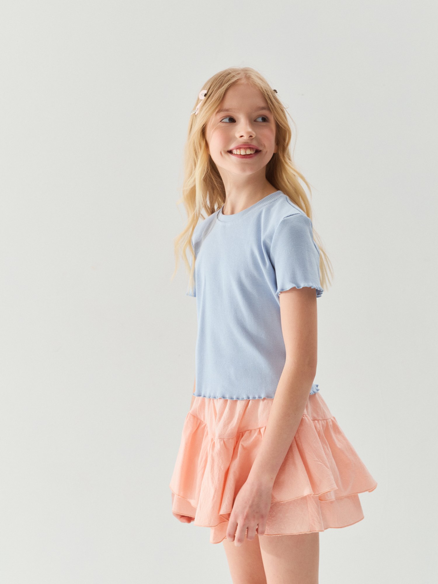 Укороченная футболка с кудрявыми рукавами и низом добавит сдержанного очарования в образ.