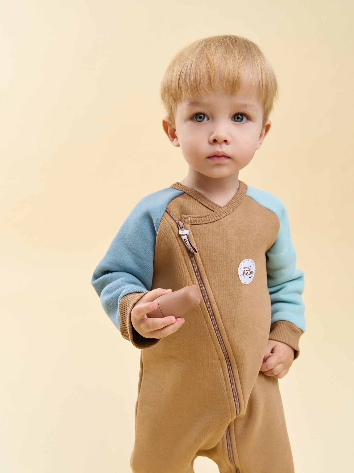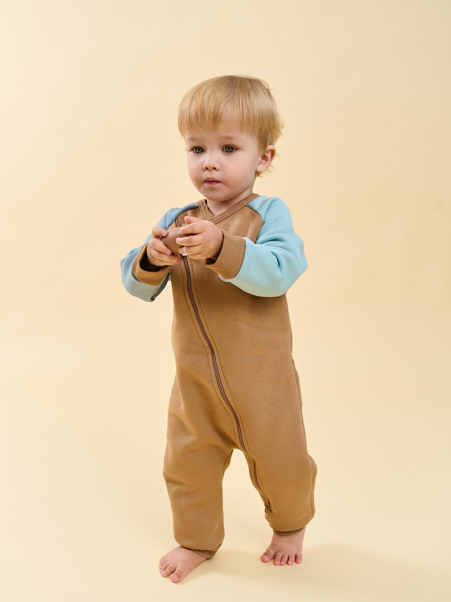 Смещенная молния, уходящая в правое плечо и левую ножку, облегчает переодевание — быстро и удобно сменить одежду после прогулки или перед сном.