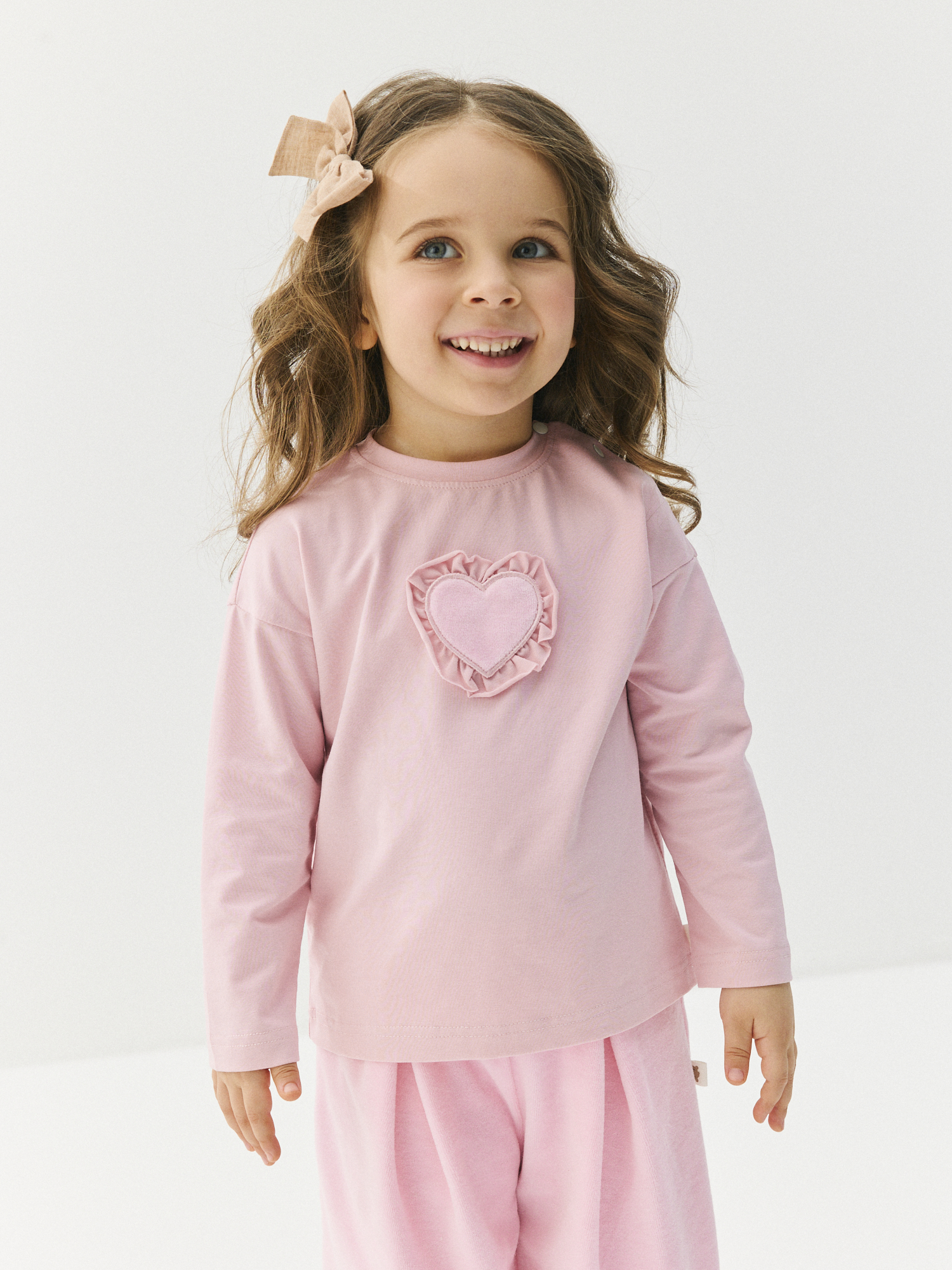 Комфортный лонгслив с объемным сердечком понравится романтичным девочкам.