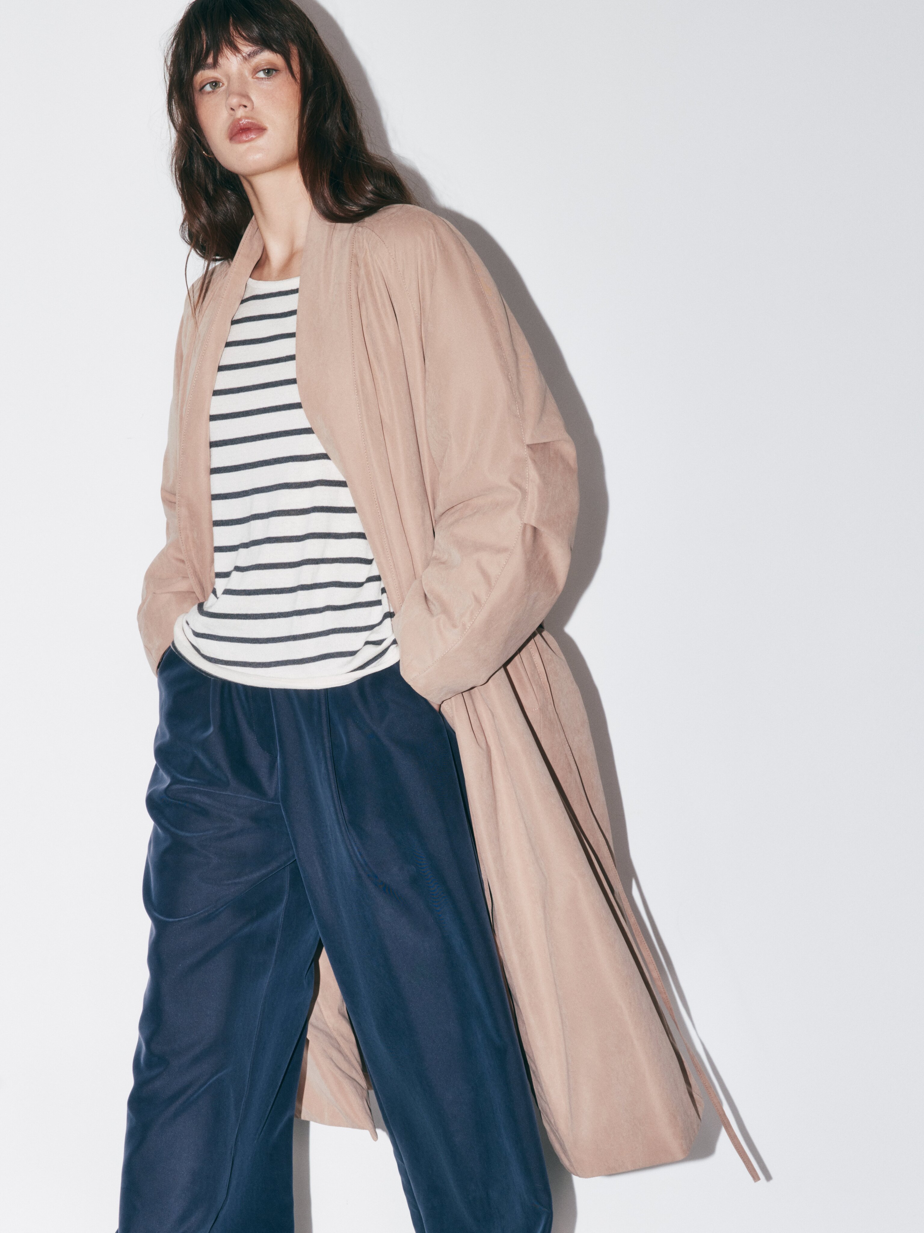 Демисезонное пальто на запах свободного кроя, сочетающее лаконичный японский силуэт и современные технологии защиты от непогоды.