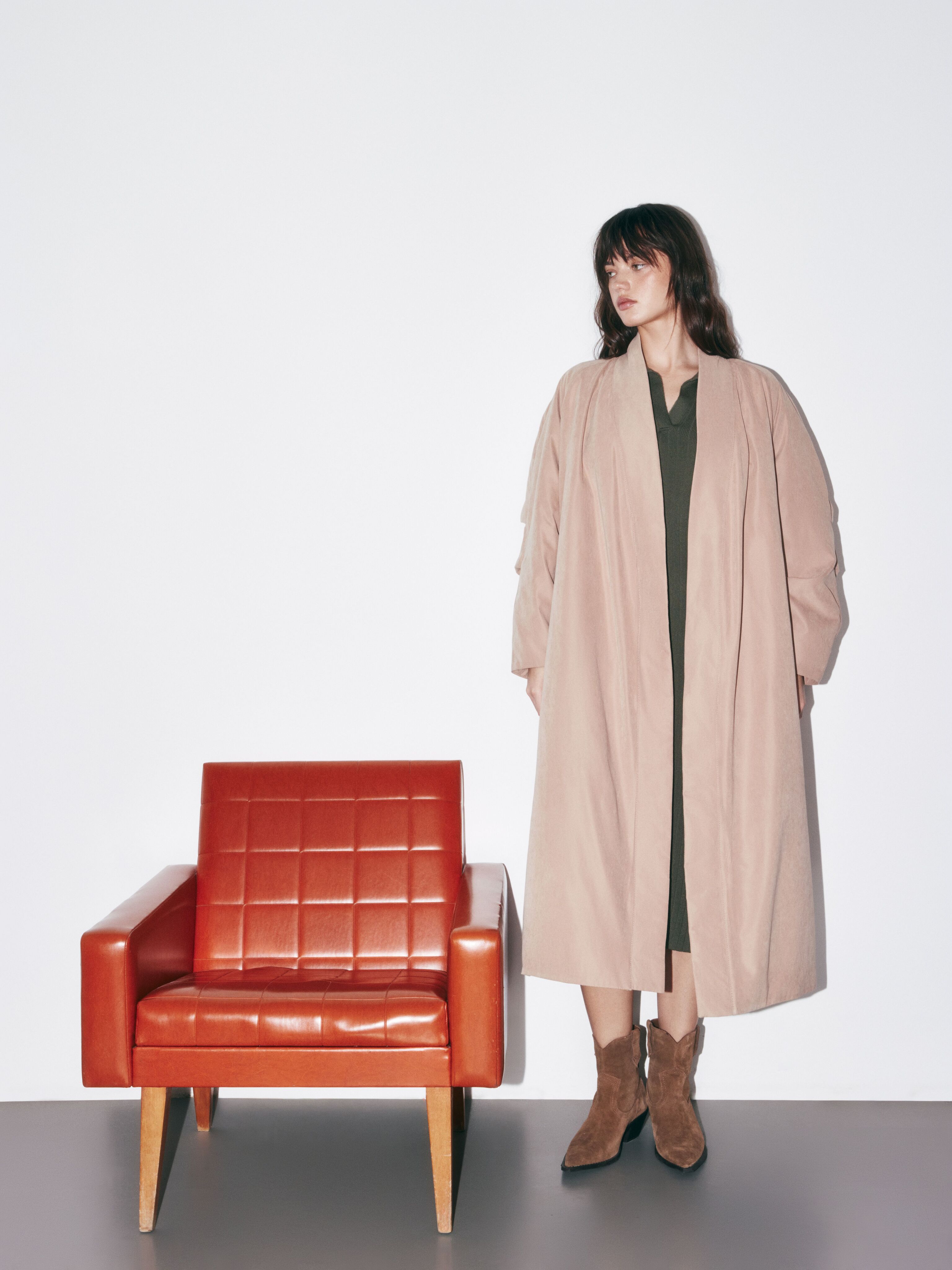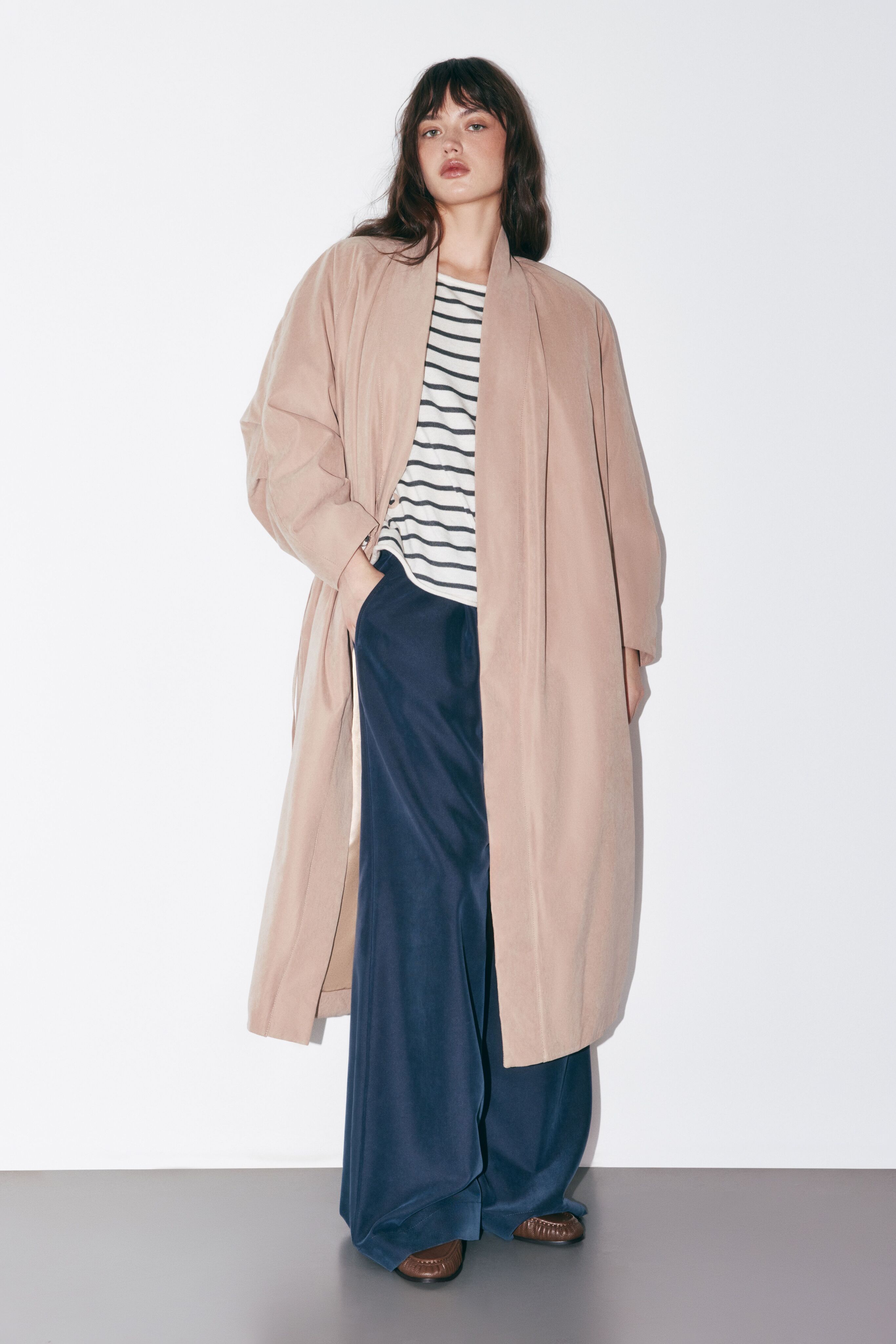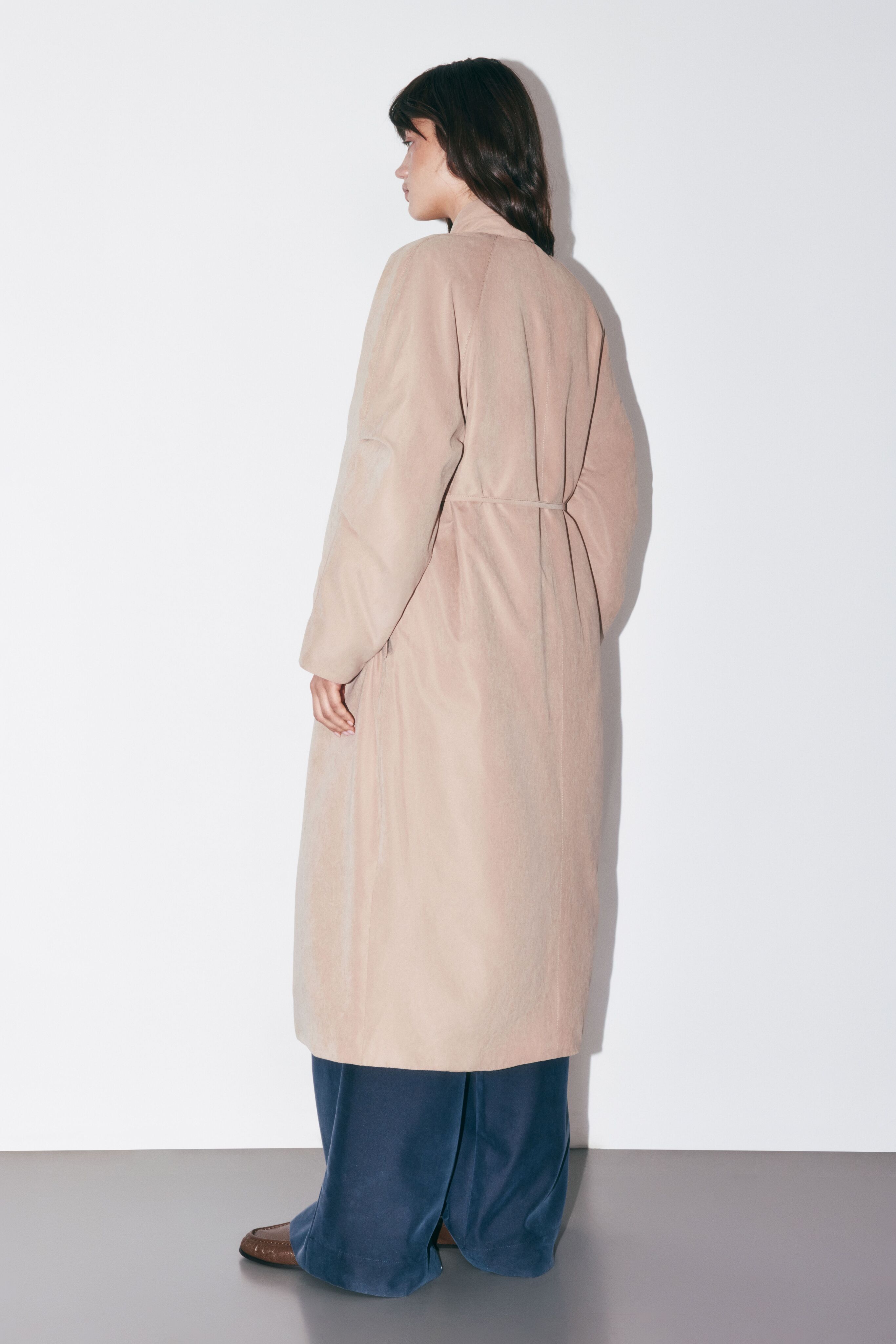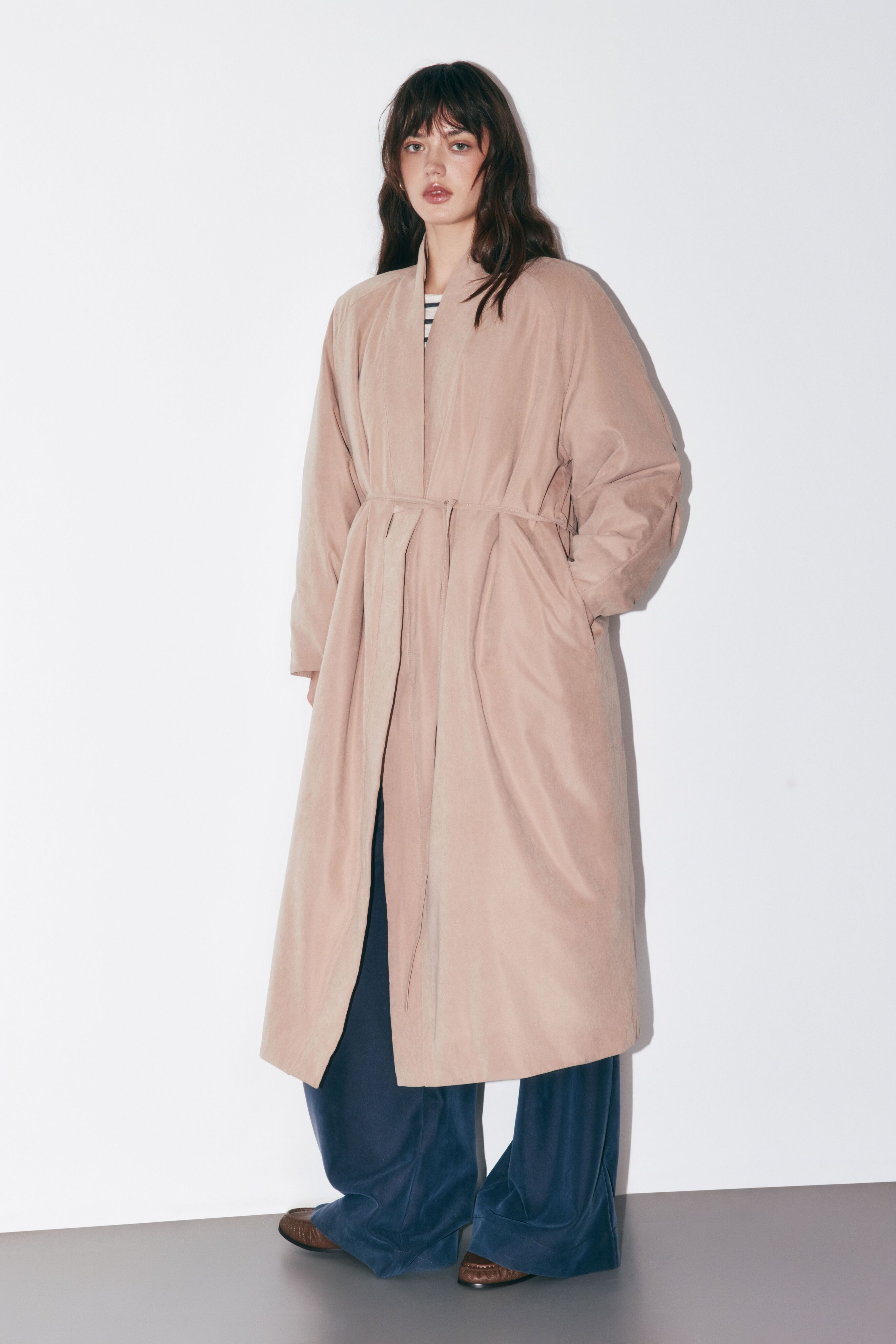 Пальто фиксируется тонким поясом, что позволяет идеально адаптировать посадку под любой многослойный образ и фигуру.