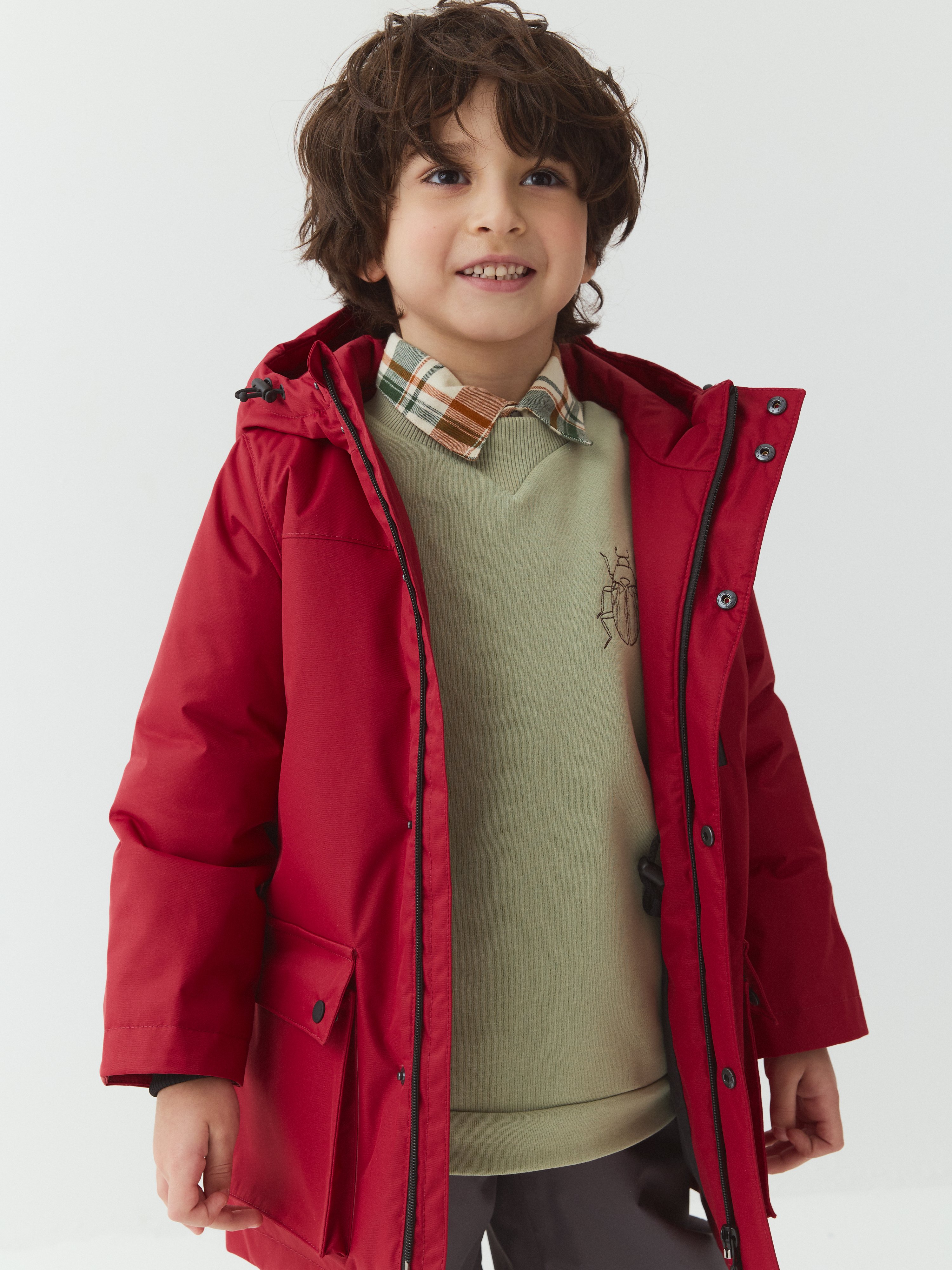 Вместительные карманы-портфели с клапанами на кнопках и один прорезной карман на молнии в верхней части парки.