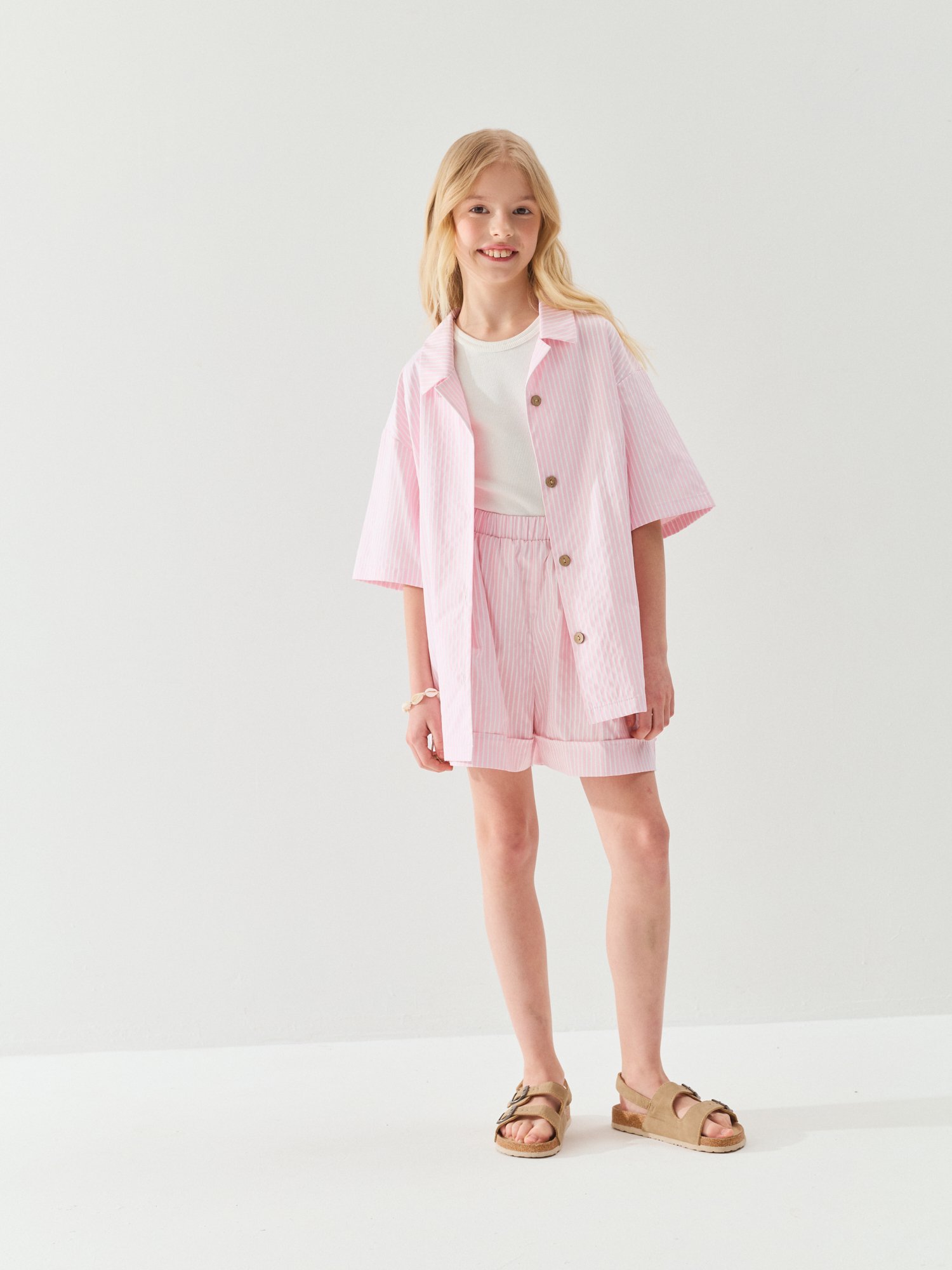 Сочетается с шортами, джинсами, юбками. Под низ можно надеть футболку, топ или майку.
