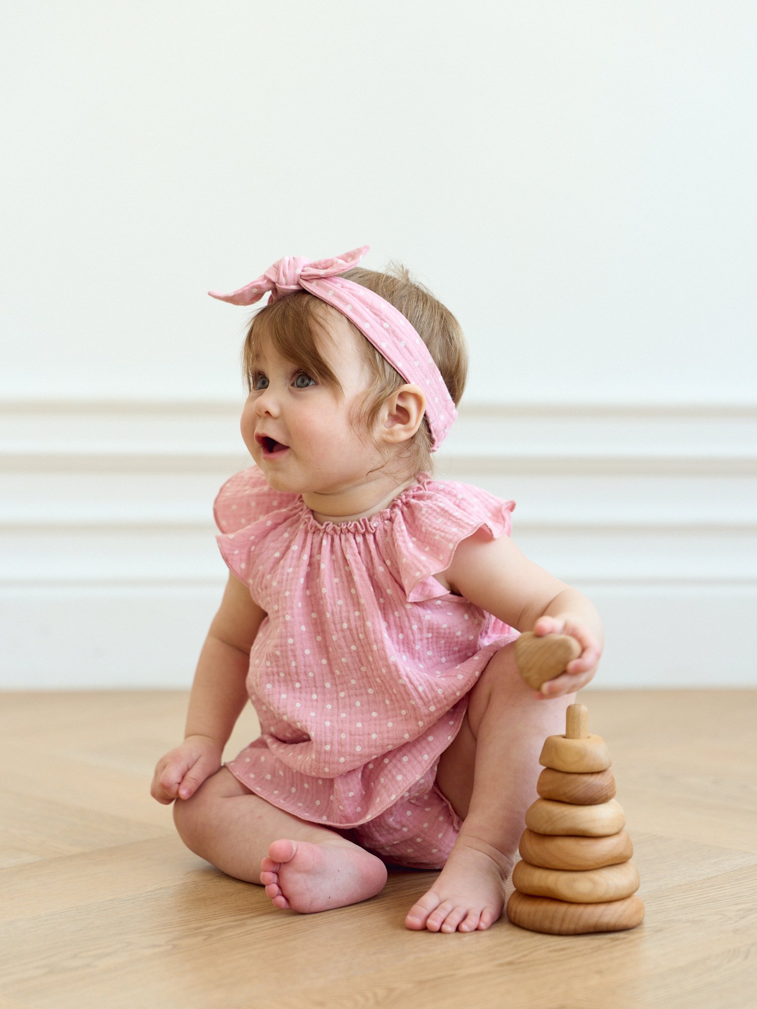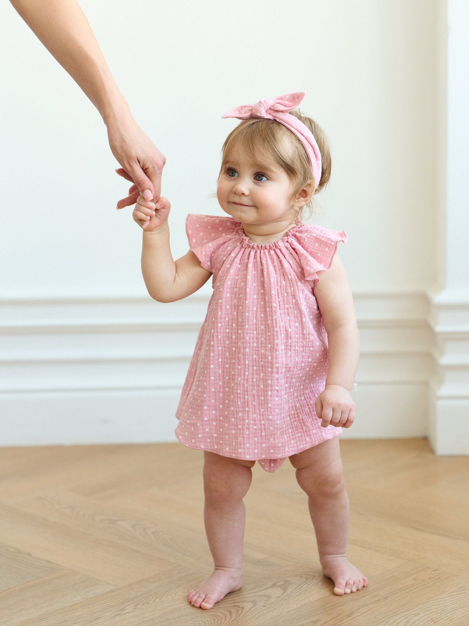Платье дополнено блумерами, которые спрячут подгузник и создадут единый образ.