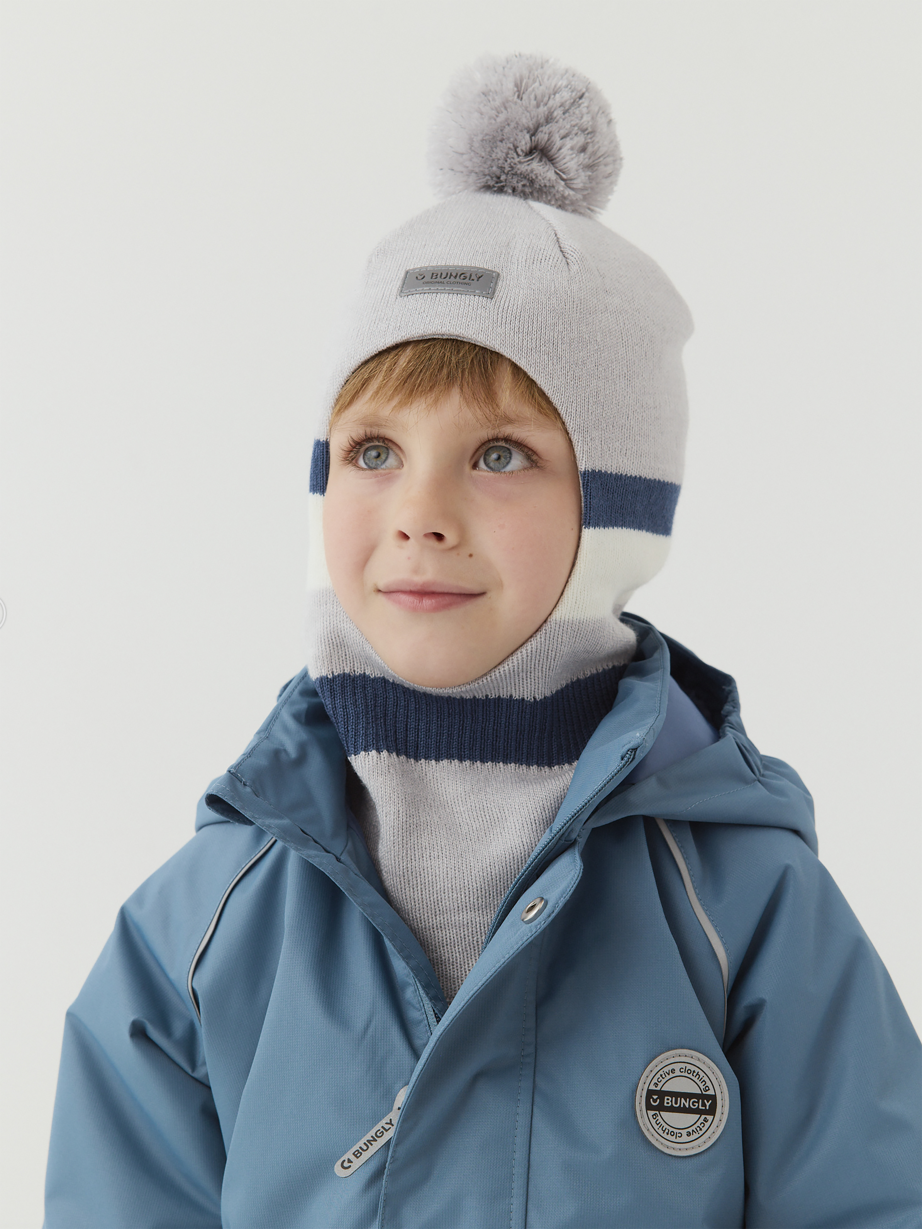 Верх - 70% акрил, 30% шерсть; ветрозащитная планка - 100% полиэстер; подкладка - 95% хлопок, 5% лайкра