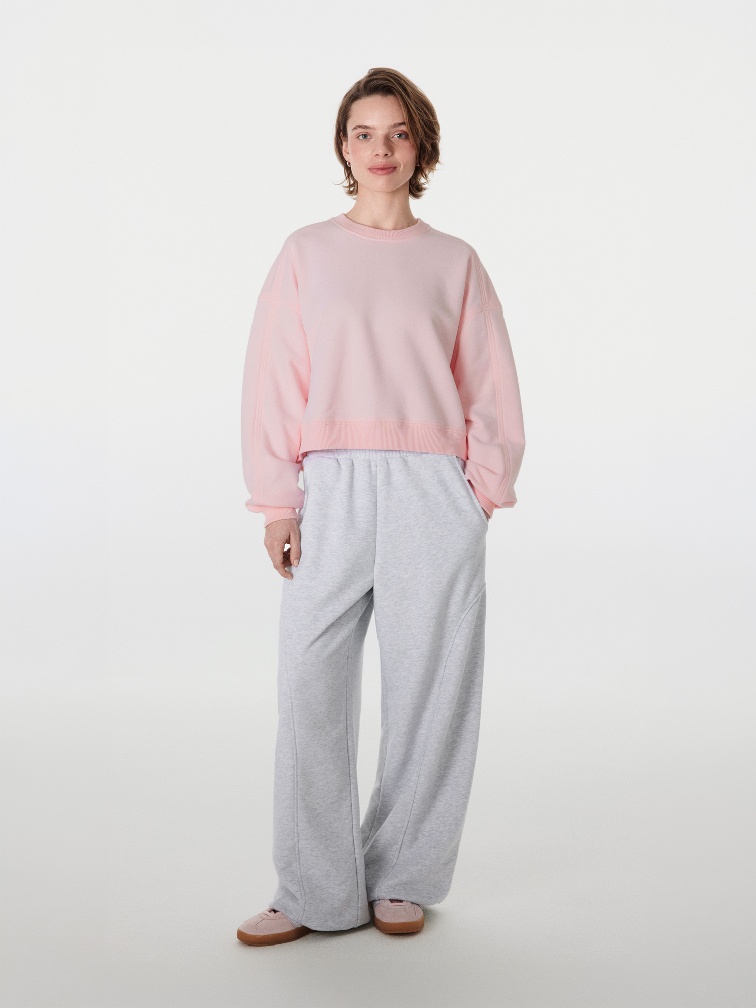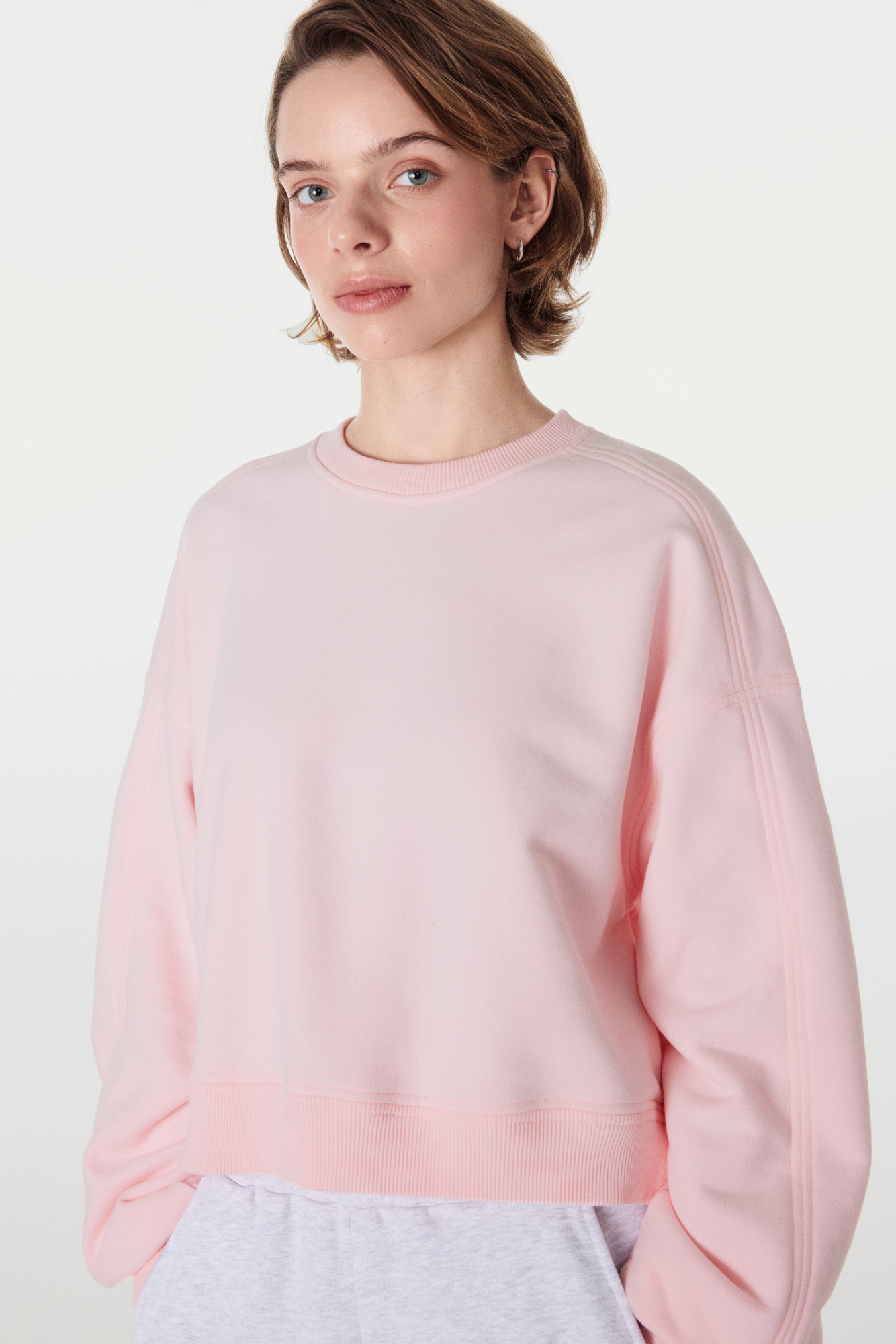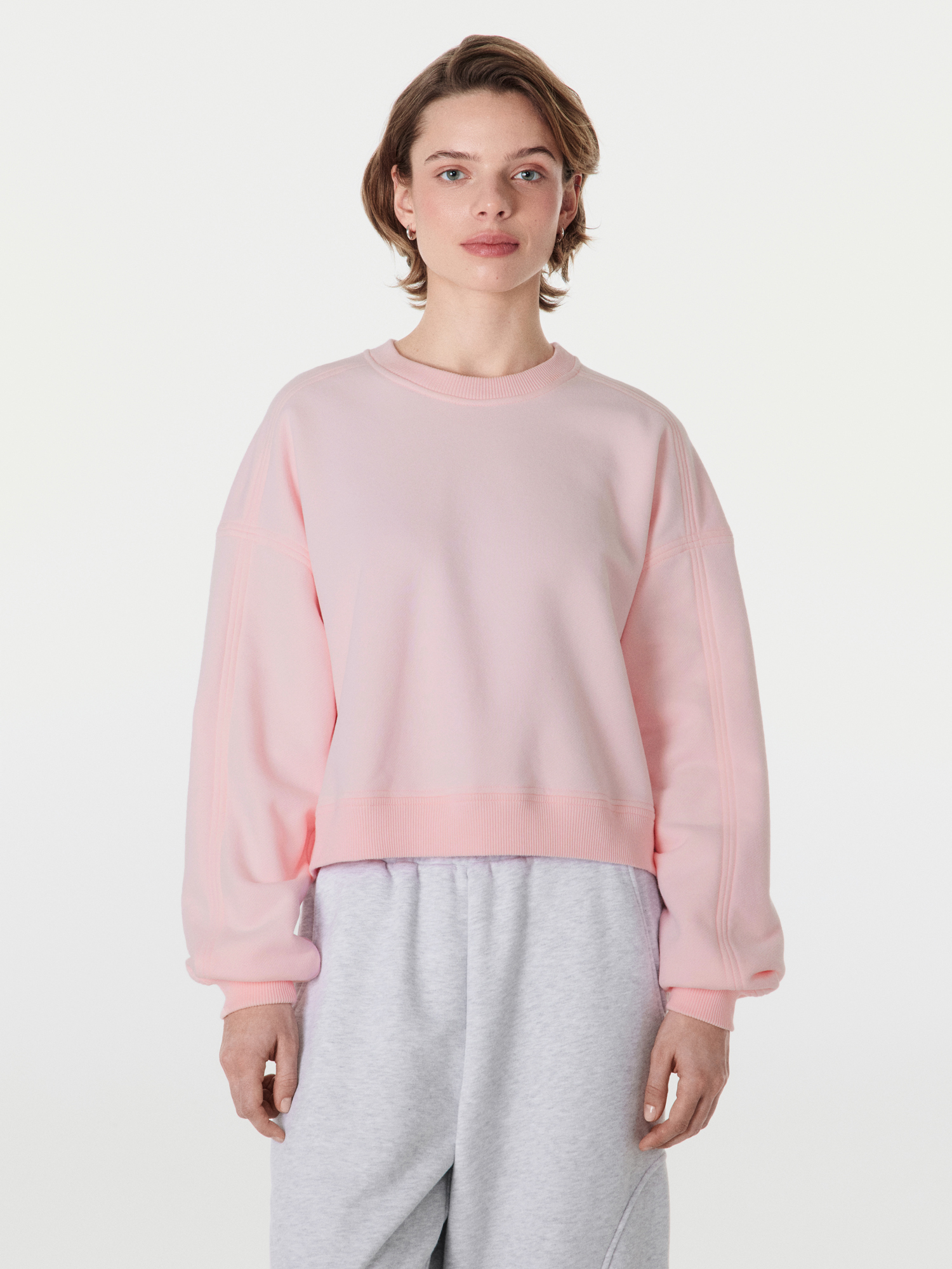 Укороченный свитшот среднего объема дополнит любой образ: спортивный, домашний, расслабленный деловой.