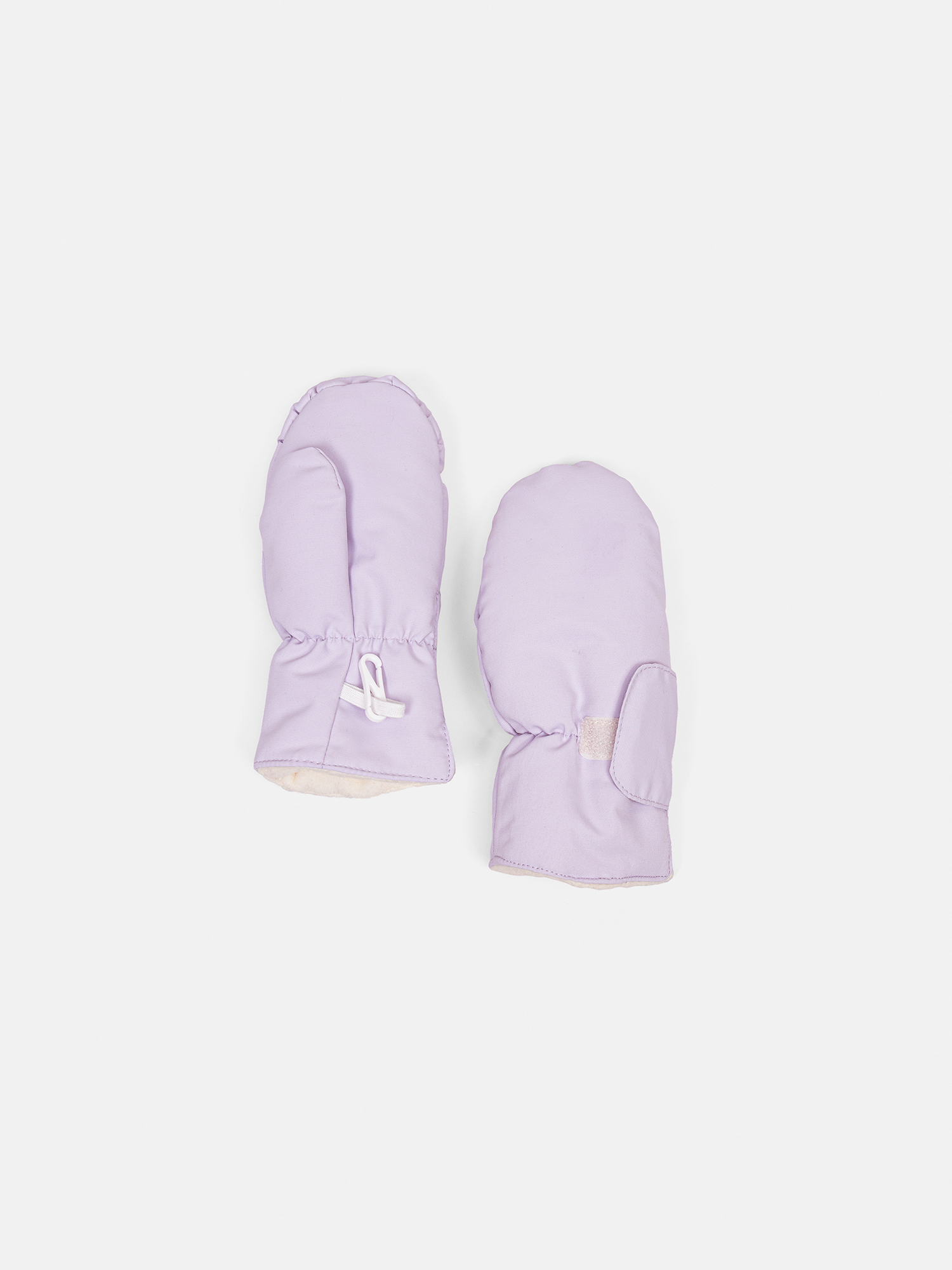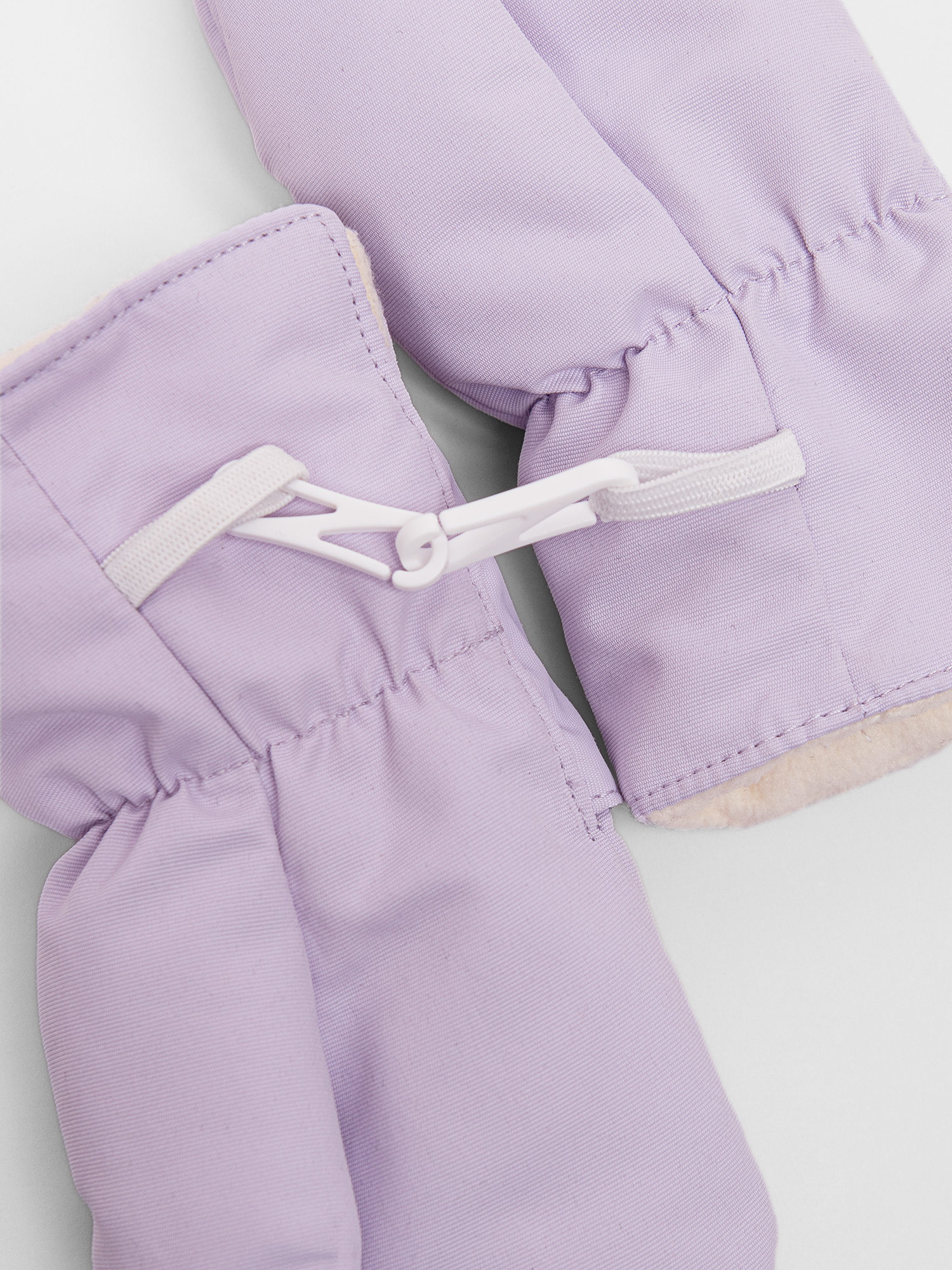 Варежки можно пристегнуть к куртке или комбинезону с помощью маленького карабина на эластичной тесьме.