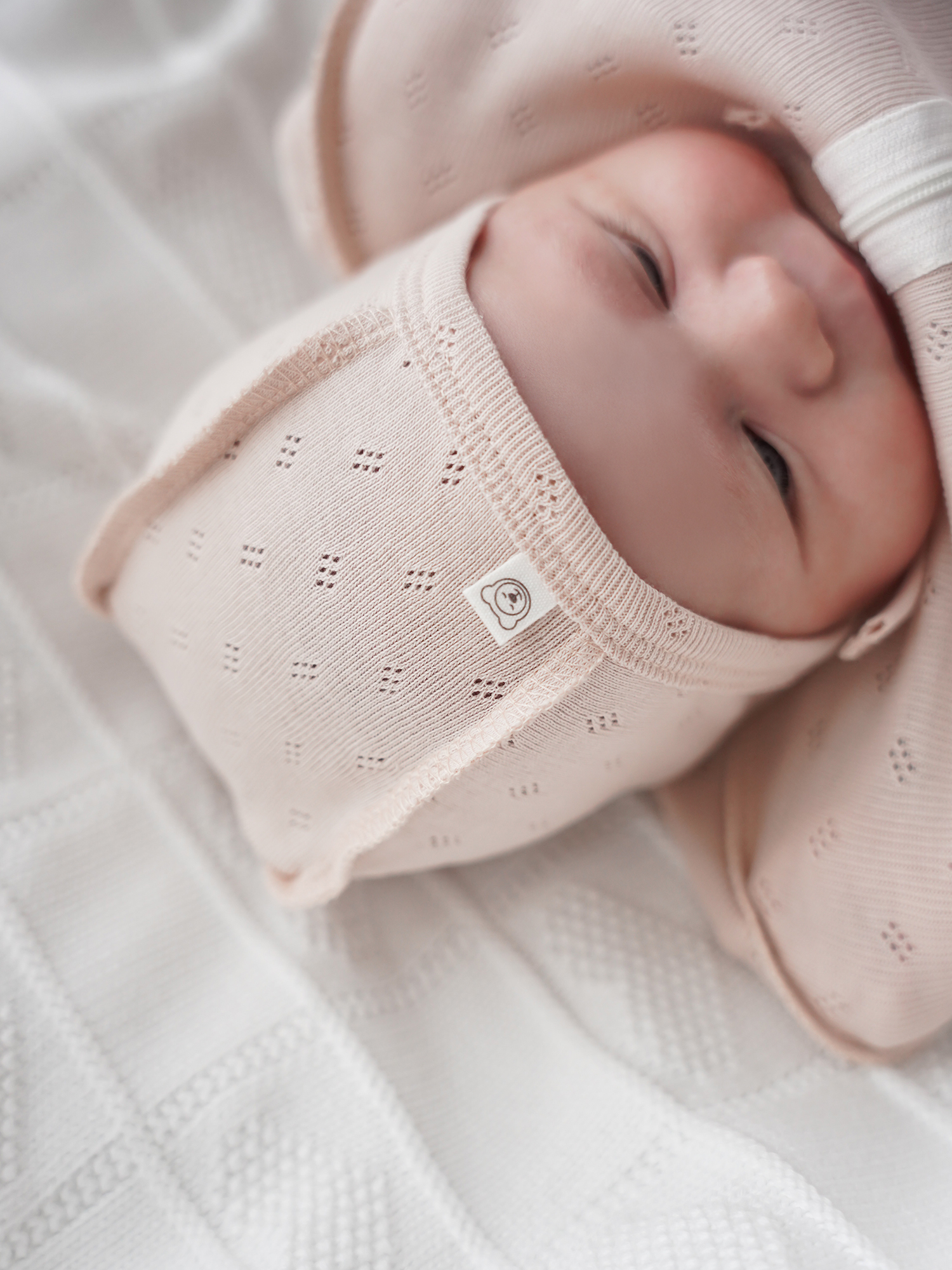 Подходит для прогулок, сна и дома — чепчик мягко защищает голову малыша и отлично сочетается с любыми боди и слипами из ажурной капсулы.