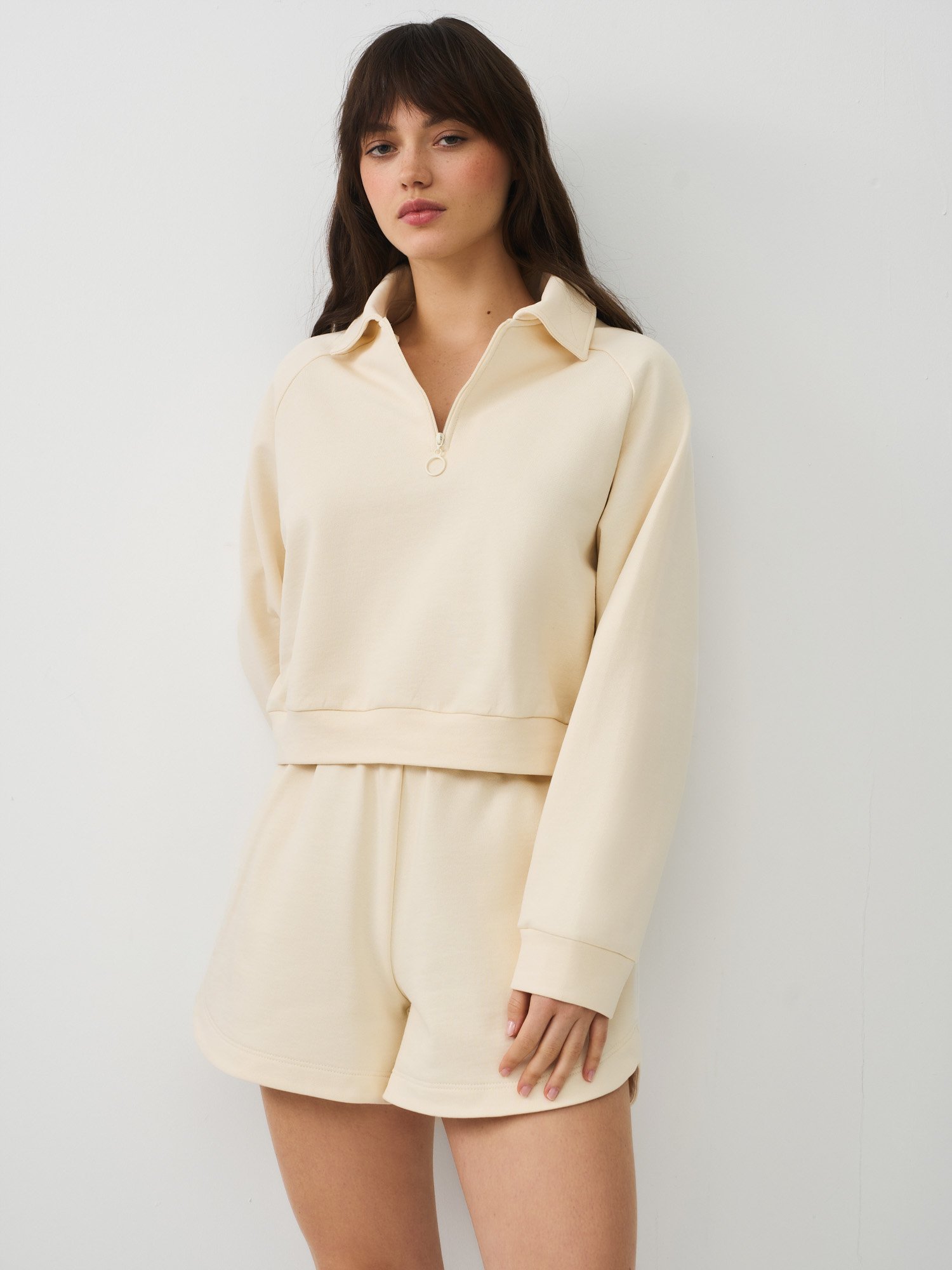 Главный акцент модели — фигурный срез низа: он не только визуально удлиняет ноги, но и делает спортивный образ более утонченным и динамичным.