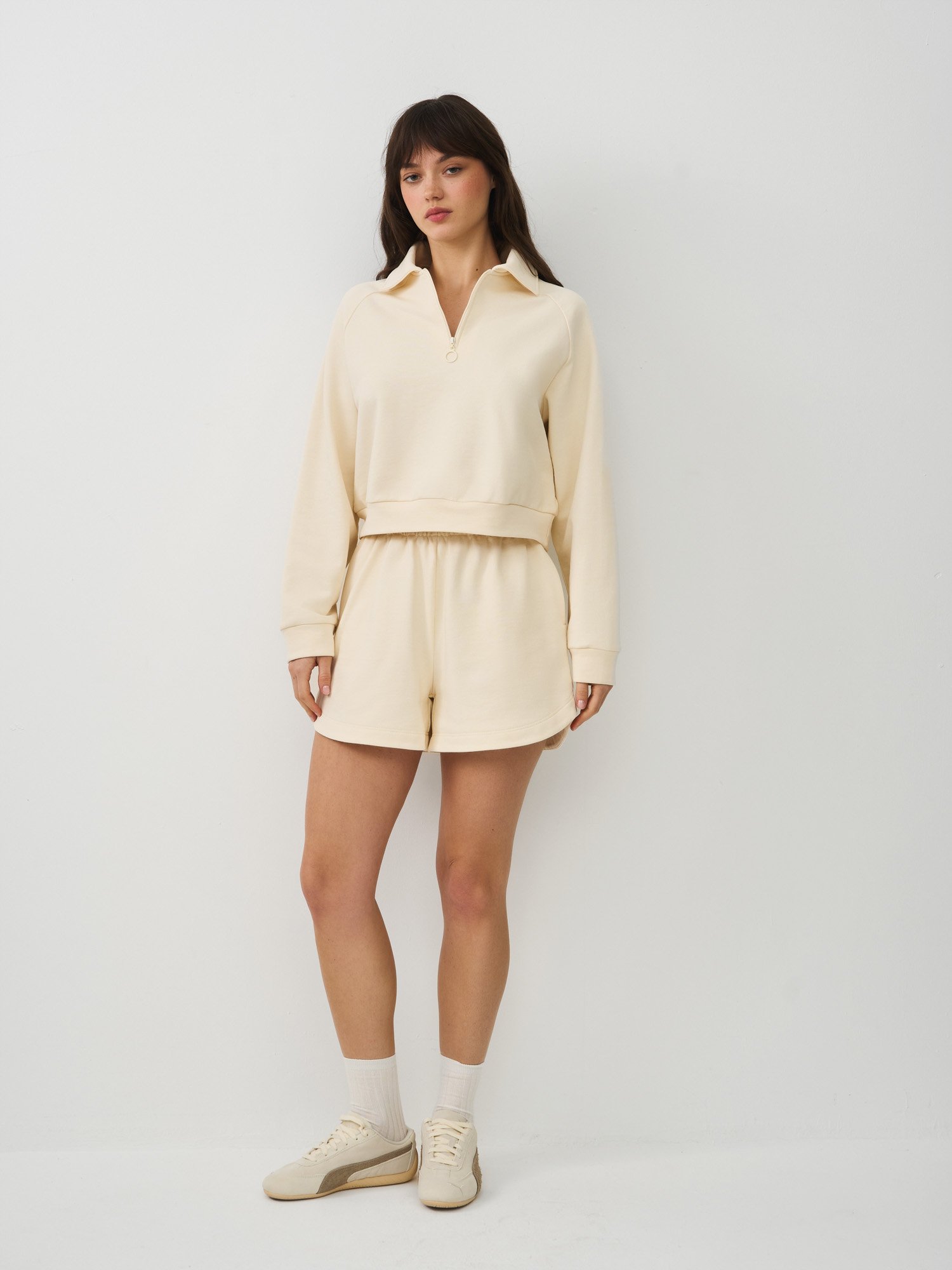 Цельнокроеный эластичный пояс мягко фиксирует шорты на талии, обеспечивая идеальную посадку по фигуре.