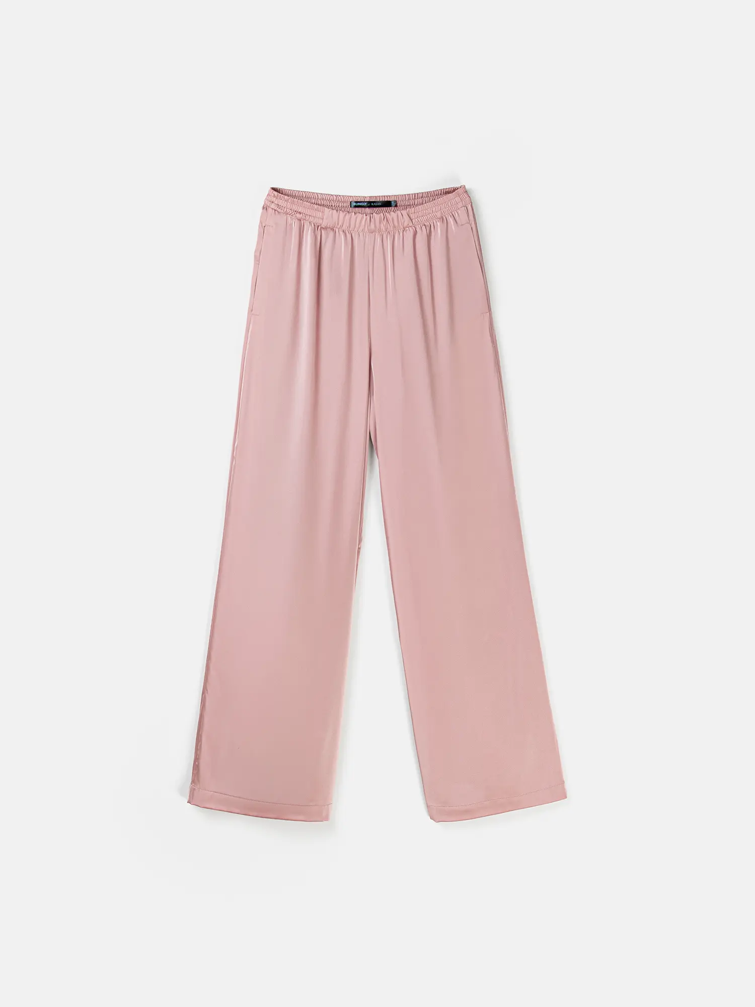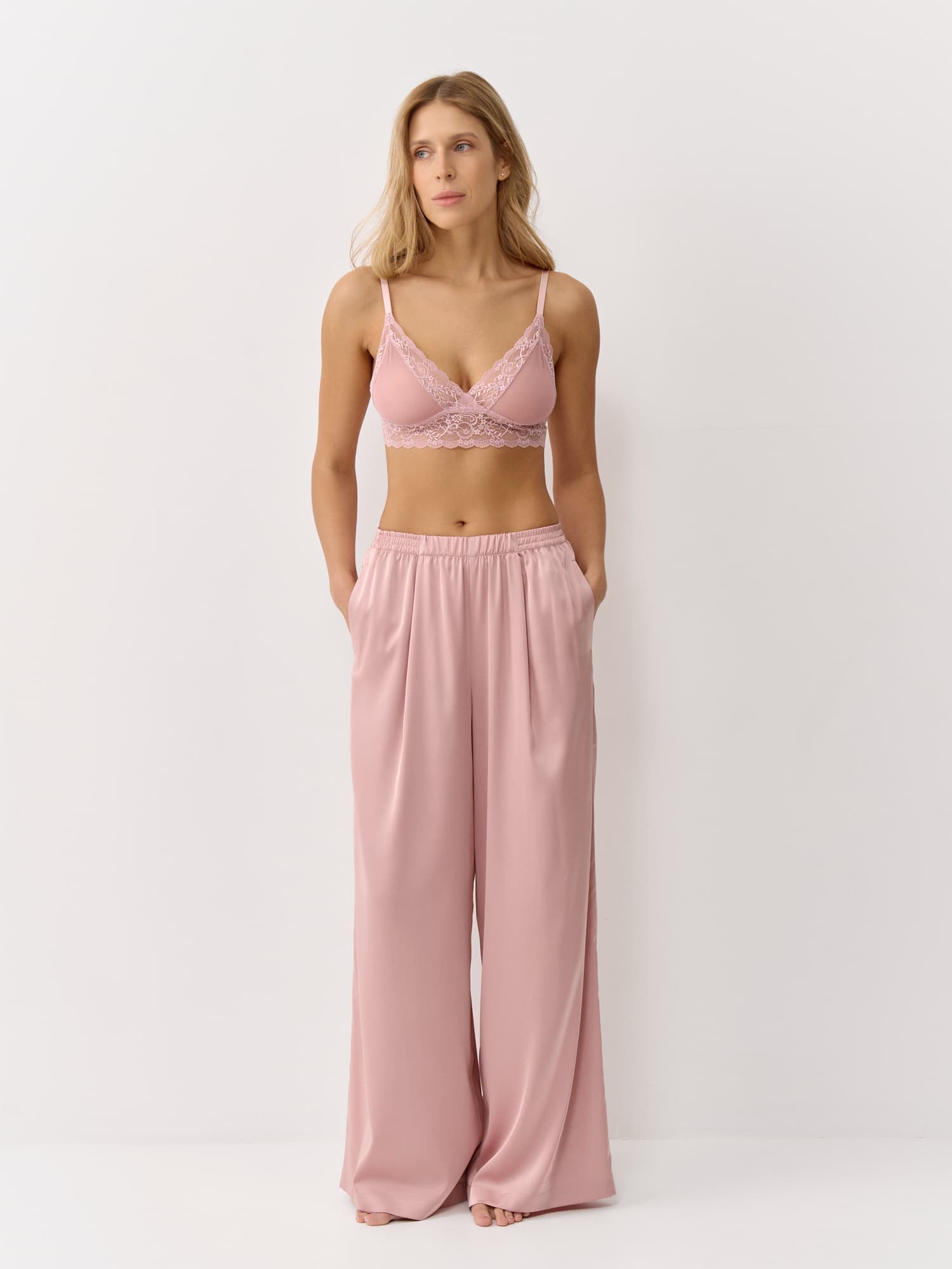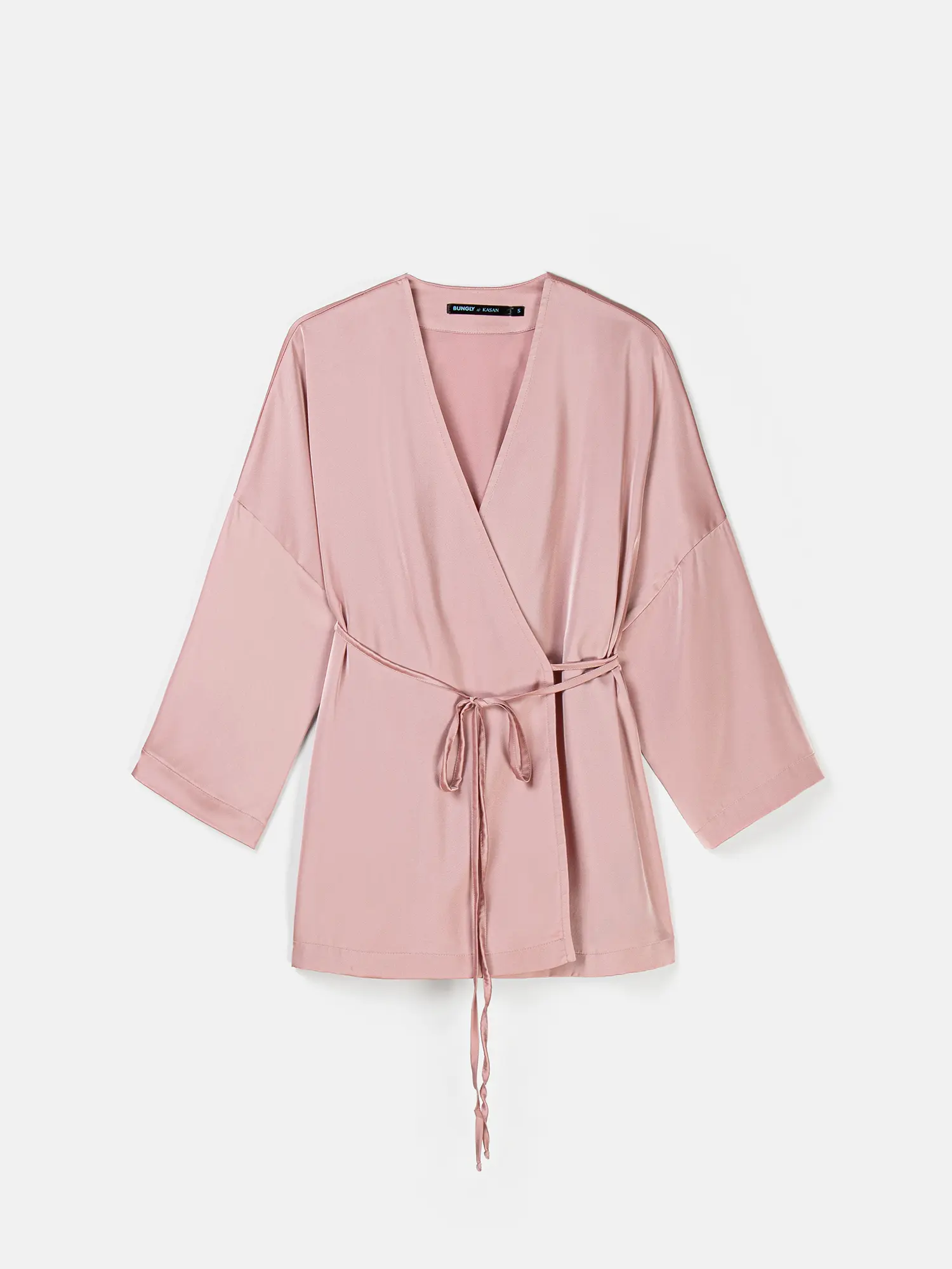 Комплект в пижамном стиле состоит из кимоно и просторных штанов. У кимоно свободный крой с завязкой на пояс, регулируется до комфортного обхвата. Широкие рукава также не стесняют движений. Штаны с мягкой эластичной резинкой по поясу и удобными боковыми карманами. Комплект можно носить не только дома, трендовый пижамный стиль уместен и в отпуске, и на прогулке в теплый сезон. Гладкая шелковая фактура всегда приятна к телу.