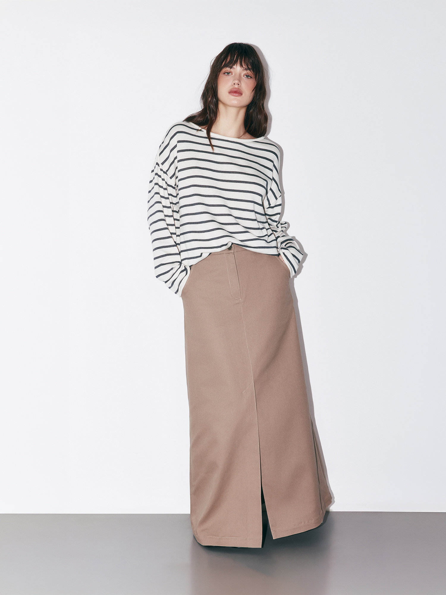 Очень классный джемпер свободного кроя, мягкий, уютный. Люблю полоску. На 44 взяла S.