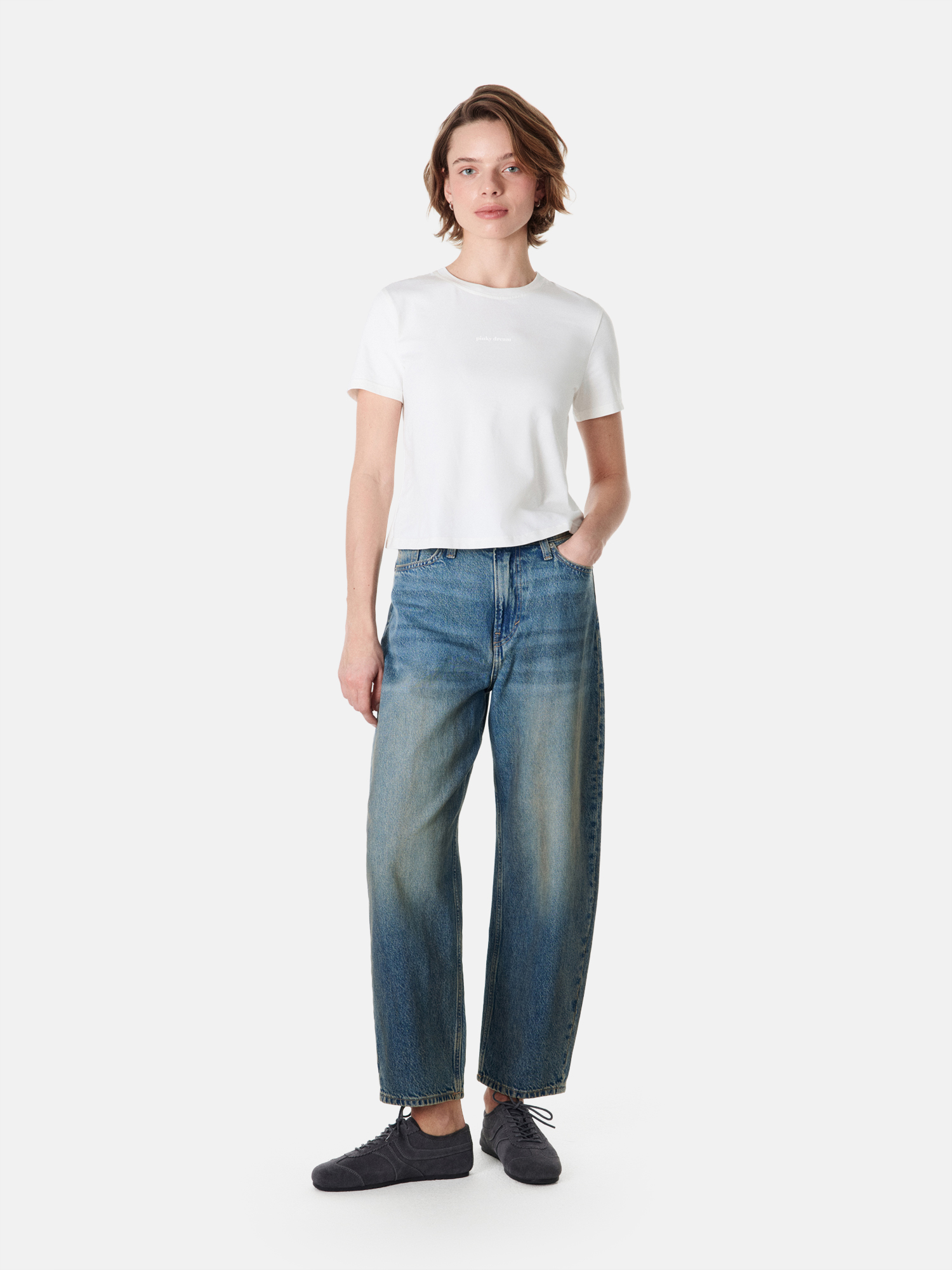 Компактный силуэт позволяет сочетать футболку с высокой и средней посадкой низов.