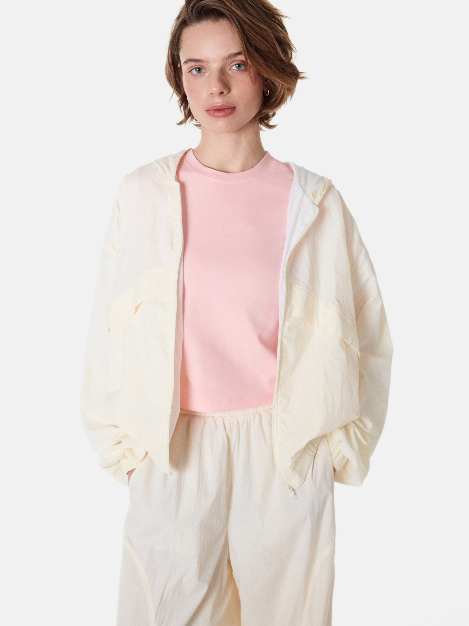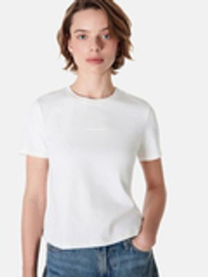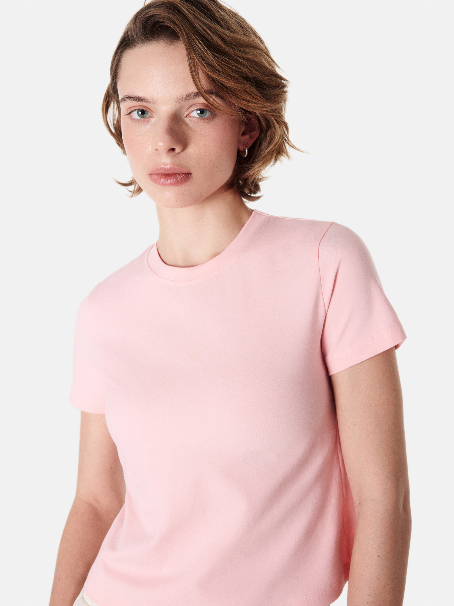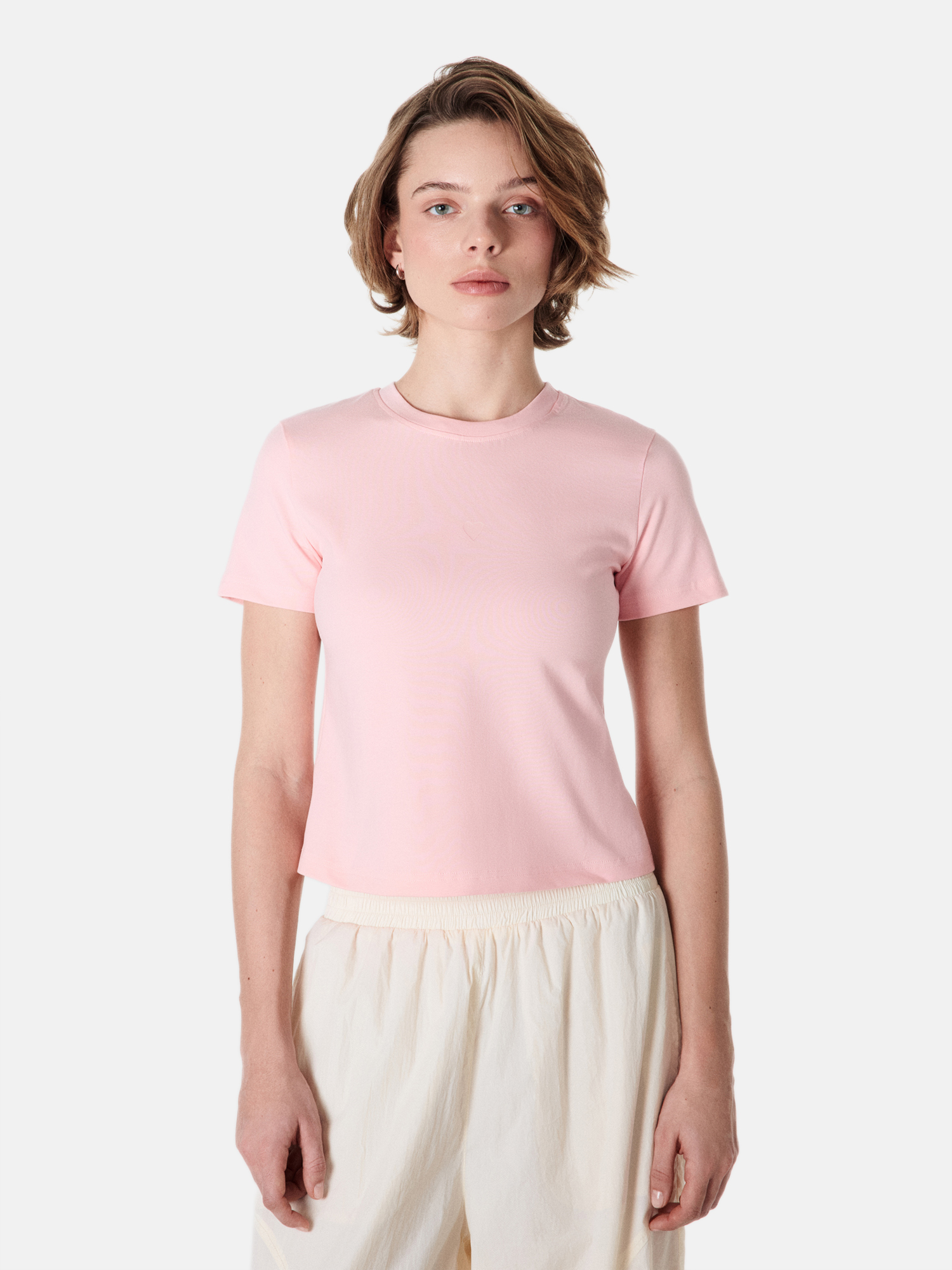 Компактный силуэт позволяет сочетать футболку с высокой и средней посадкой низов.