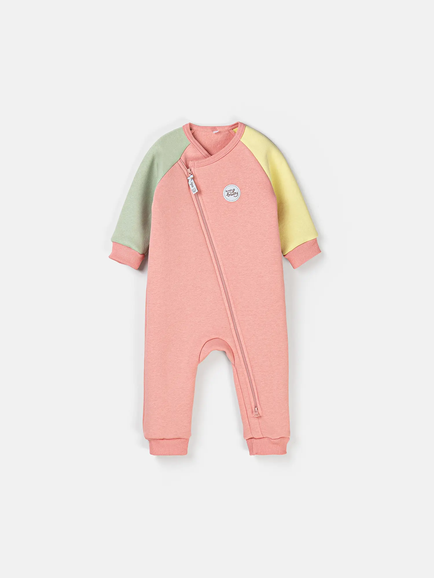 Смещенная молния, уходящая в правое плечо и левую ножку, облегчает переодевание — быстро и удобно сменить одежду после прогулки или перед сном.