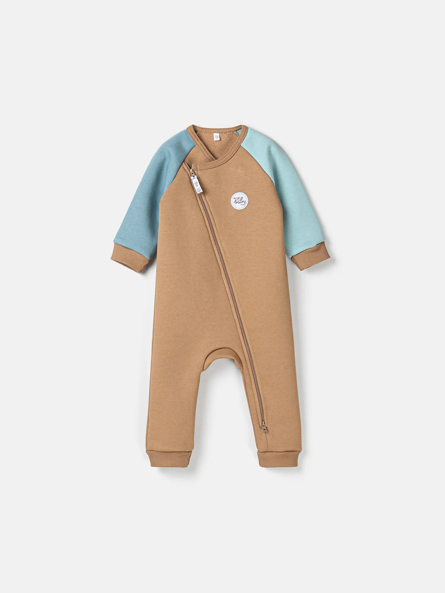 Смещенная молния, уходящая в правое плечо и левую ножку, облегчает переодевание — быстро и удобно сменить одежду после прогулки или перед сном.