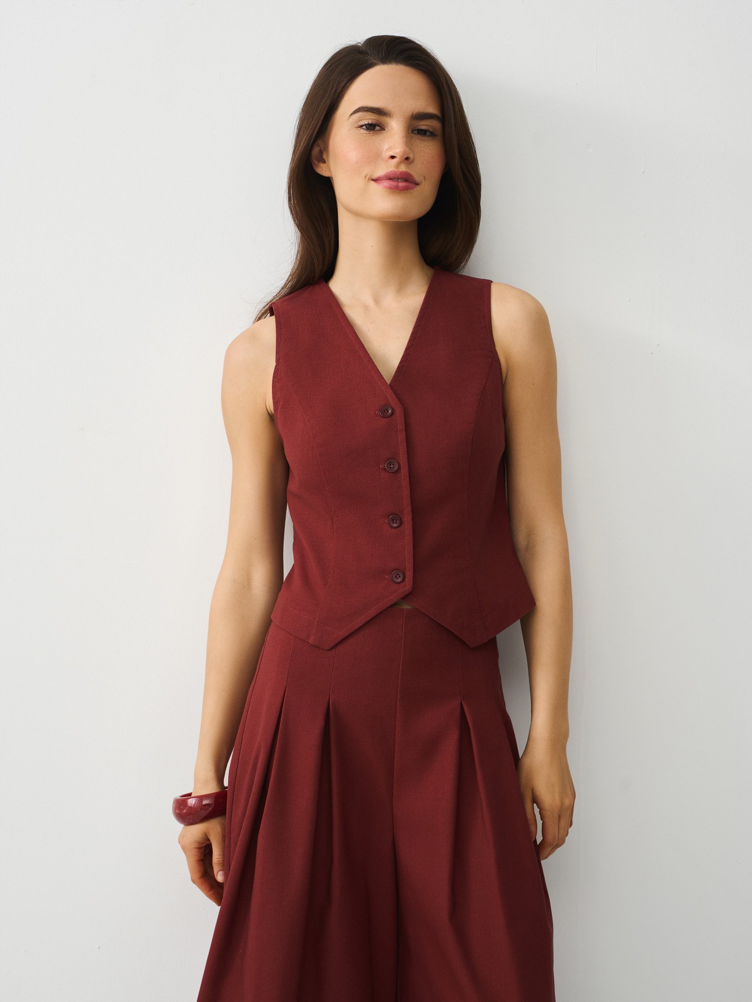 Лаконичный крой без воротника и аккуратная застежка на пуговицы позволяют носить жилет как самостоятельный топ, либо использовать его в качестве стильного второго слоя поверх базовых футболок, лонгсливов,