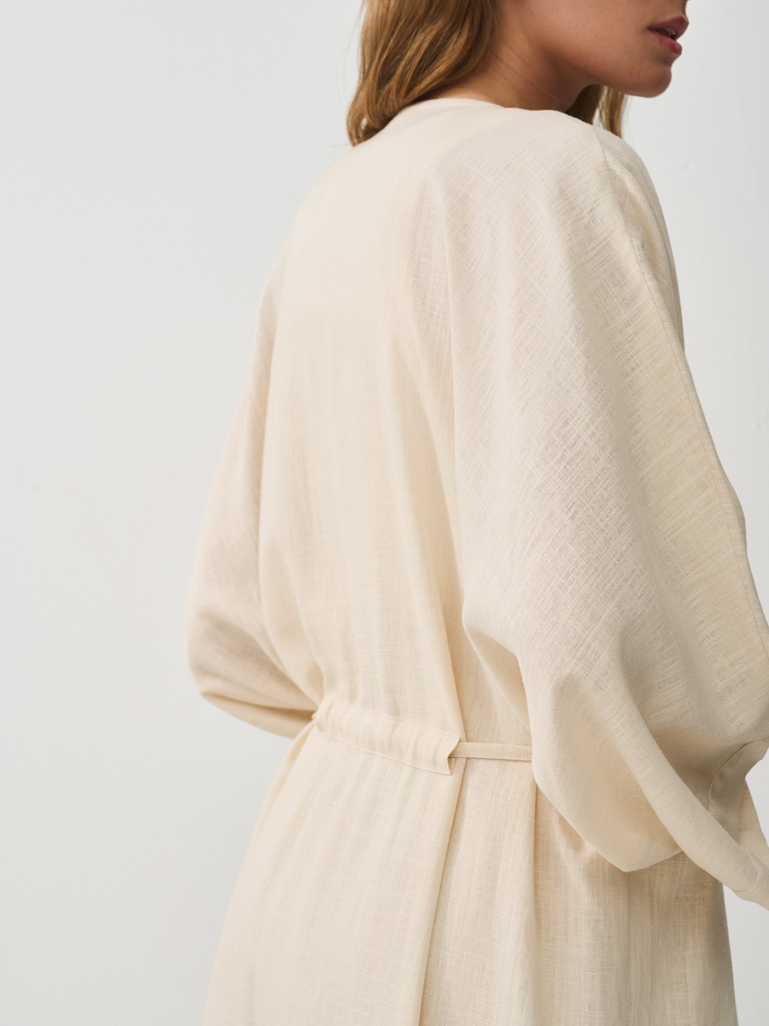 Благодаря добавлению эластана изделие не мнется и отлично сохраняет форму. Цельнокроеный длинный рукав летучая мышь и глубокие боковые разрезы от колена до щиколотки придают образу динамичности и позволяют стильно комбинировать накидку с любой летней обувью.
