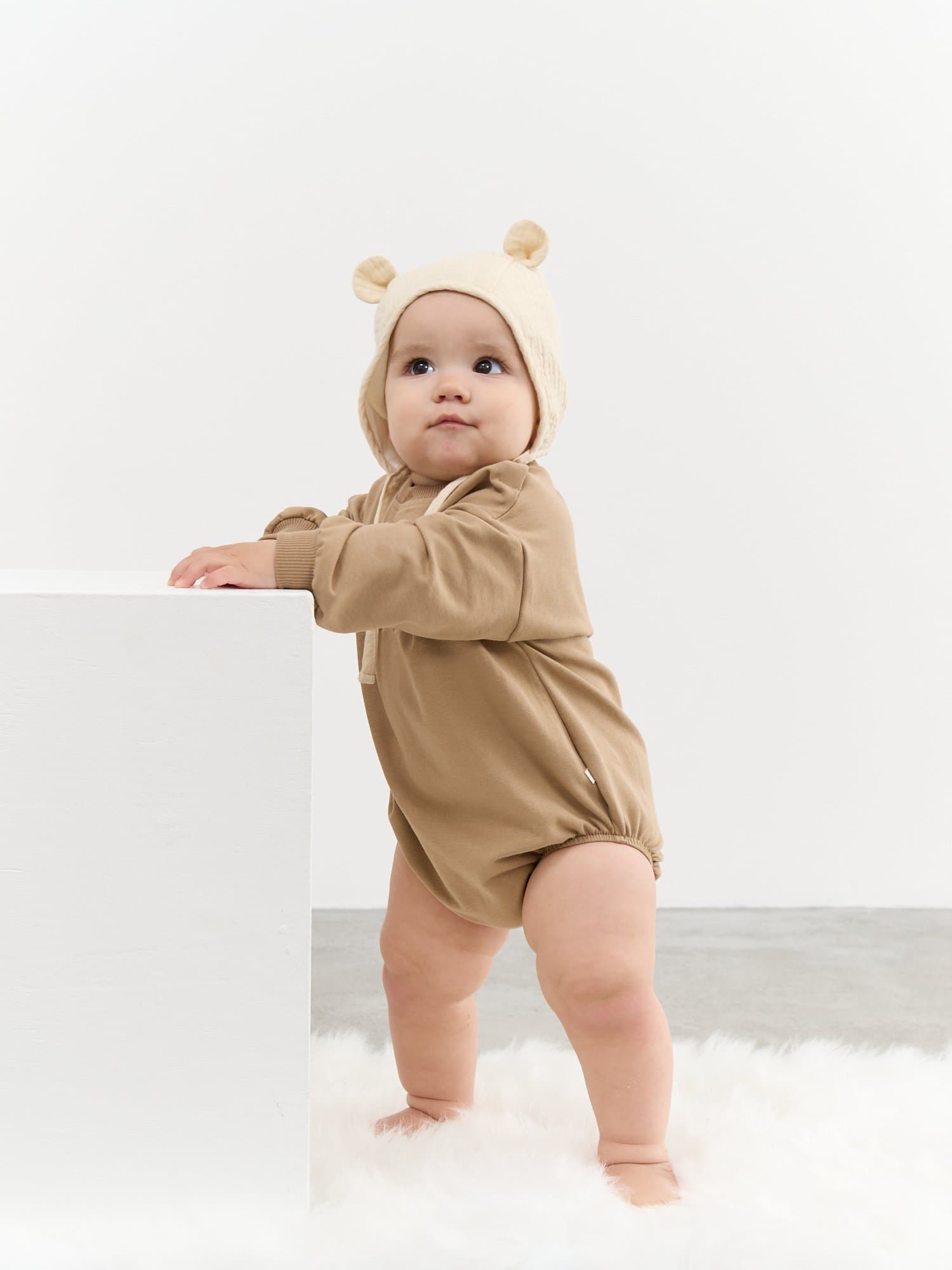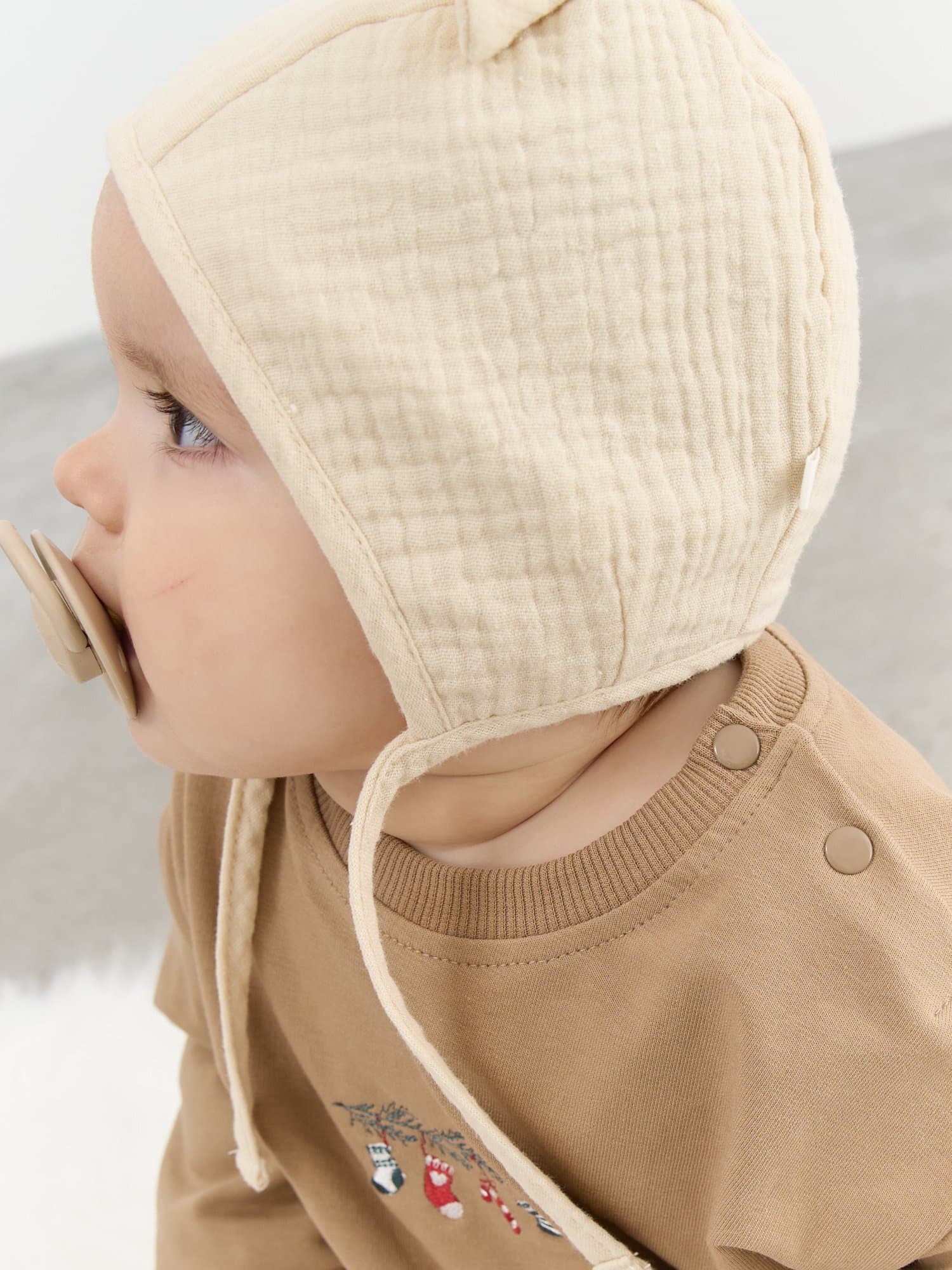 Чепчик из мягкого муслина с хлопковым подкладом и с очаровательными ушками на макушке.