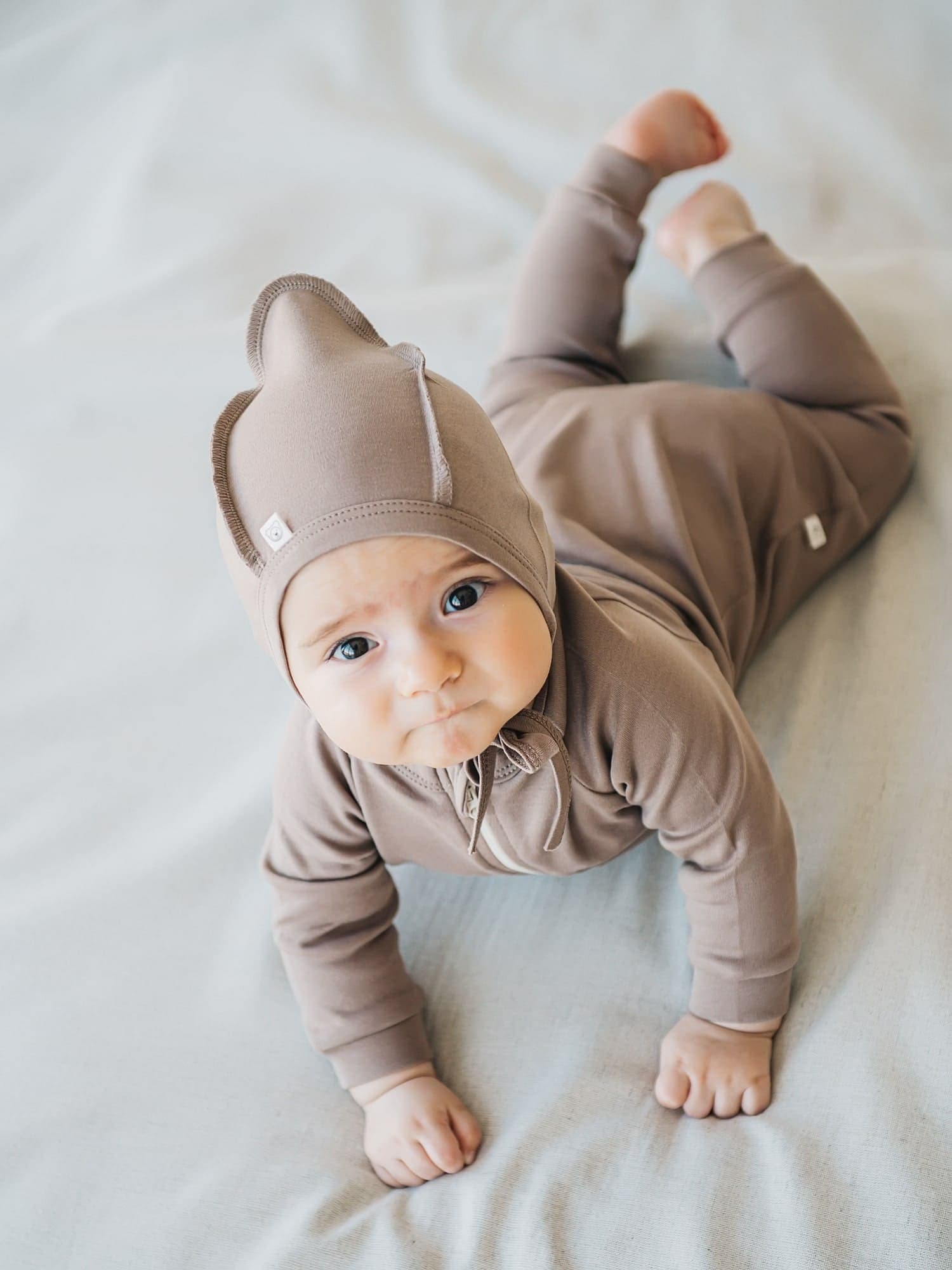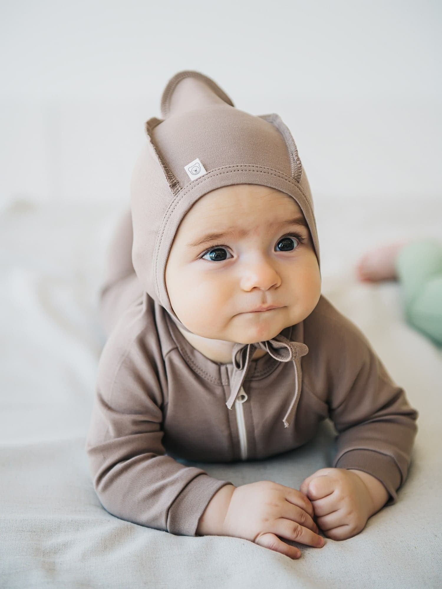 Нежно облегает голову и прикрывает ушки.