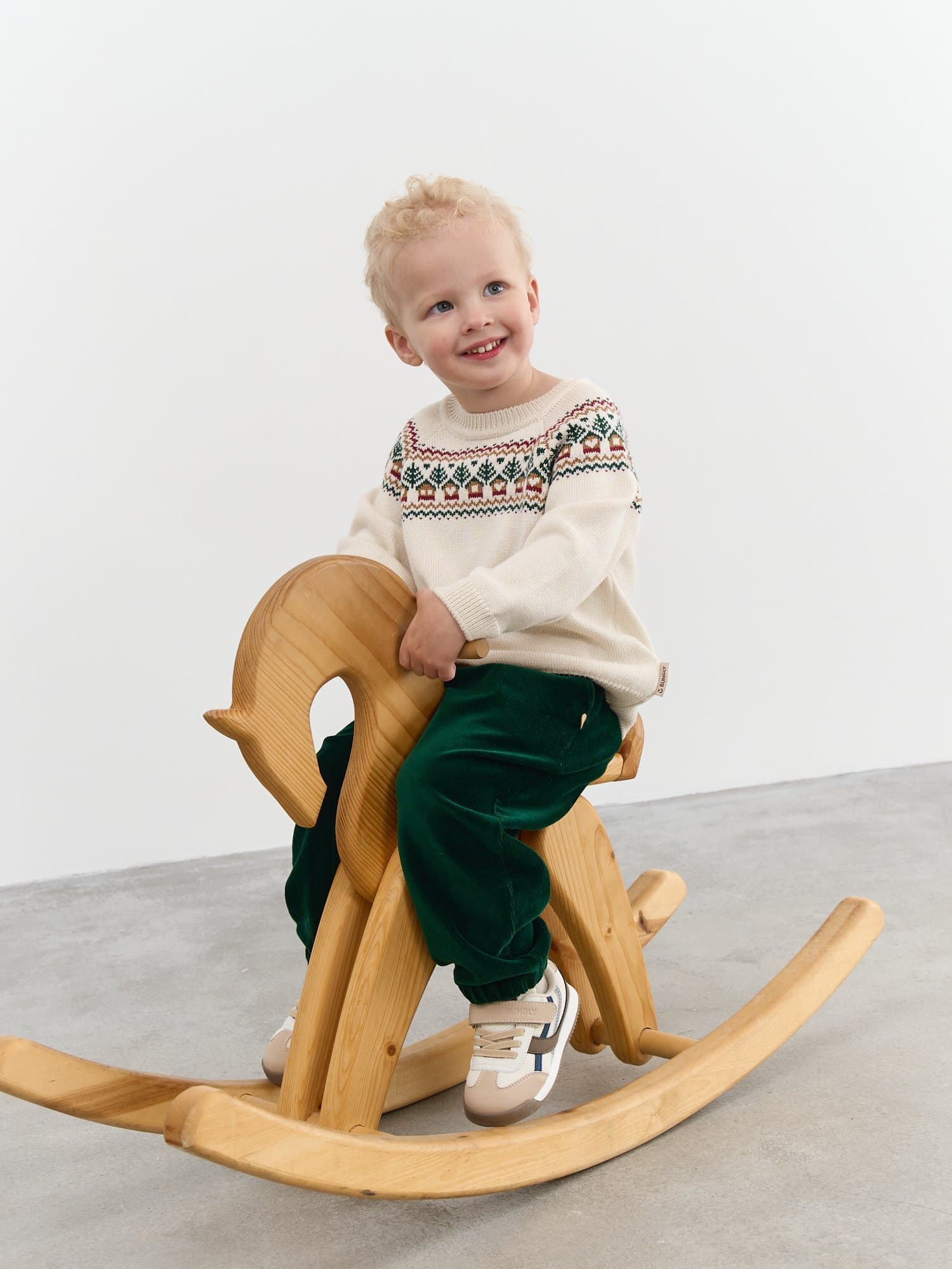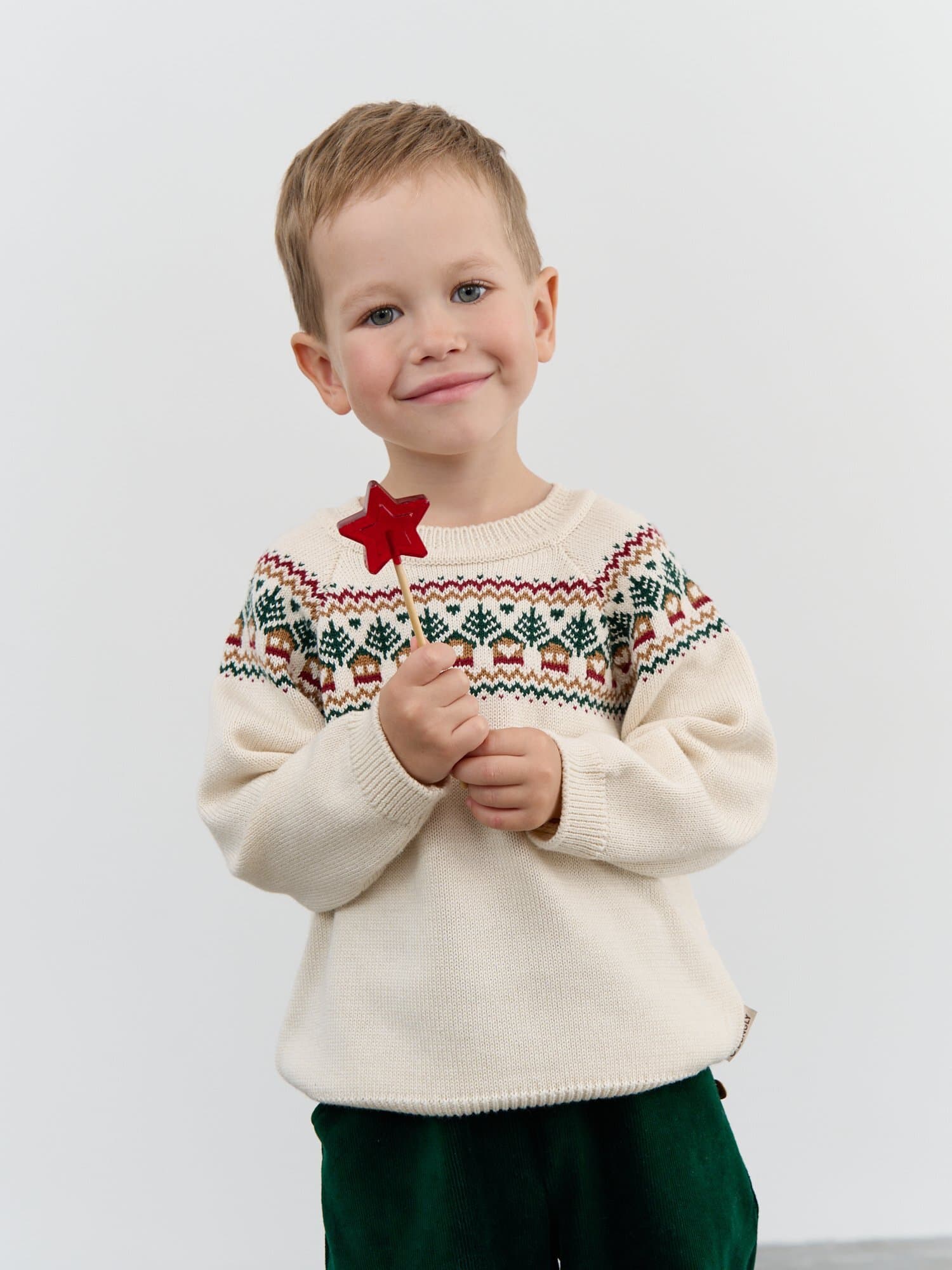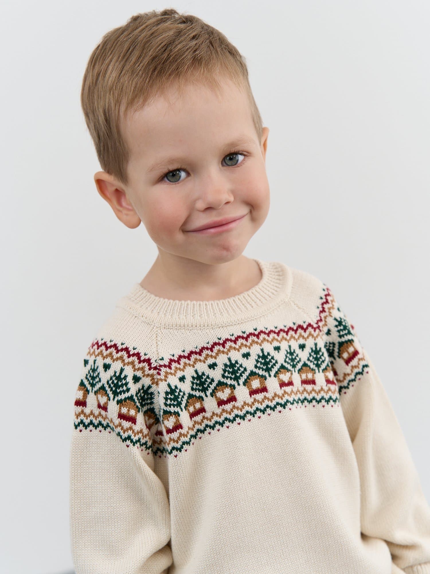 Верх джемпера украшен атмосферным жаккардовым рисунком, а низ выполнен гладкой вязкой для комфорта и аккуратности.