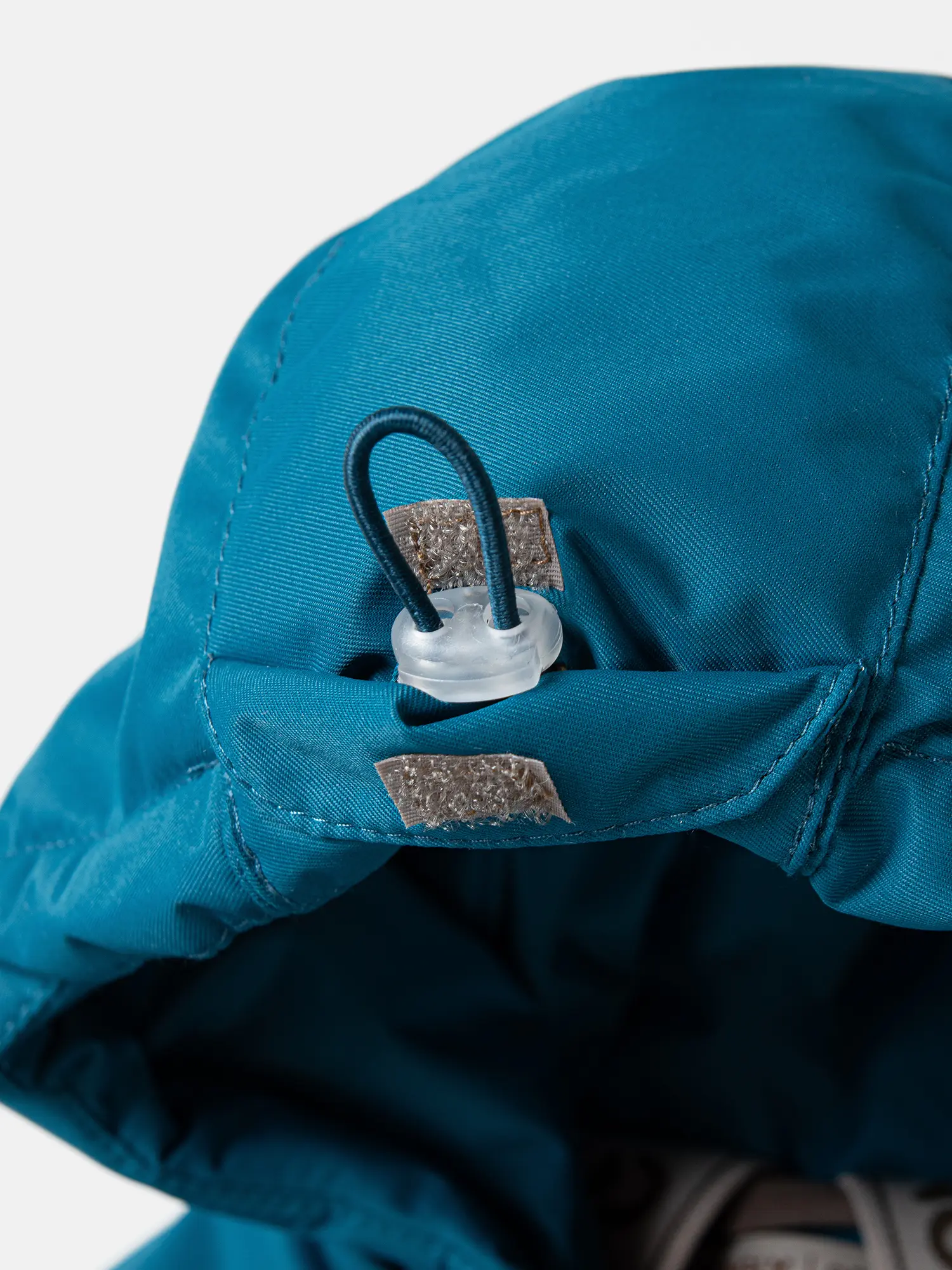 Несъёмный глубокий капюшон с утяжкой на резинку с фиксатором. Фиксатор спрятан под клапаном спереди на капюшоне.