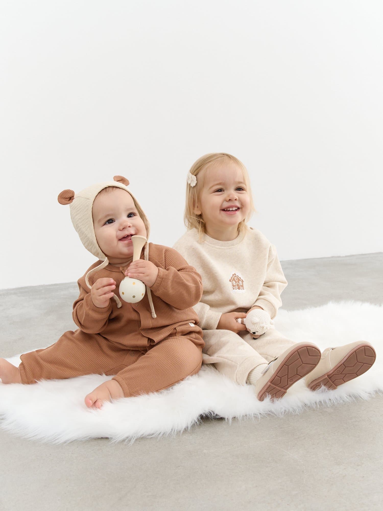 Мягкая резинкочка по низу штанин и рукавов, чтобы ничего не задиралось и не мешало ползать или собирать пирамидки.