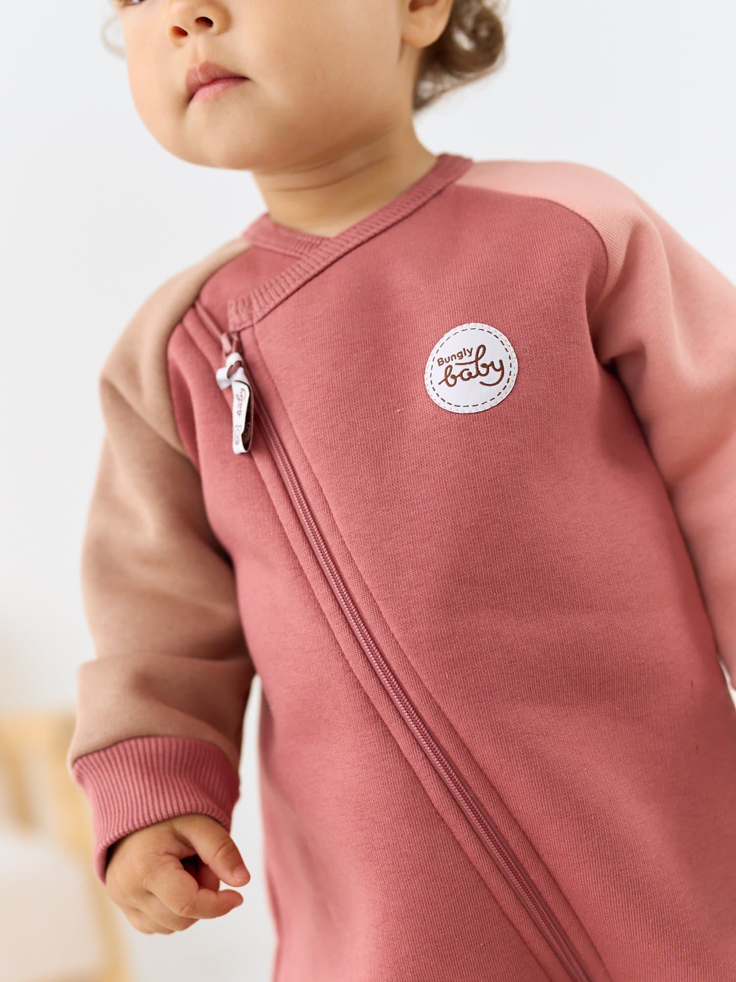 Смещённая молния, уходящая вправое плечо и левую ножку, облегчает переодевание – быстро и удобно сменить одежду после прогулки или перед сном.