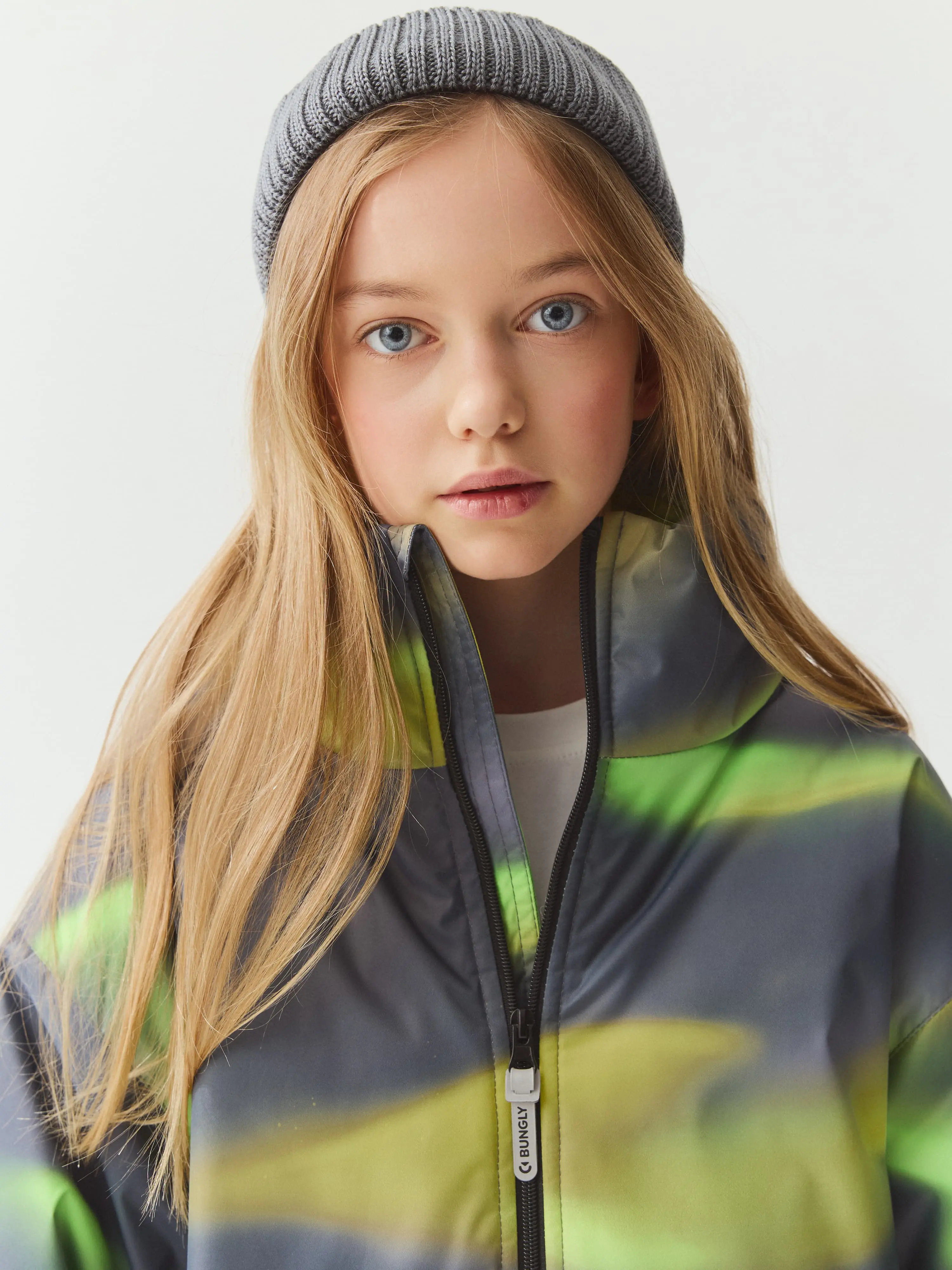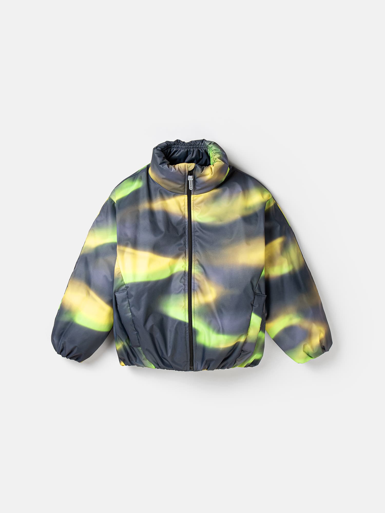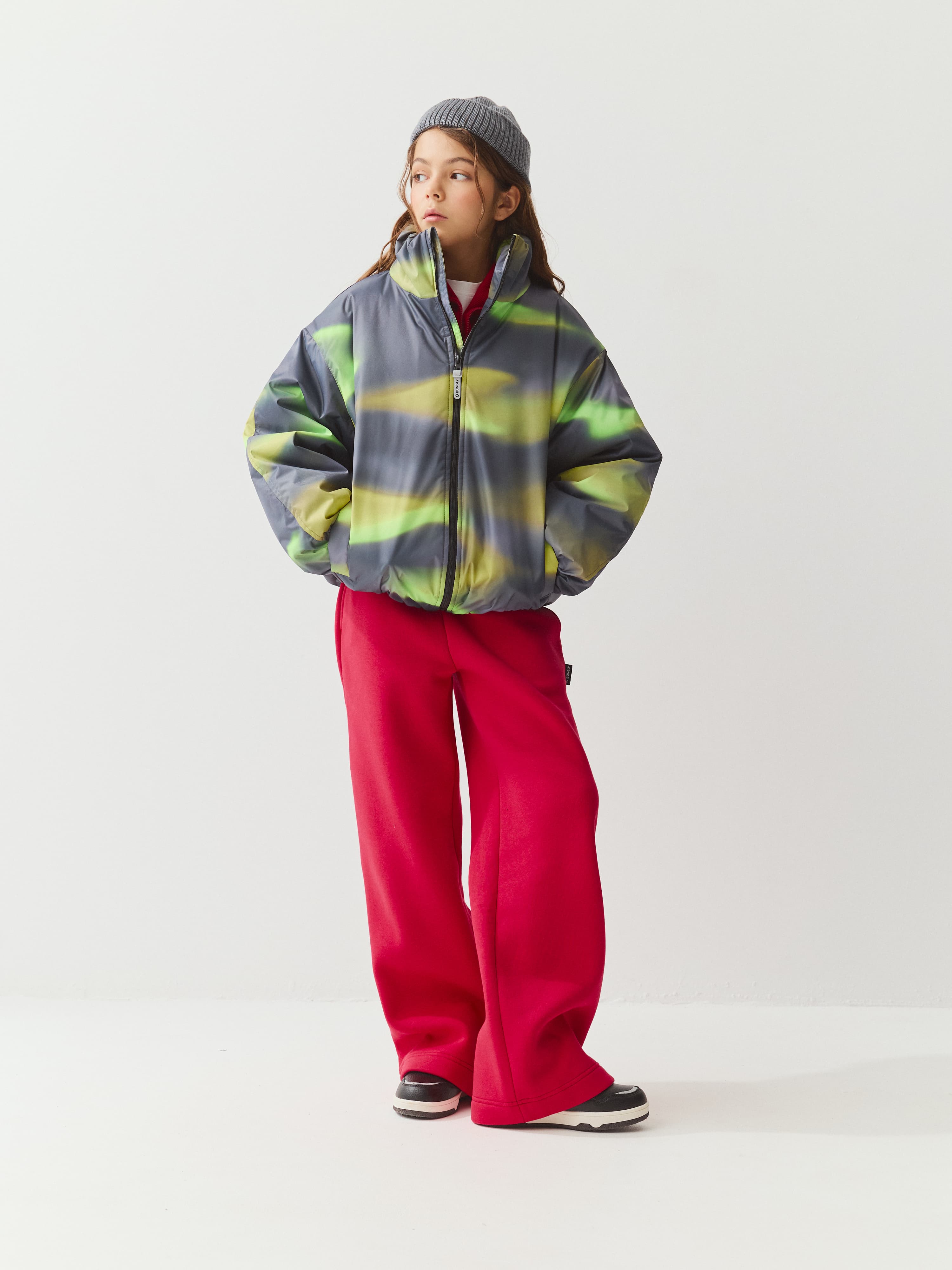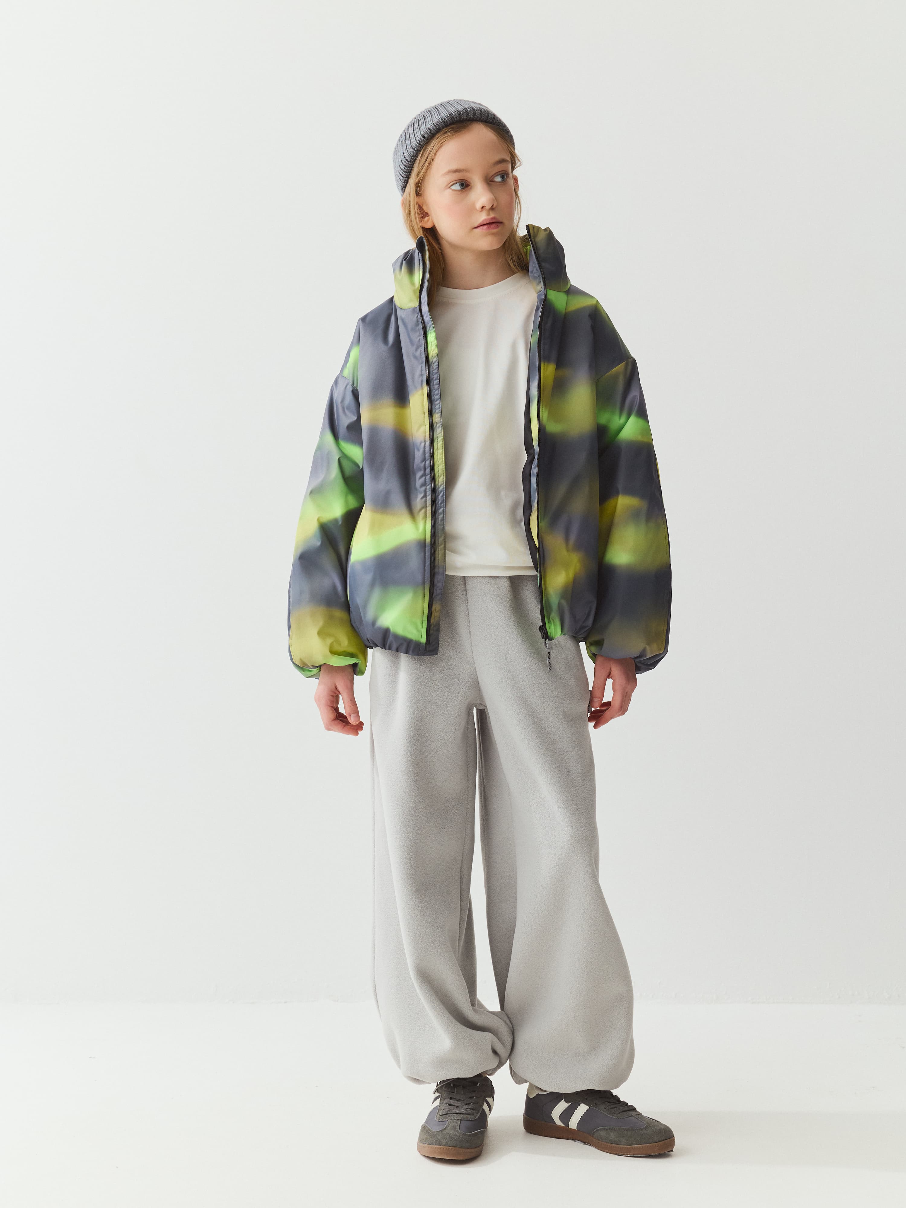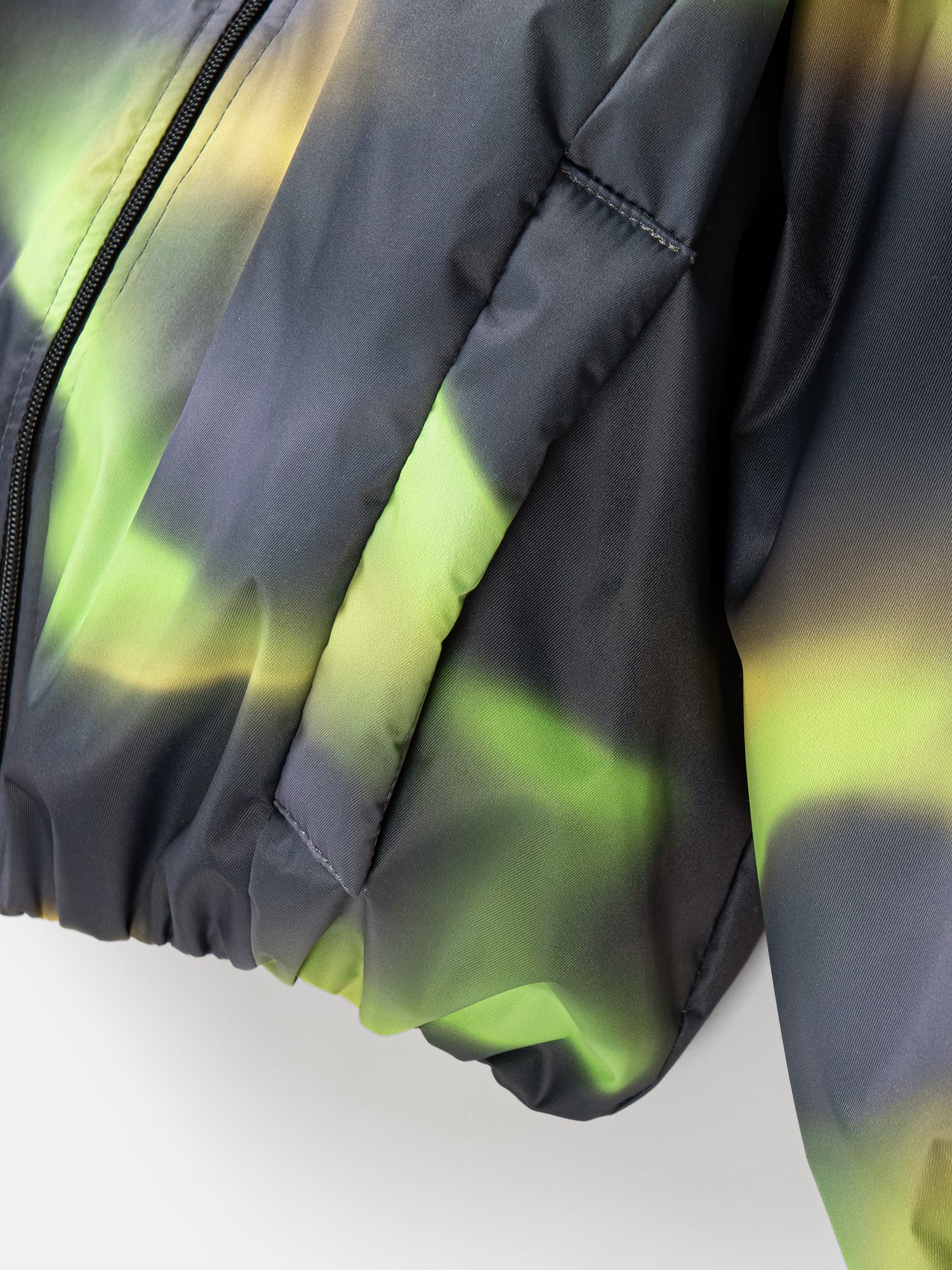 Укороченная куртка с необычным принтом из ткани с ветро- и влагозащитной пропиткой.