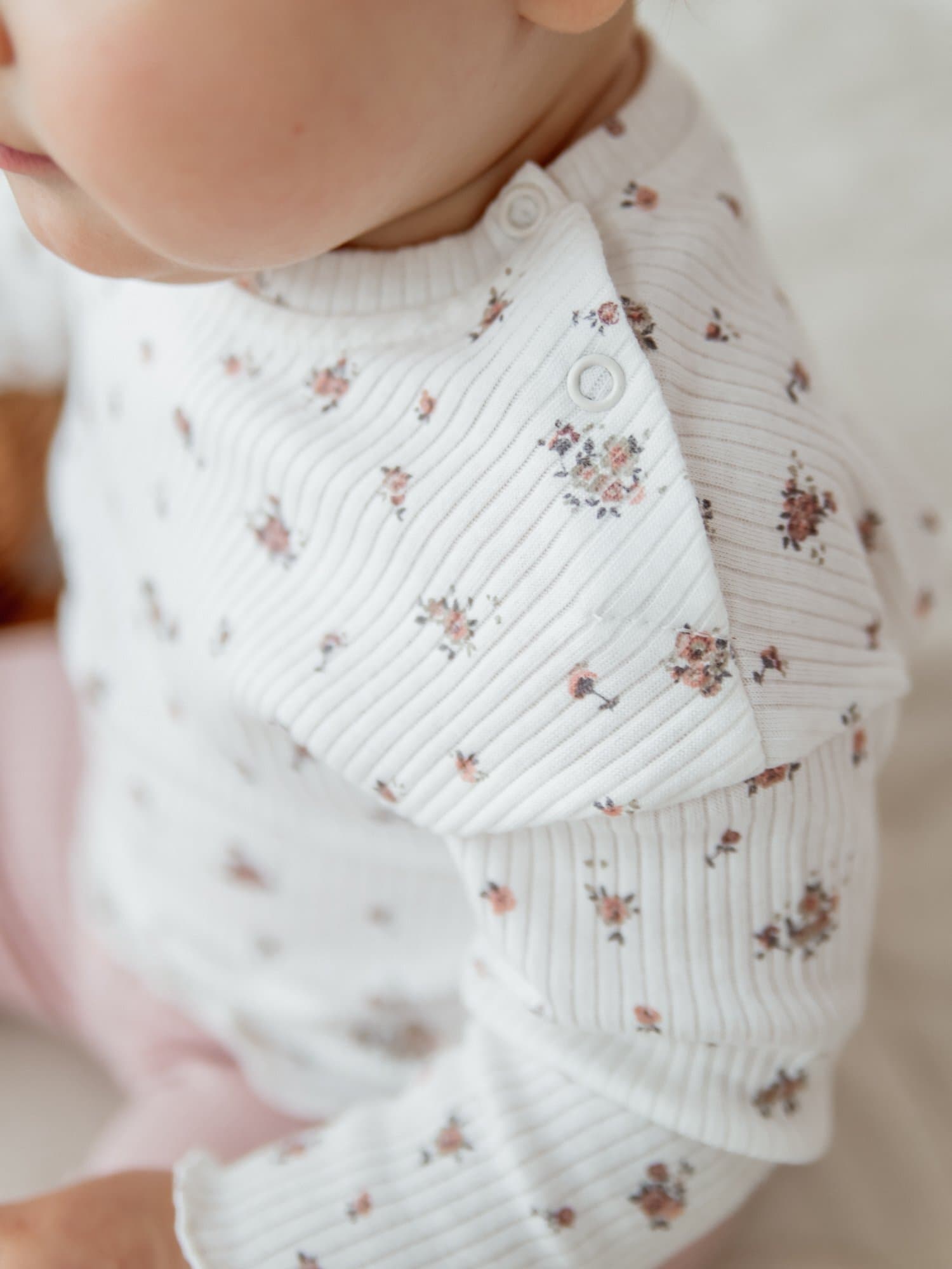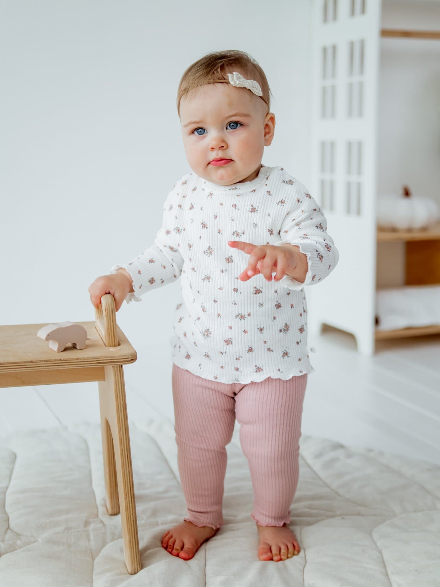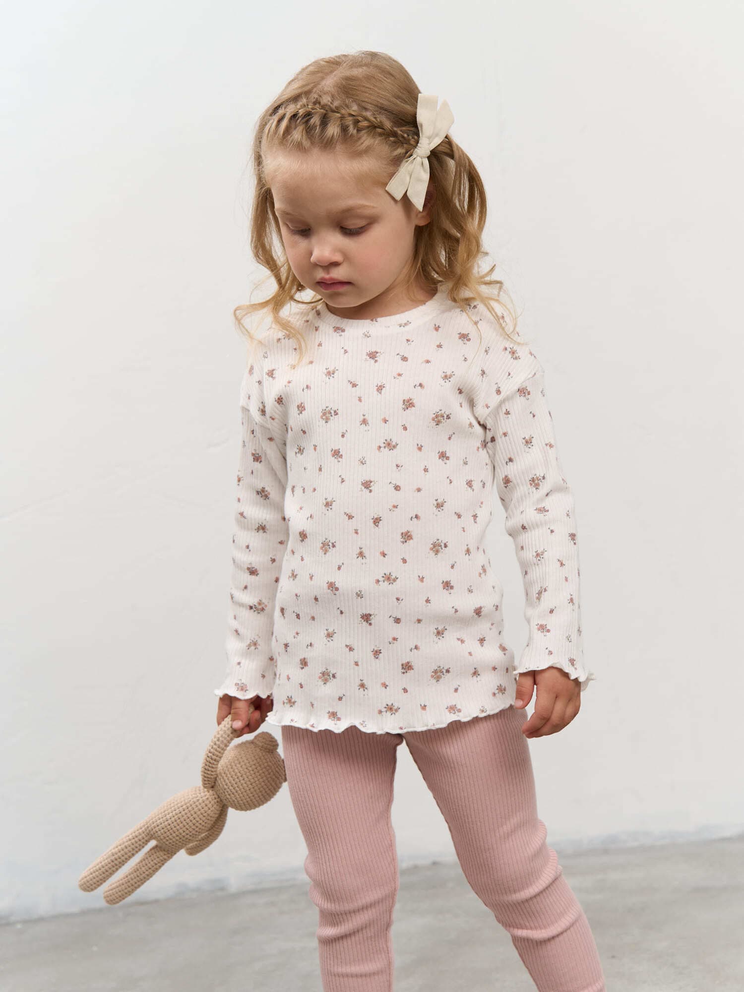 Свободный крой и длинные рукава с нежным волнистым краем не стесняют движений, поэтому лонгслив подходит для активных игр, прогулок и занятий в детском саду.