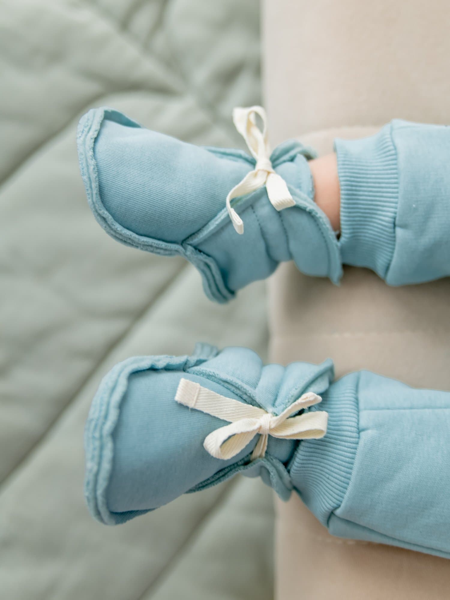 Открытые швы снаружи не мешают и не натирают нежную кожу малыша, а мягкие завязки позволяют легко и надёжно зафиксировать пинетки на ножках – даже если малыш активно двигается.