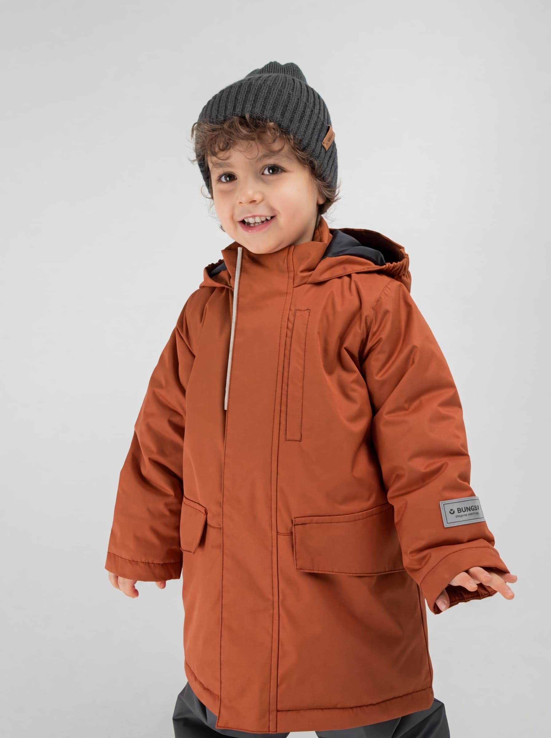 Воротник-стойка и несъемный капюшон с утяжкой на резинку для защиты от ветра.