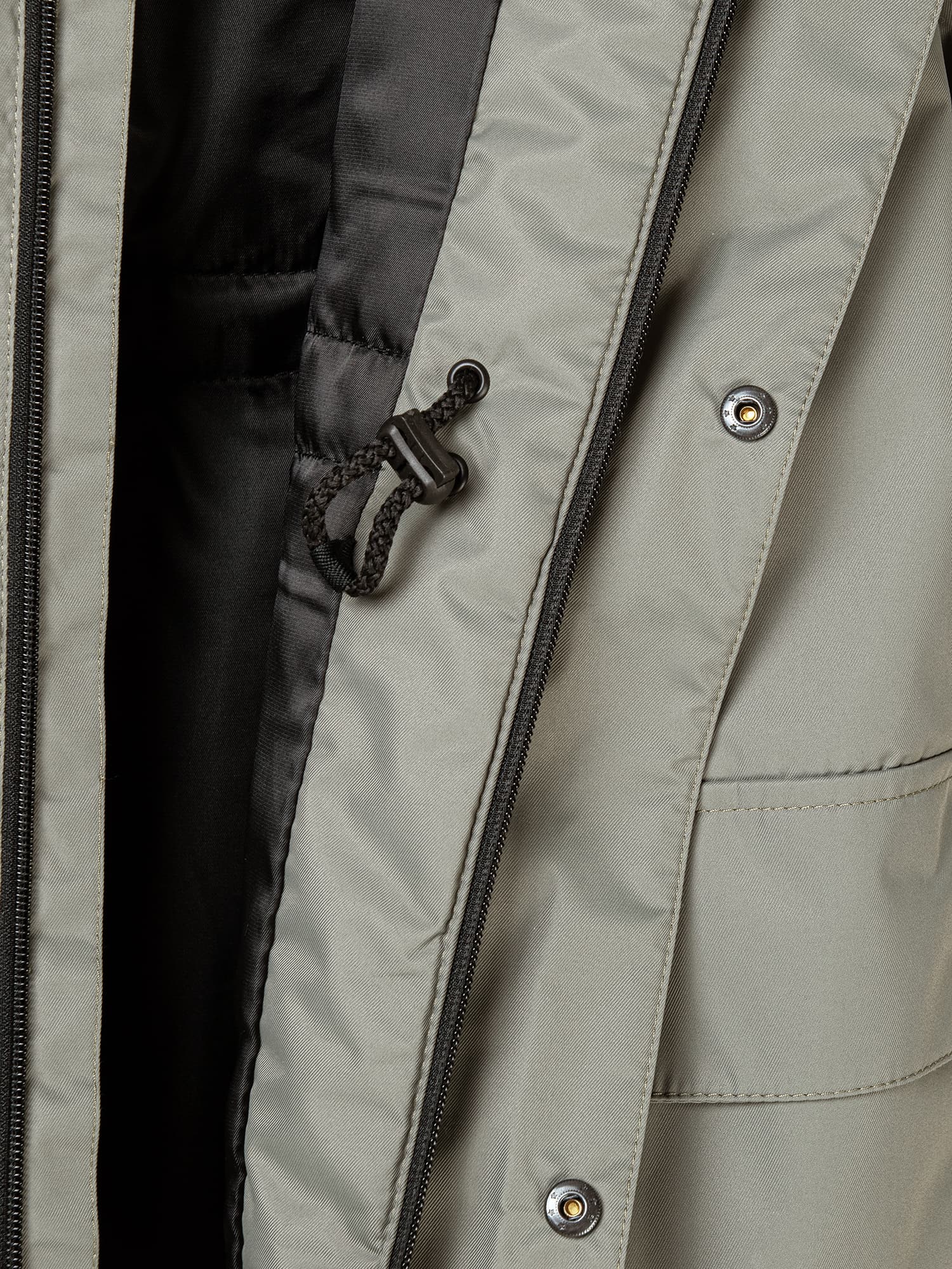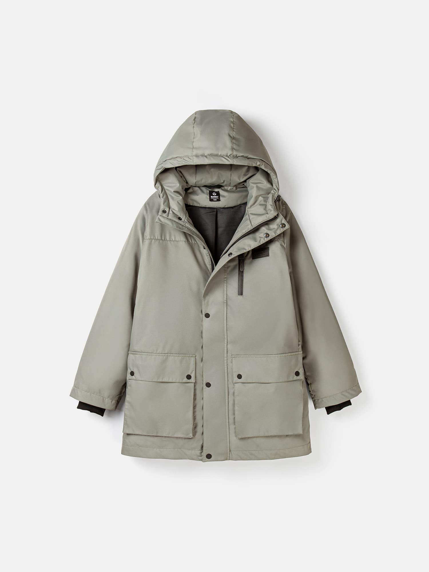 Вместительные карманы-портфели с клапанами на кнопках и один прорезной карман на молнии в верхней части парки.