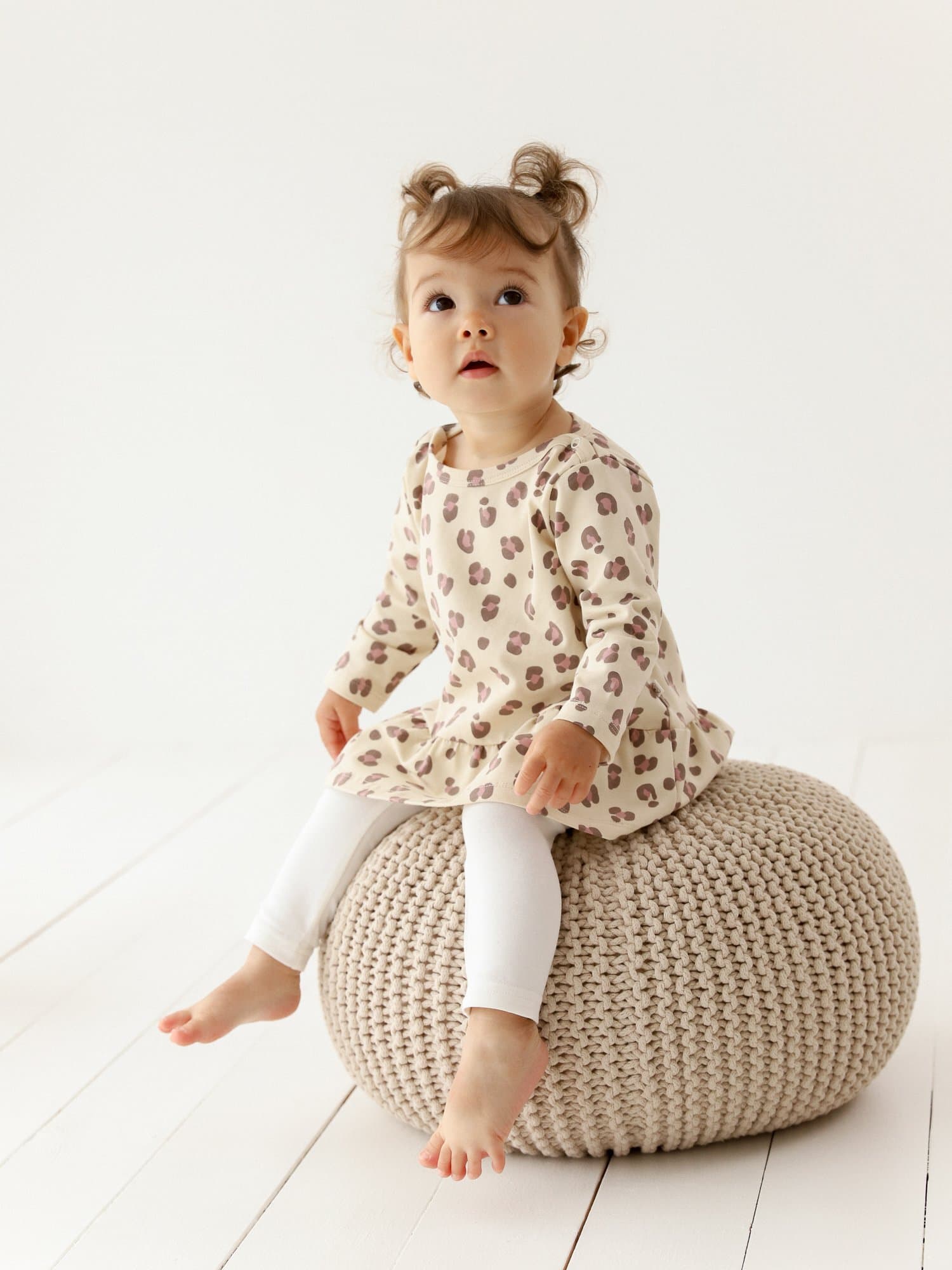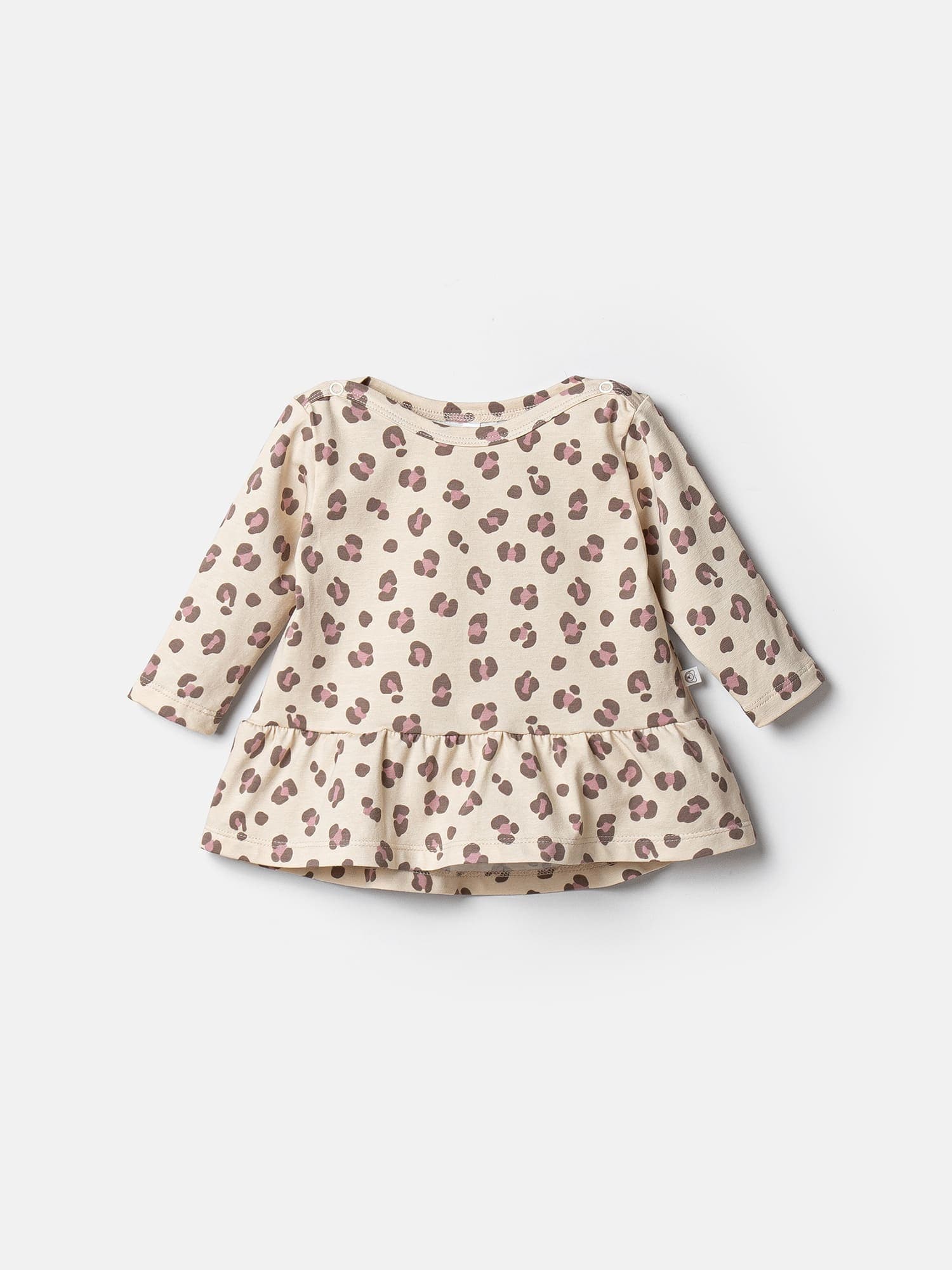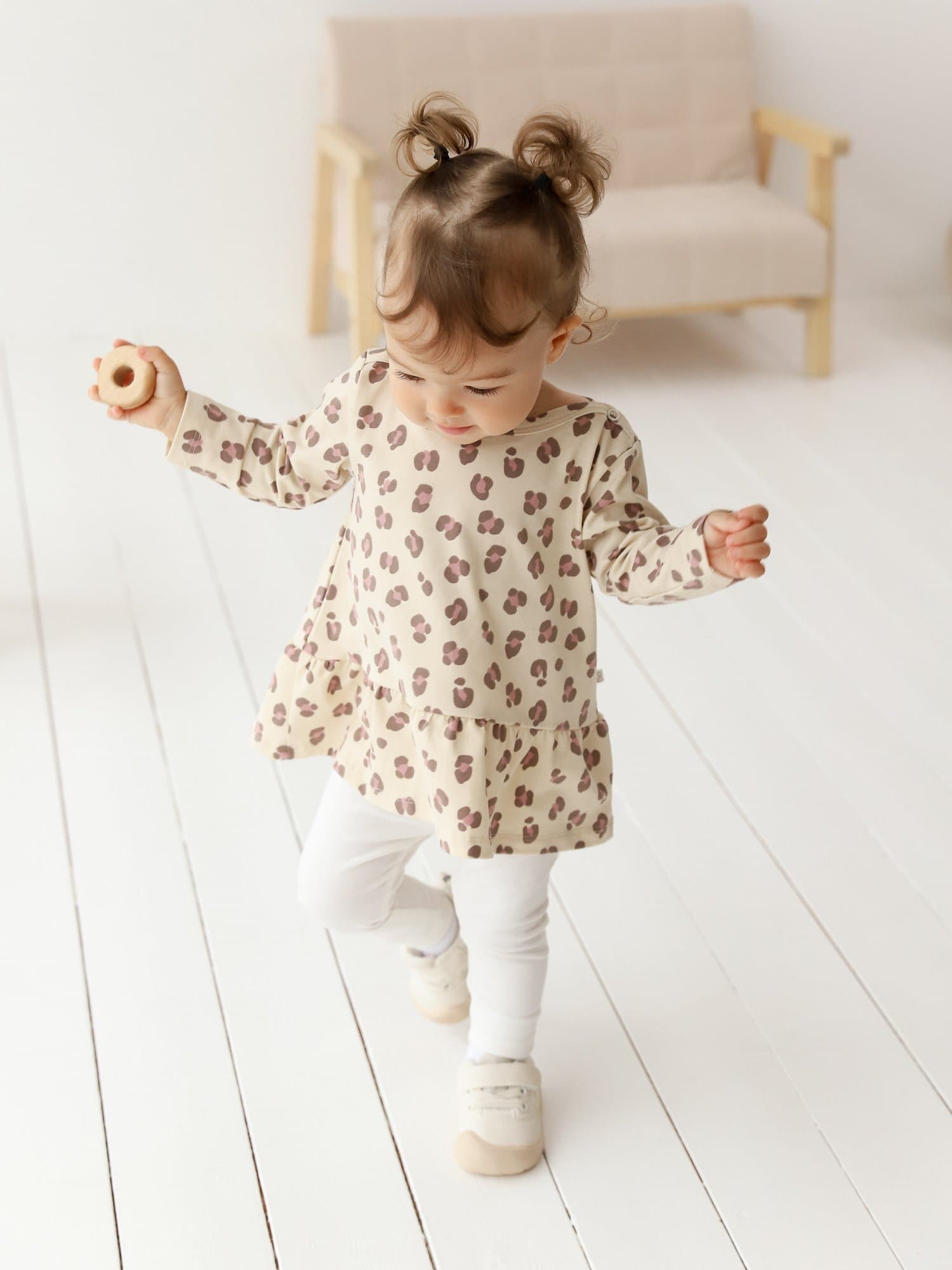 Изящная горловина-лодочка с мягкой бейкой и застёжкой на кнопках по плечу облегчает переодевание, особенно актуальна для чувствительных малышей.