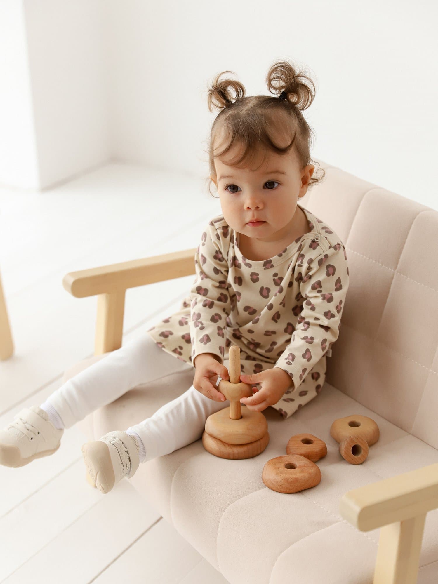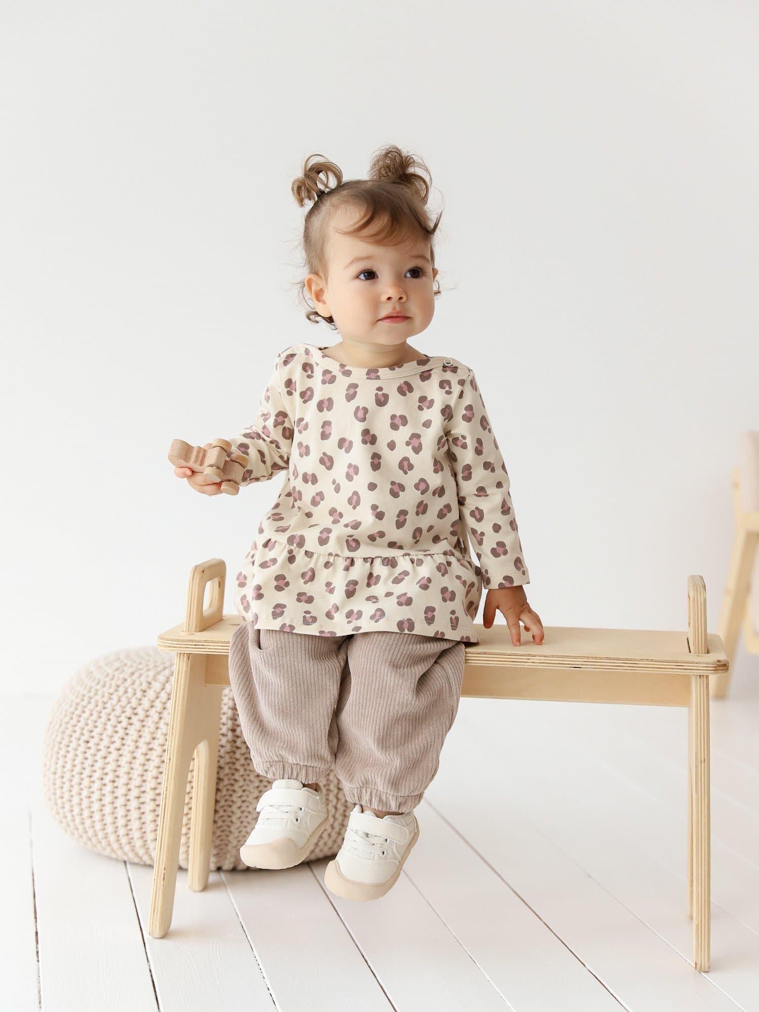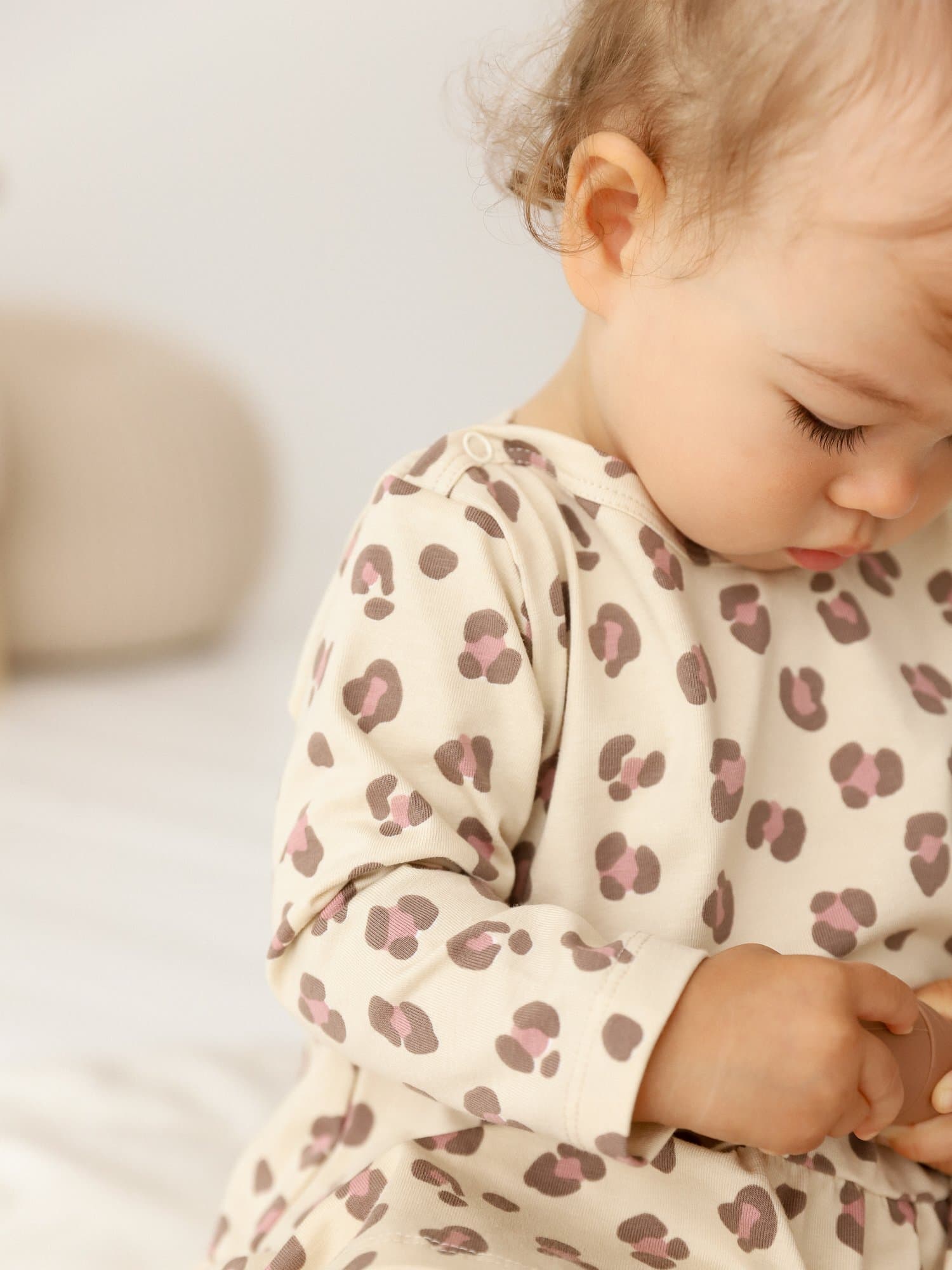 Изящная горловина-лодочка с мягкой бейкой и застёжкой на кнопках по плечу облегчает переодевание, особенно актуальна для чувствительных малышей.