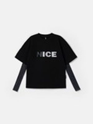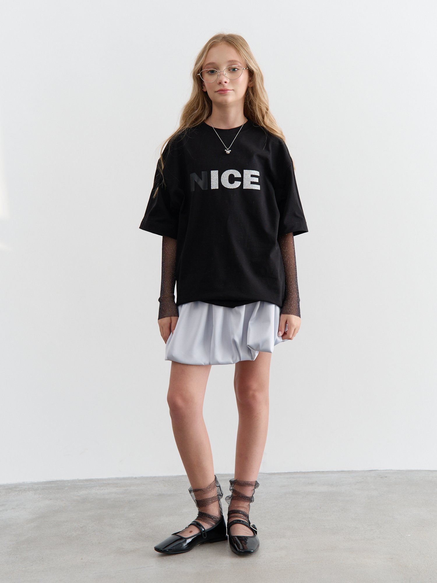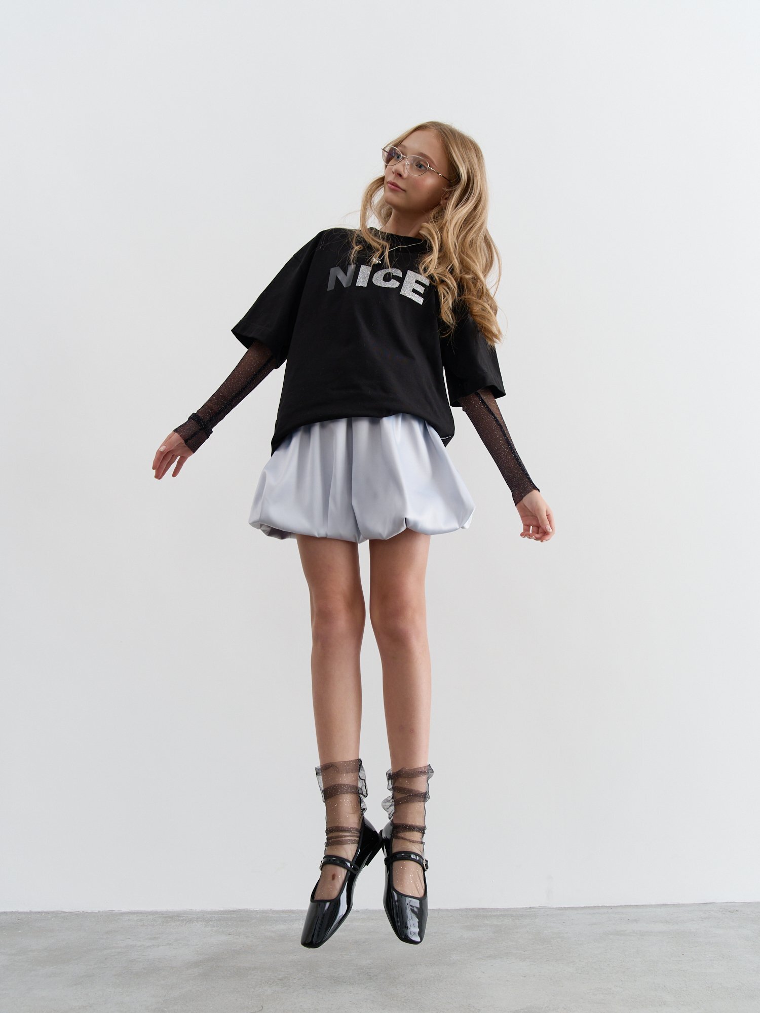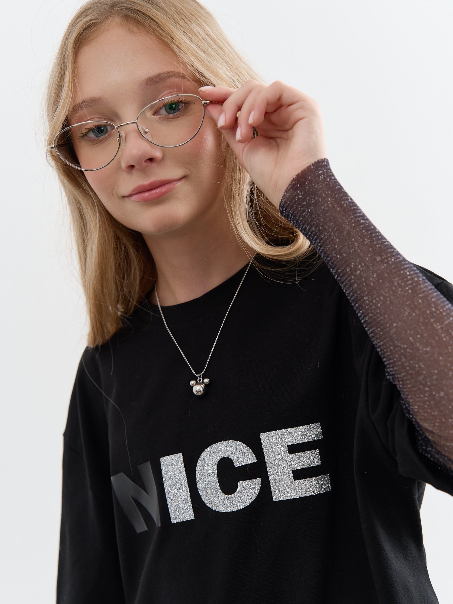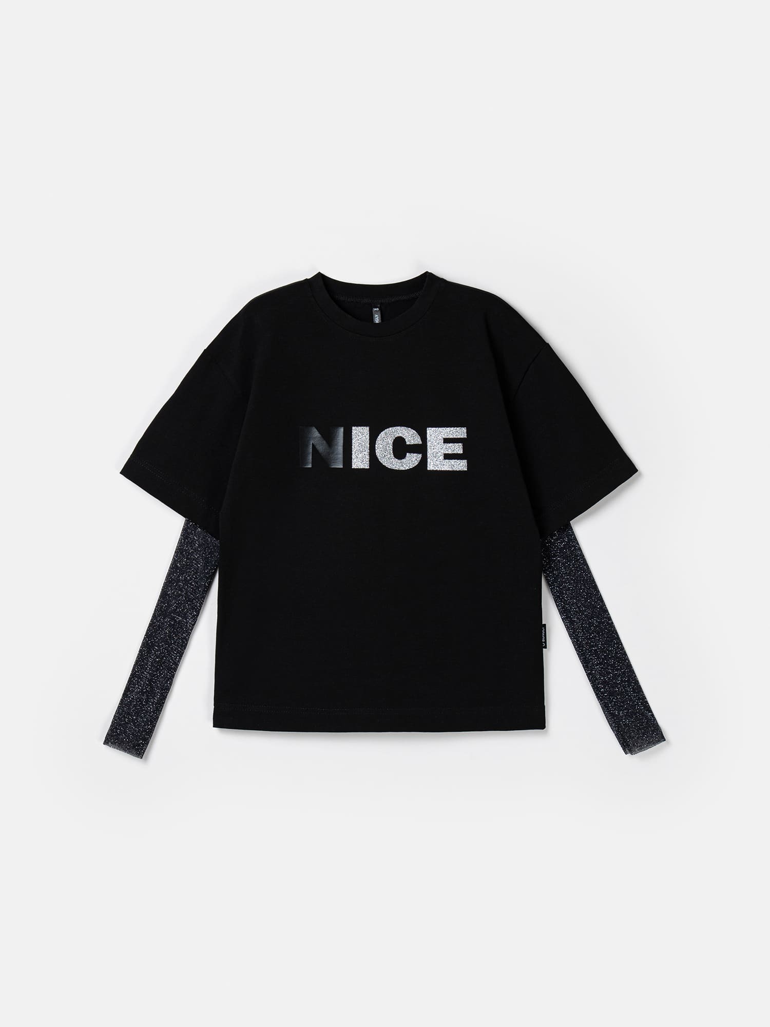 Футболка из мягкого и приятного к телу трикотажа дополнена митенками из полупрозрачной ткани.