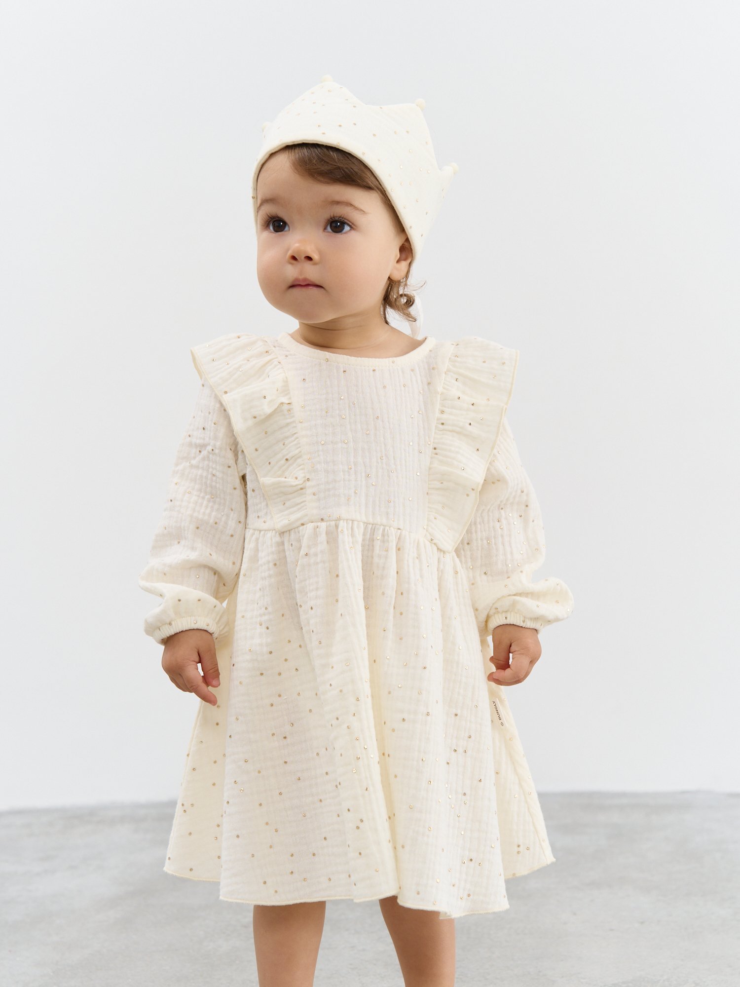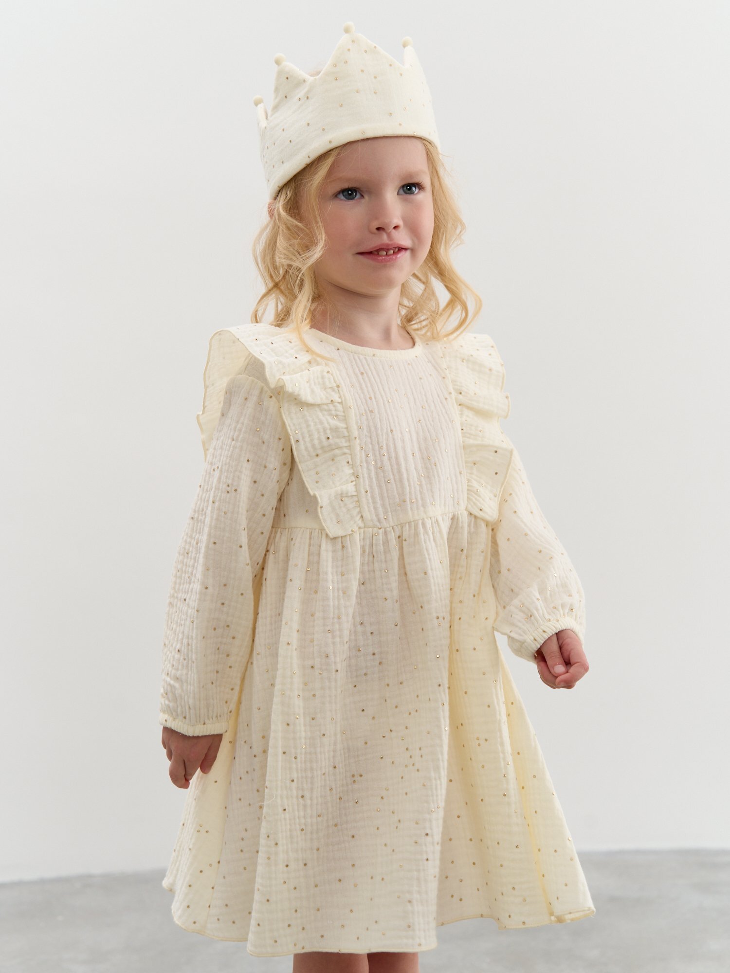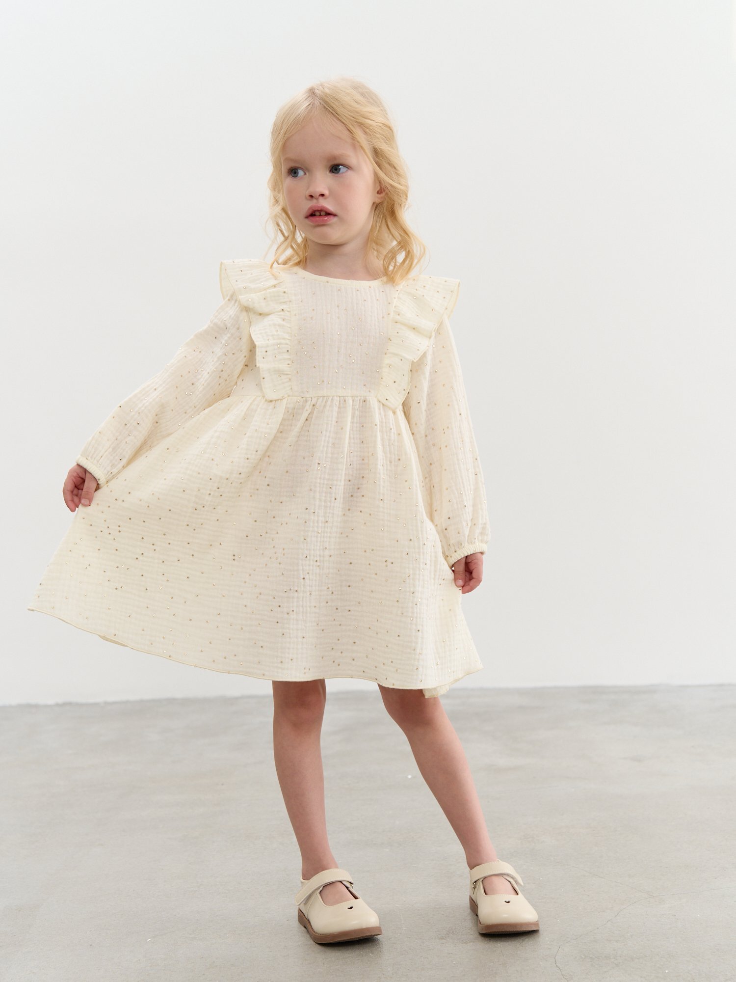 Комфортный крой для свободы движений. Длинные рукава с игривыми крылышками. Эластичная резинка позволяет легко собрать рукава для мытья рук или занятий творчеством.