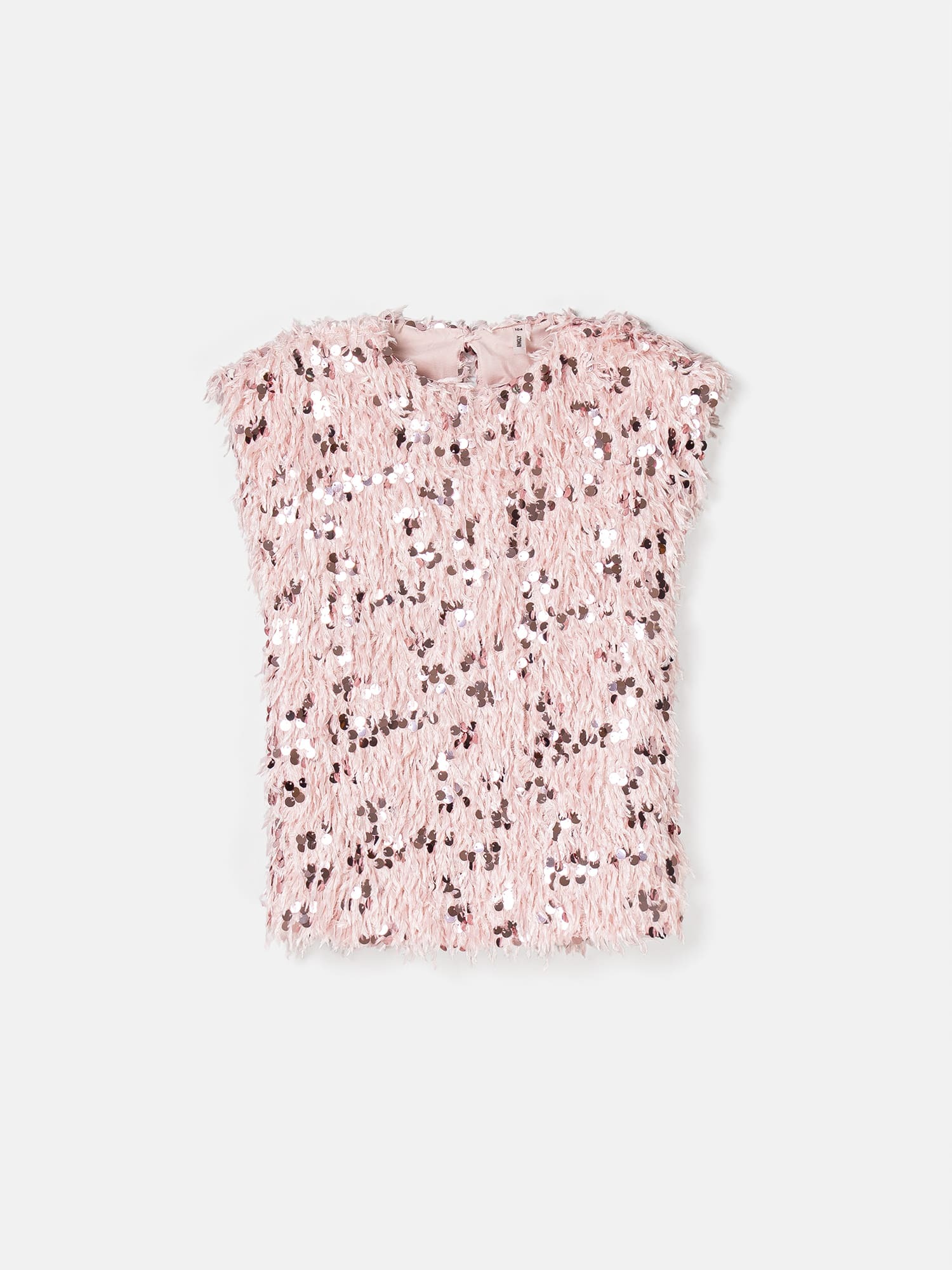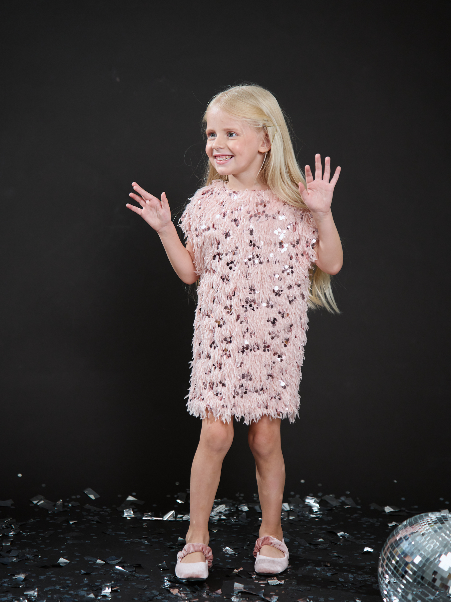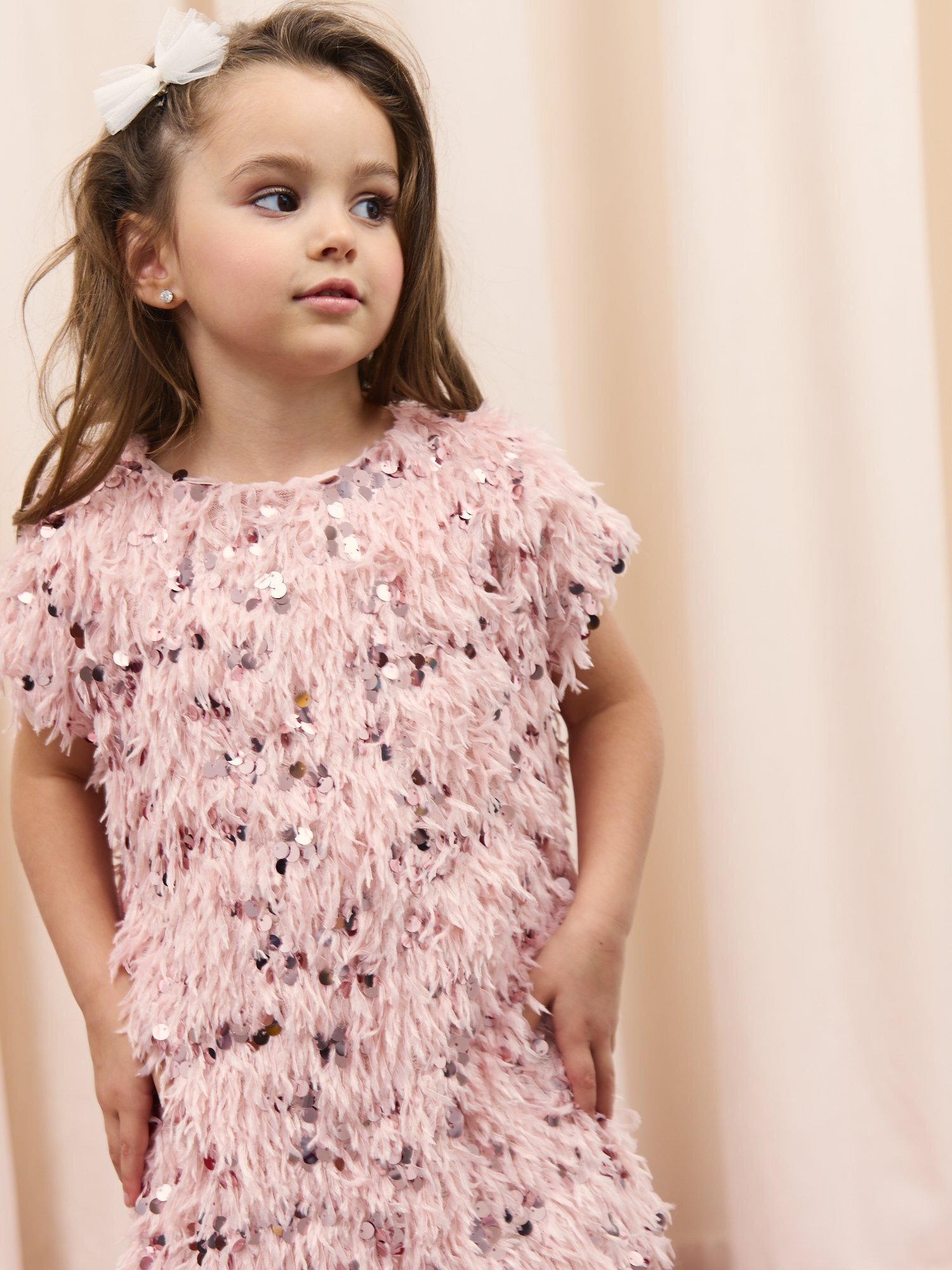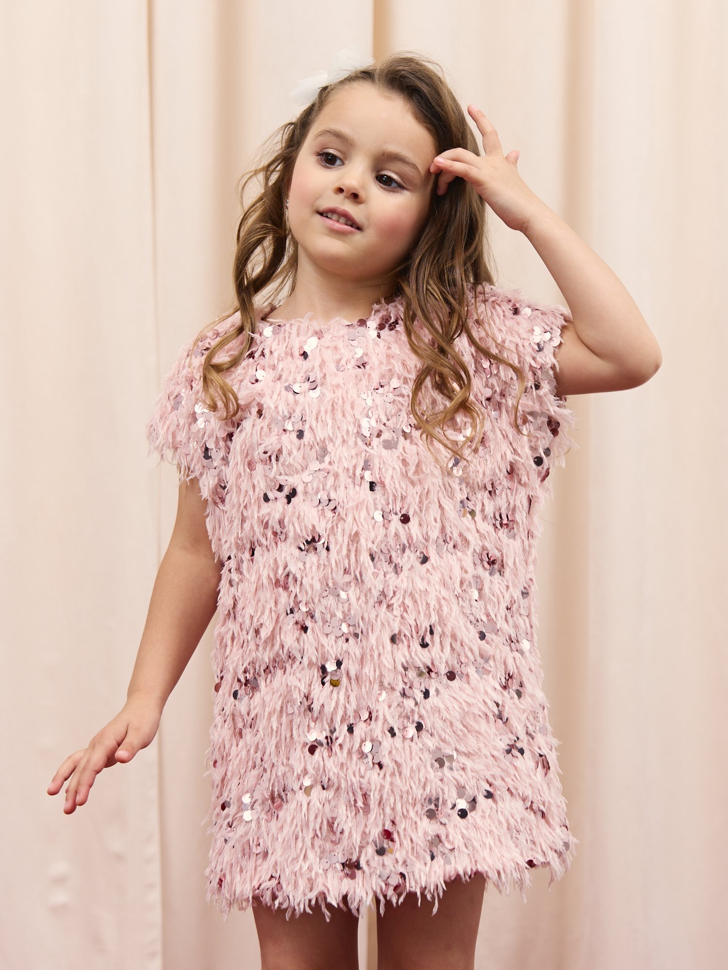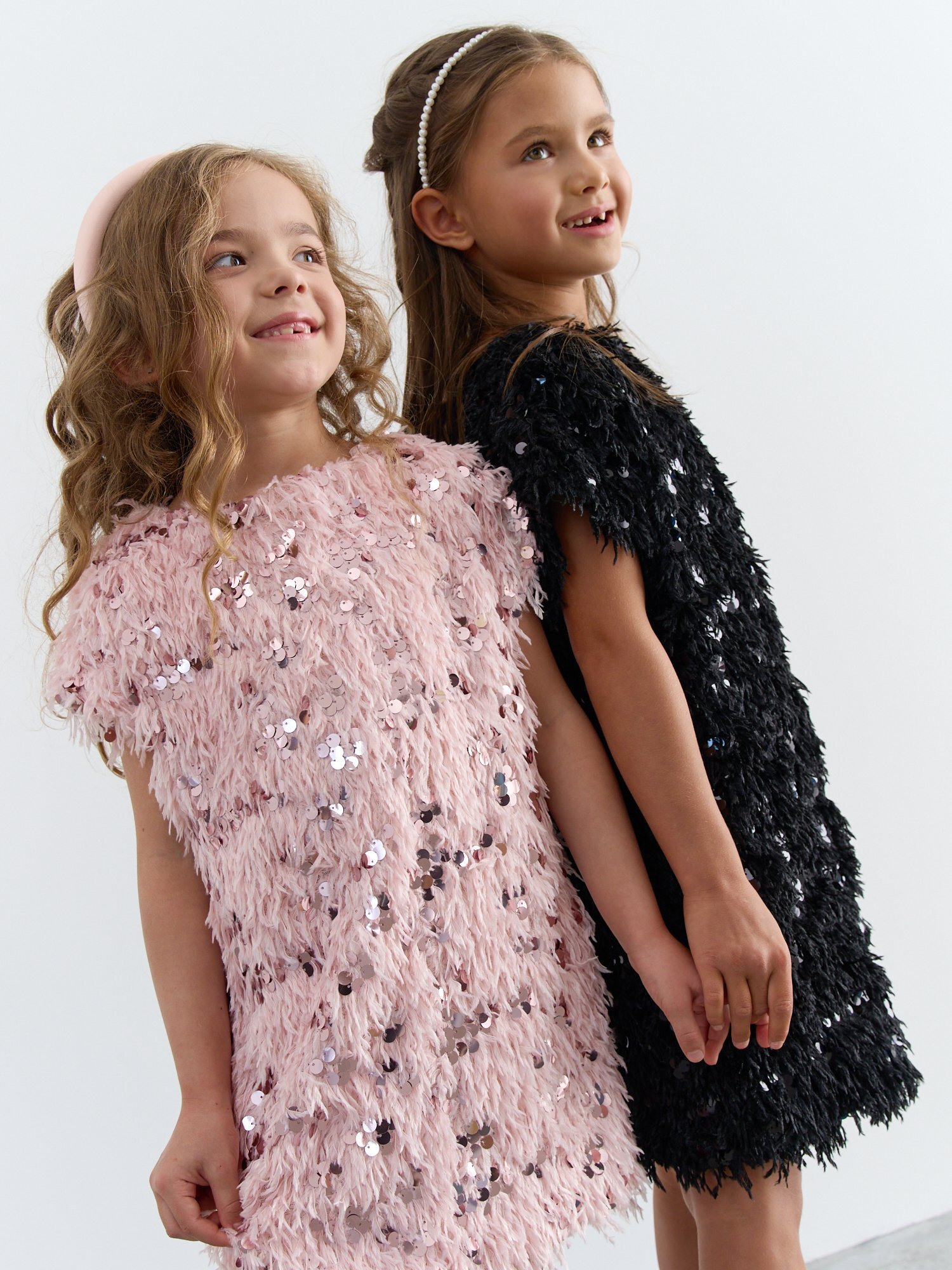 Нарядное платье прямого силуэта, украшенное искусственными перьями.