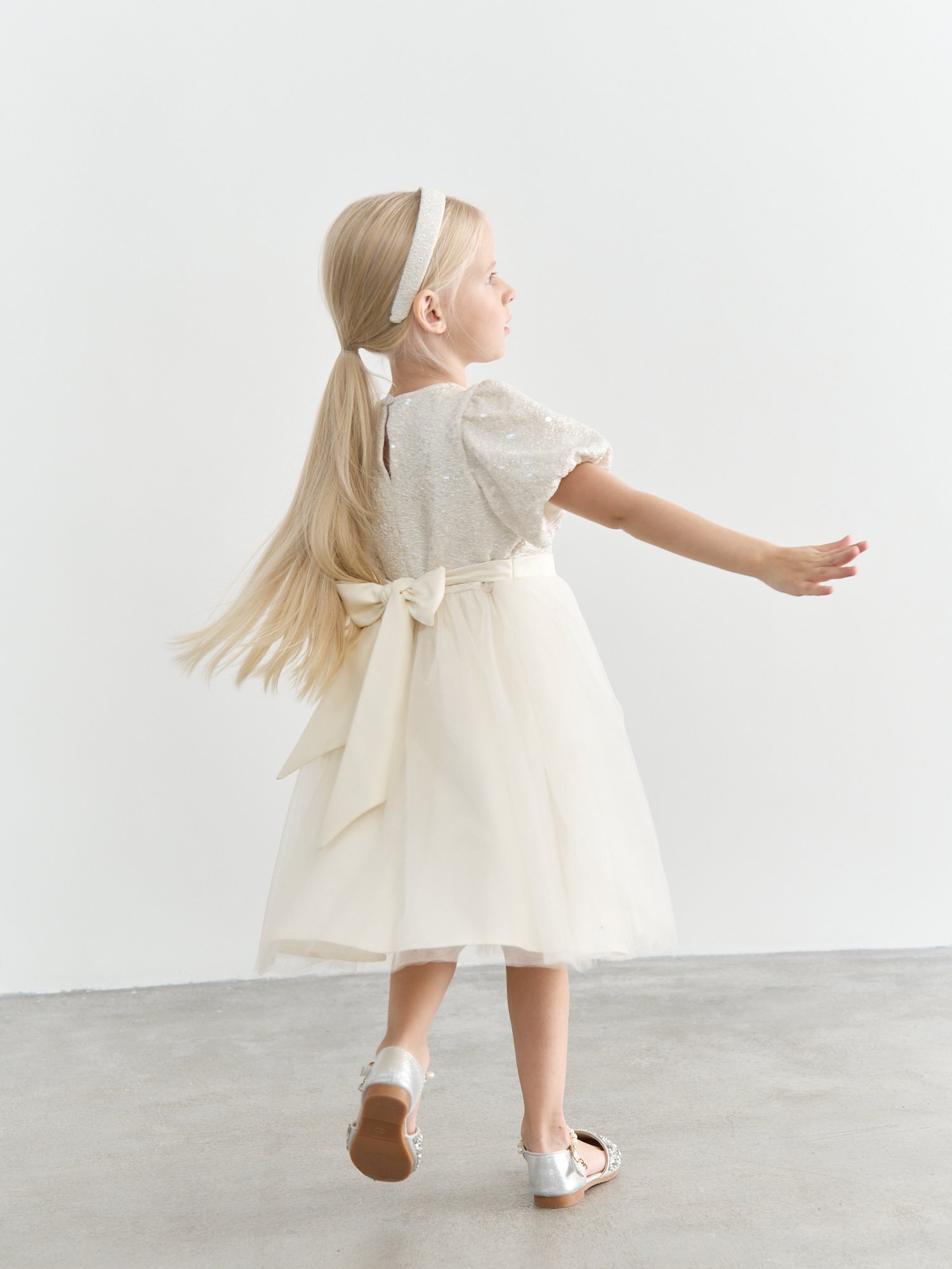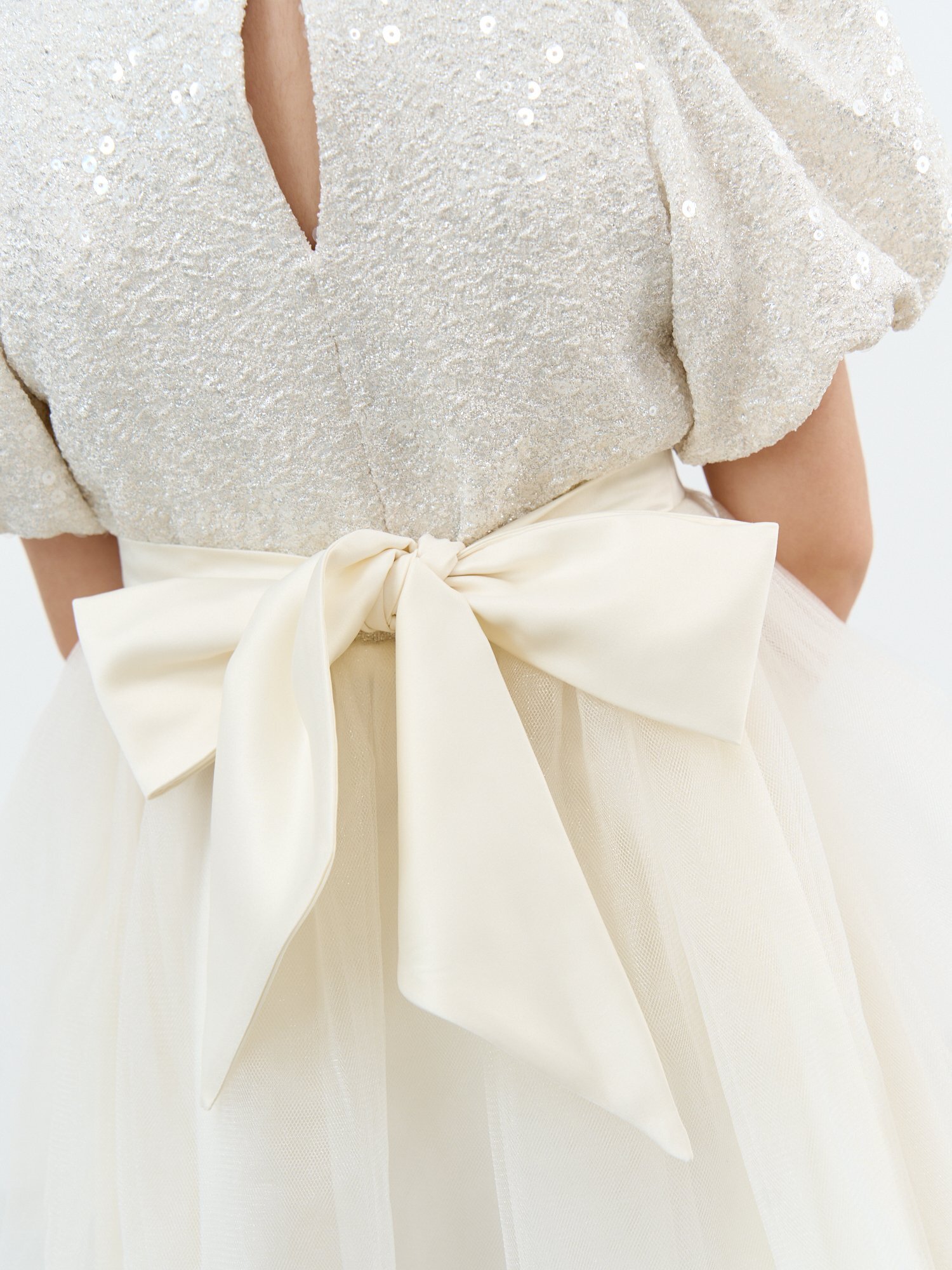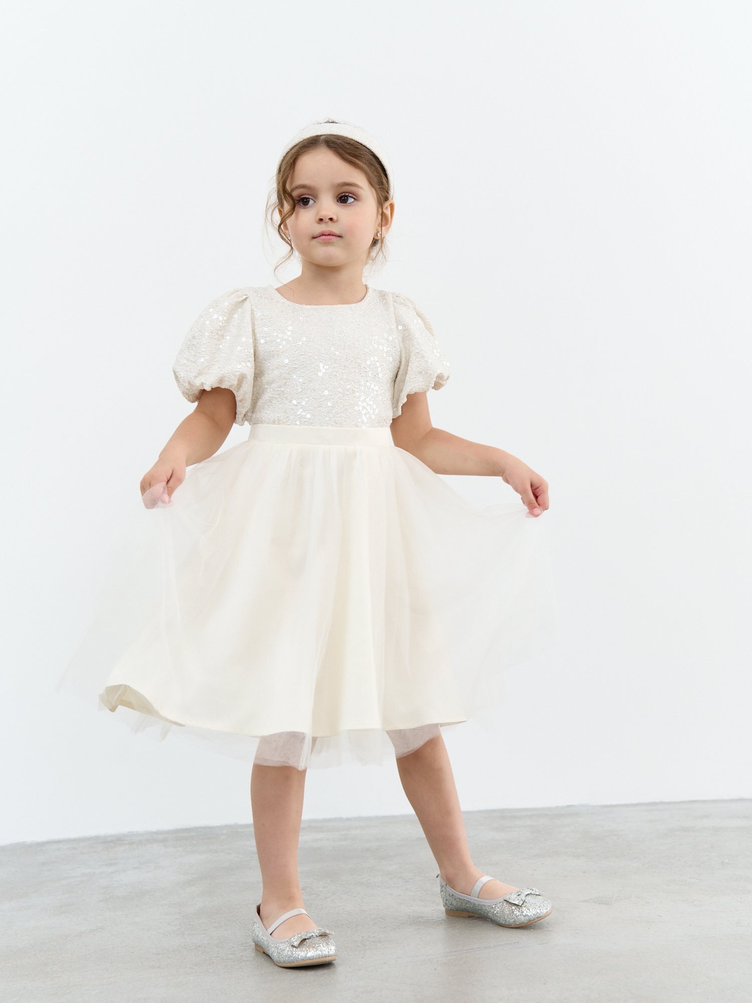 Верх - трикотаж с пайетками, фатин; подкладка – кулирная гладь, атлас
