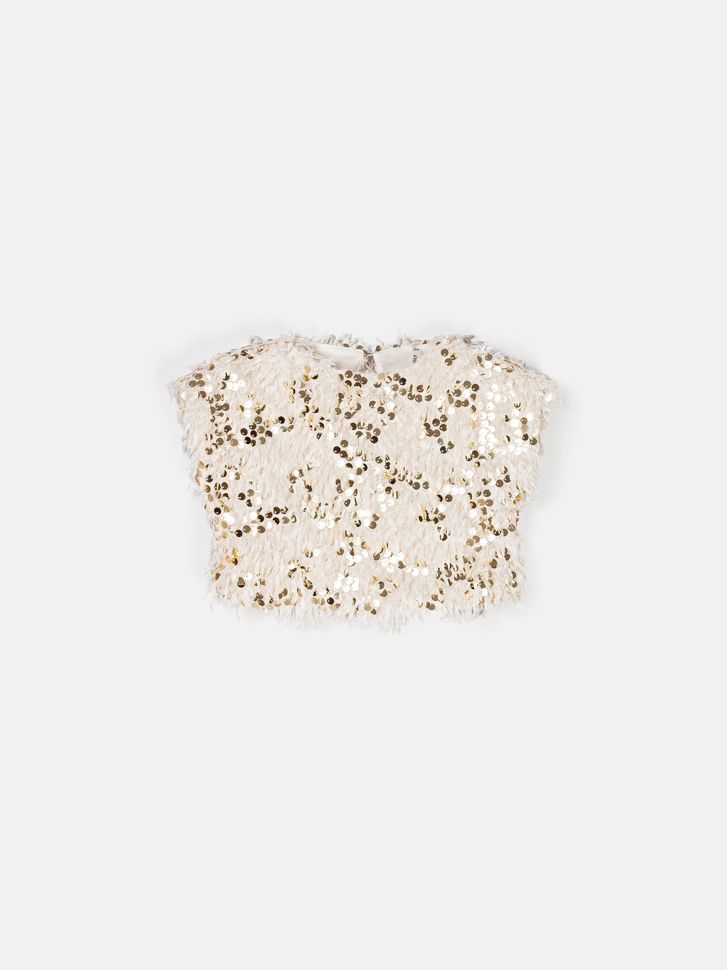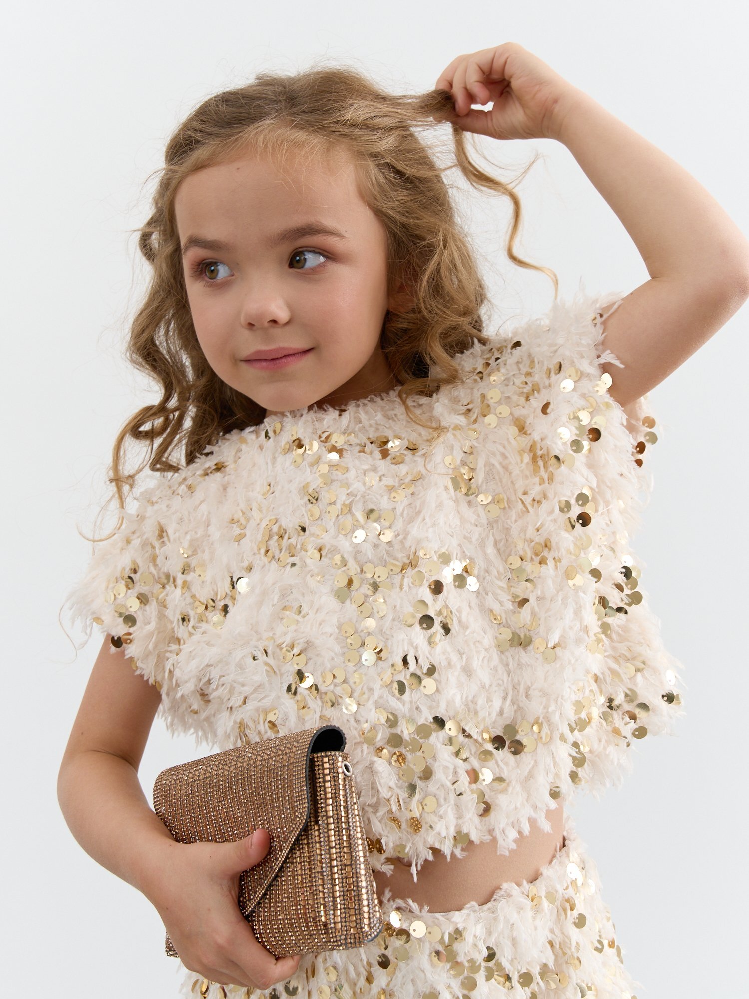 Нарядный топ с искусственными перьями и сверкающими пайетками украсит любой образ.
