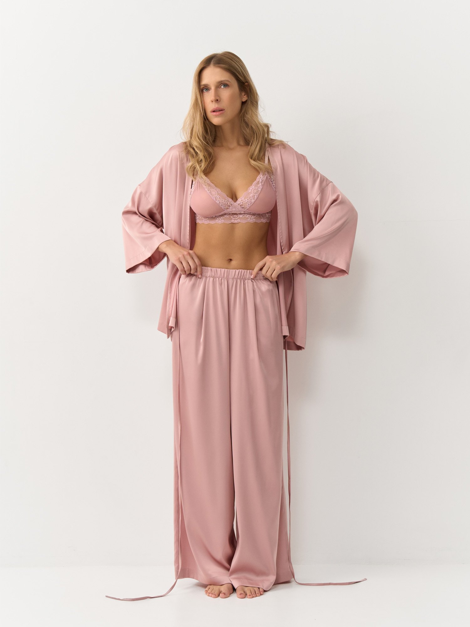 Комплект в пижамном стиле состоит из кимоно и просторных штанов. У кимоно свободный крой с завязкой на пояс, регулируется до комфортного обхвата. Широкие рукава также не стесняют движений. Штаны с мягкой эластичной резинкой по поясу и удобными боковыми карманами. Комплект можно носить не только дома, трендовый пижамный стиль уместен и в отпуске, и на прогулке в теплый сезон. Гладкая шелковая фактура всегда приятна к телу.