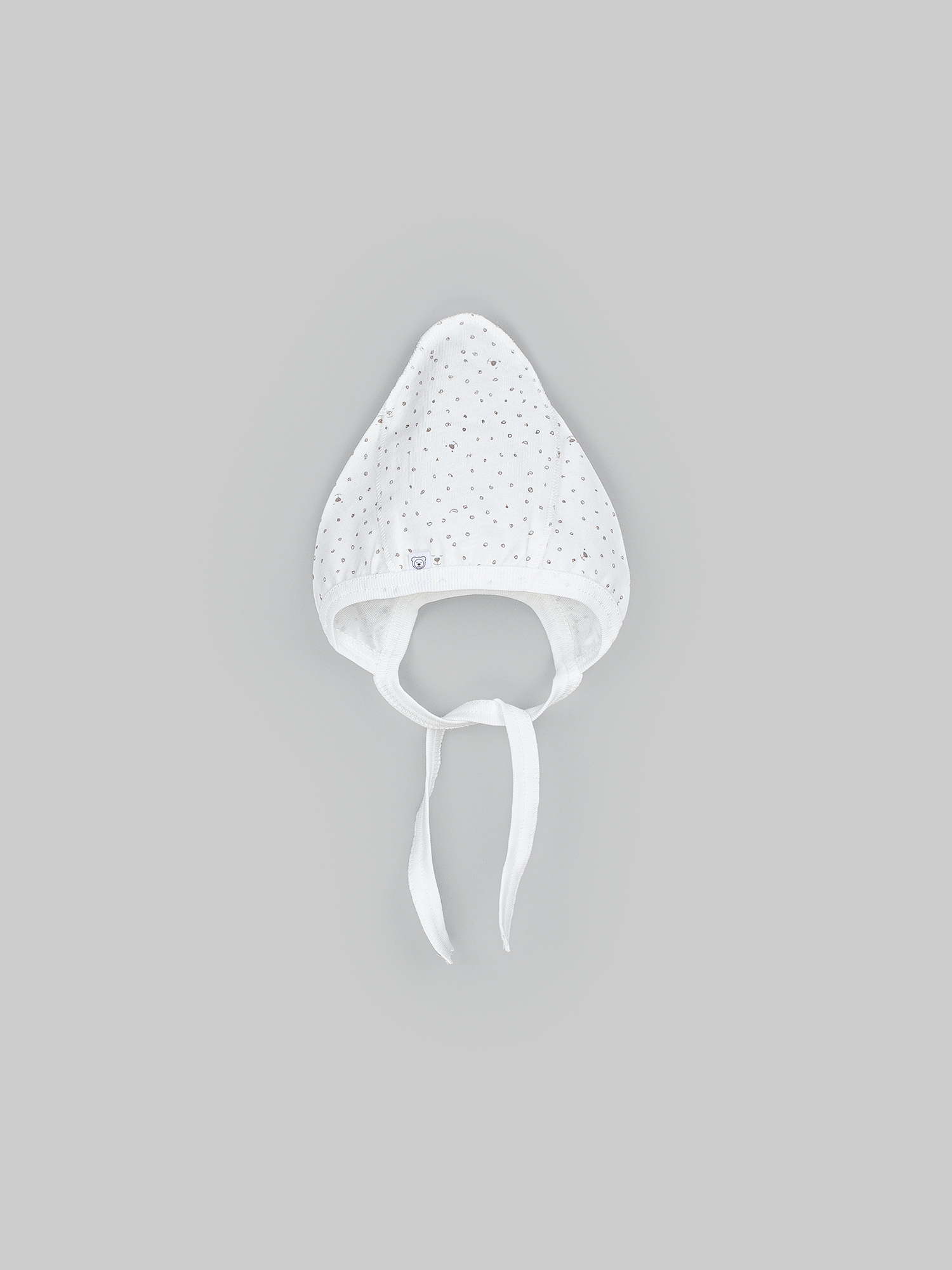 Чепчик с мишками мягко облегает голову и прикрывает ушки, а завязки надежно фиксируют его.