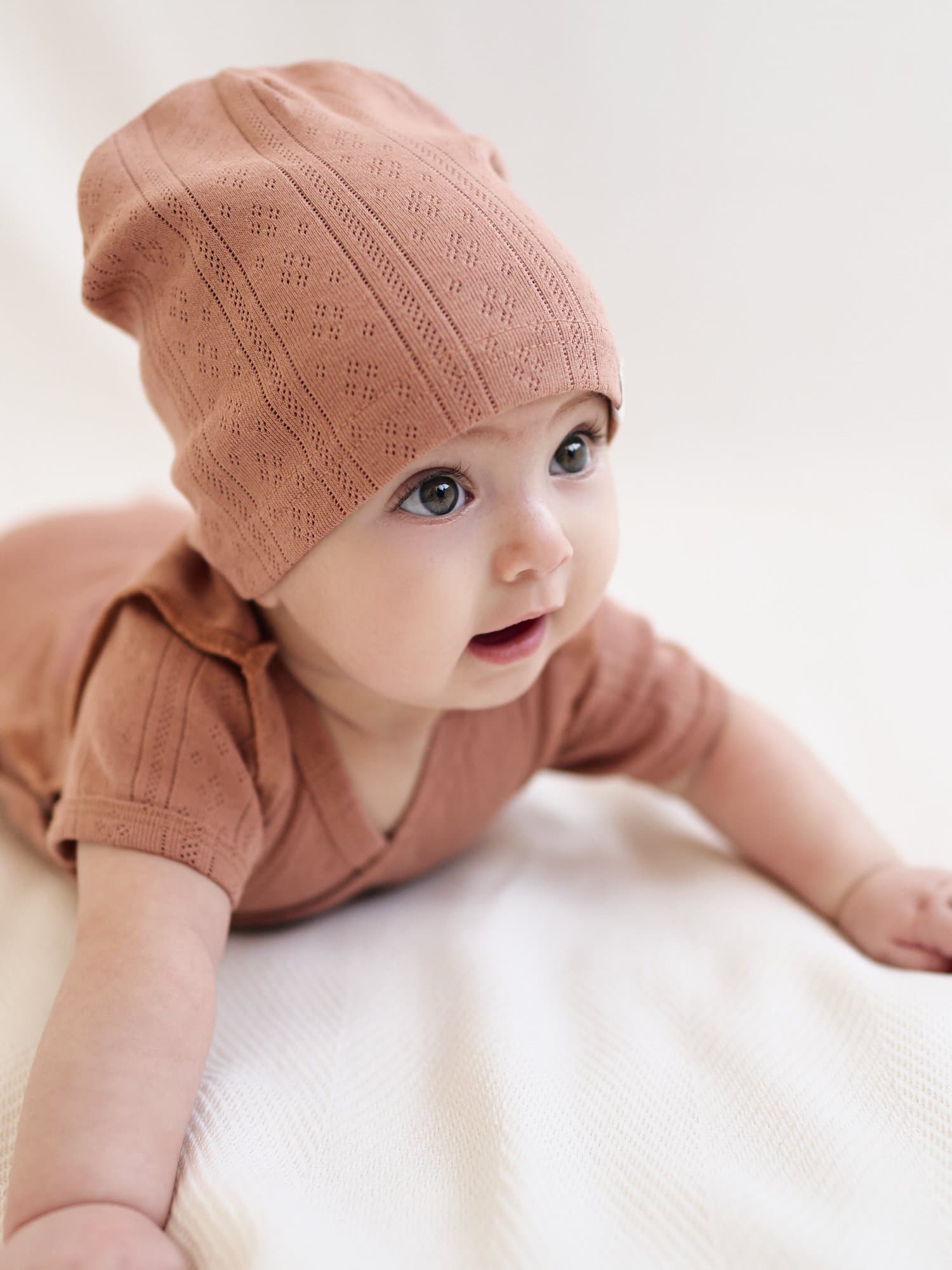 Изящная шапочка защитит голову малыша от прохлады и сквозняков.