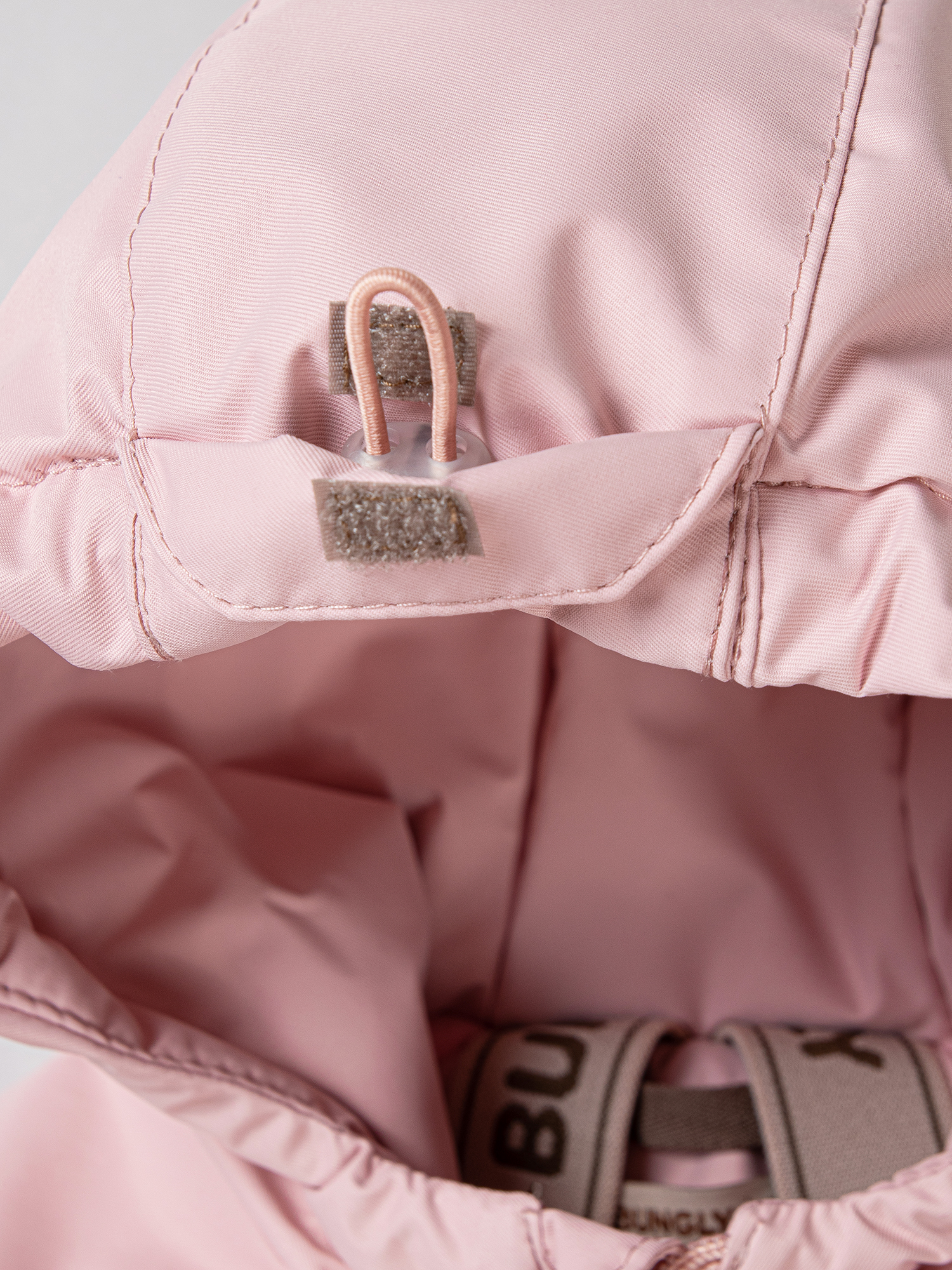 Несъёмный глубокий капюшон с утяжкой на резинку с фиксатором. Фиксатор спрятан под клапаном спереди на капюшоне.