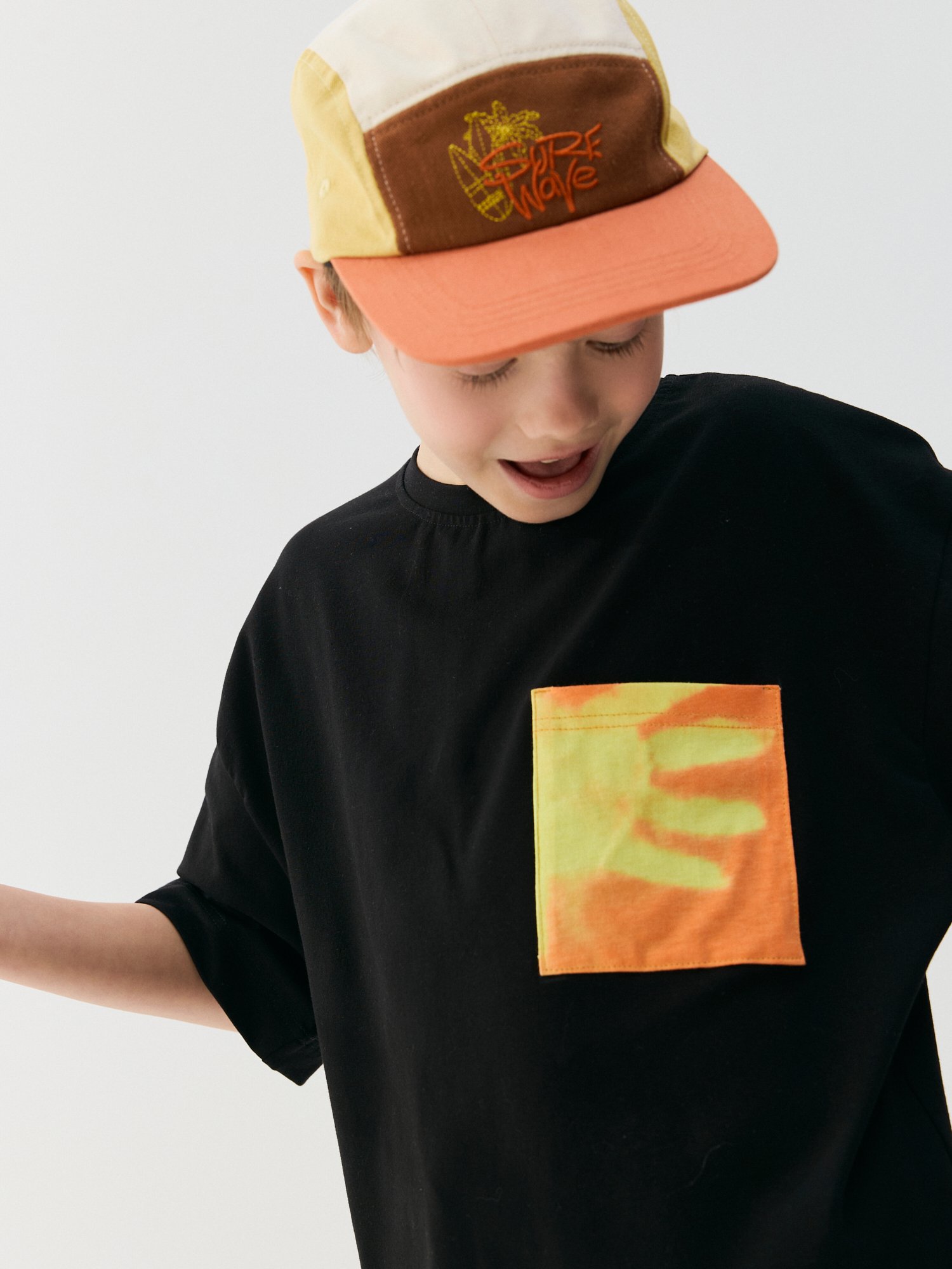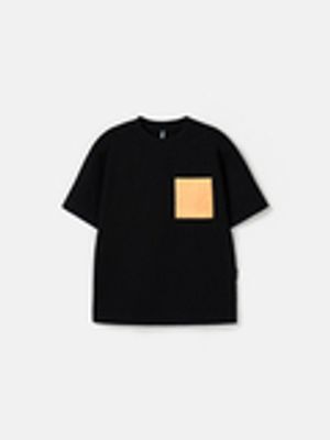 Футболка-оверсайз с ярким акцентным карманом делает образ динамичным.