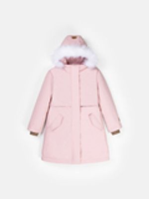 Несъёмный капюшон с пышной опушкой из искусственного меха для дополнительного тепла – мех можно снять, а утяжка на резинку с фиксатором в виде бусины добавляет стильный акцент.
