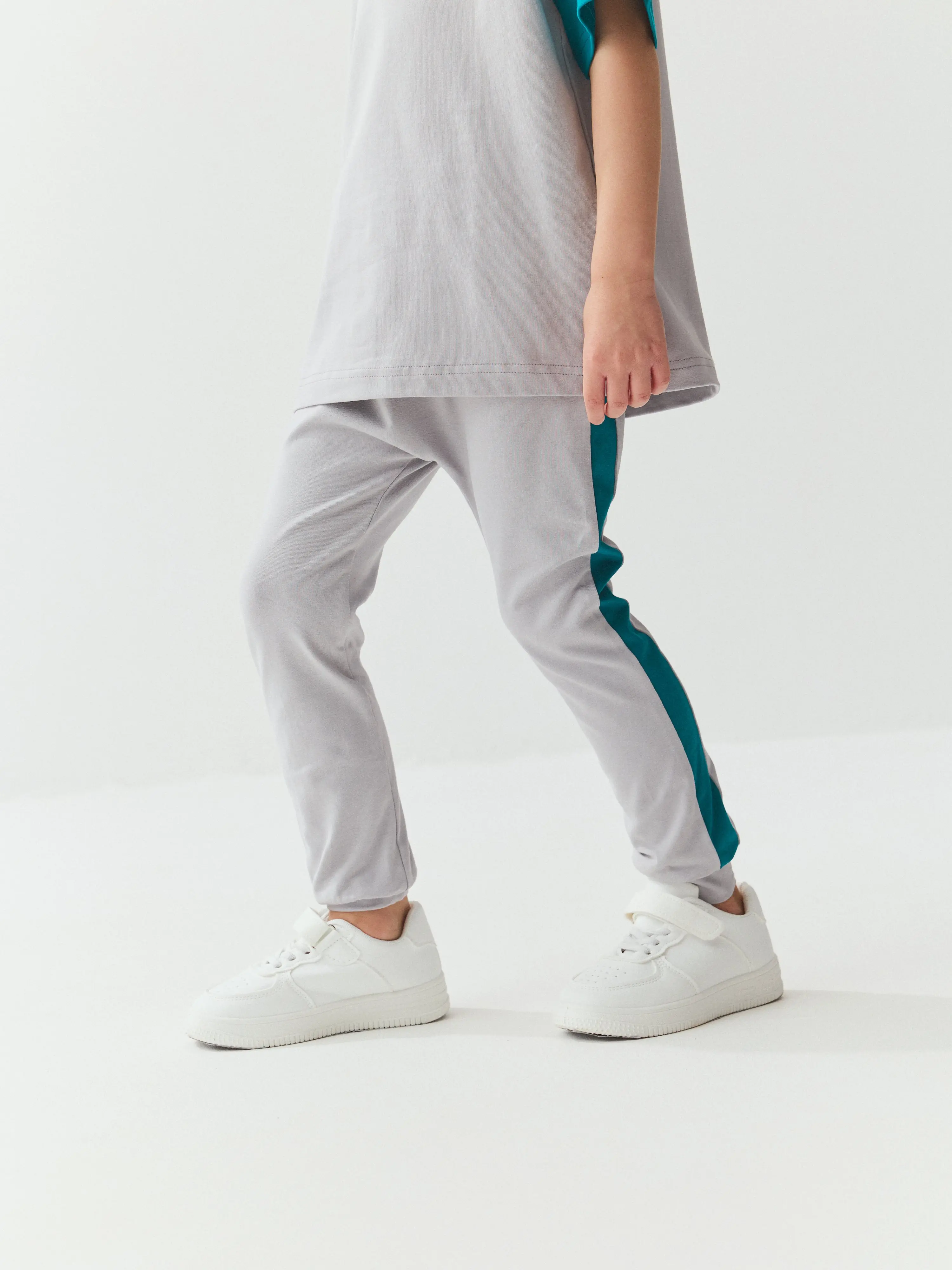 Пояс на резинке мягко фиксируется на талии, а манжеты по низу не дают брюкам задираться даже во время энергичных игр.